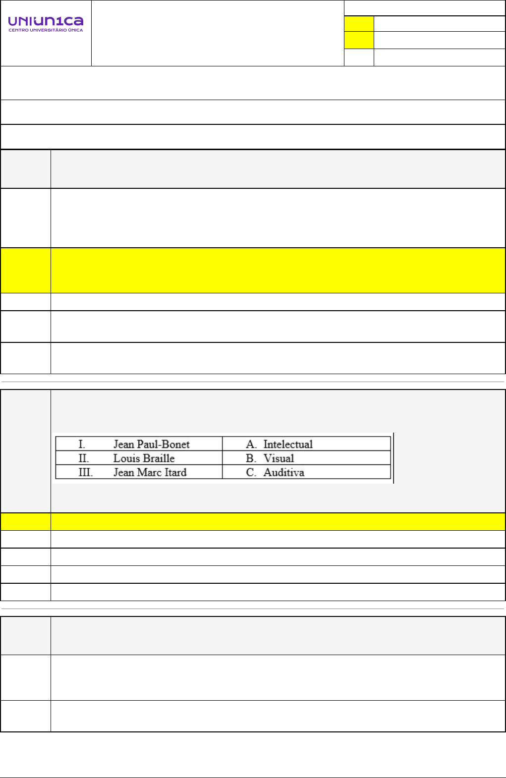Pincel Atômico - 24/11/2024 10:36:38 1/3 STEFANI SOUSA DOMINGOS CARVALHO Exercício Caminho do Conhecimento - Etapa 4 (25267) Atividade finalizada em 03/11/2024 14:55:47 (2983387 / 1) LEGENDA Resposta correta na questão # Resposta correta - Questão Anulada X Resposta selecionada pelo Aluno Disciplina: EDUCAÇÃO ESPECIAL E AS POLÍTICAS EDUCACIONAIS INCLUSIVAS [1137285] - Avaliação com 8 questões, com o peso total de 1,67 pontos [capítulos - 2] Turma: Segunda Graduação: Segunda Graduação 6 Meses - Licenciatura em Educação Especial - Grupo: FPD-JUN/2024 - SGegu0A050624 [127003] Aluno(a): 91624005 - STEFANI SOUSA DOMINGOS CARVALHO - Respondeu 6 questões corretas, obtendo um total de 1,25 pontos como nota [361034_1747 78] Questão 001 A Resolução CNE/CEB n. 4/2009 institui que o Atendimento Educacional Especializado (AEE) tem como função: substituir a formação do aluno em sala de aula comum pela disponibilização, em Salas de Recursos Multifuncionais, de serviços, recursos de acessibilidade e estratégias que eliminem as barreiras para sua plena participação na sociedade e para o desenvolvimento de sua aprendizagem. X complementar ou suplementar a formação do aluno por meio da disponibilização de serviços, recursos de acessibilidade e estratégias que eliminem as barreiras para sua plena participação na sociedade e desenvolvimento de sua aprendizagem. reforçar os conteúdos trabalhados na sala de aula comum. garantir condições de igualdade no acesso ao conhecimento por parte dos alunos com deficiência, transtornos globais do desenvolvimento e altas habilidades/superdotação. promover adaptações curriculares para os alunos com deficiência, transtornos globais do desenvolvimento e altas habilidades/superdotação. [361034_1734 41] Questão 002 Os primeiros “pensadores”, ou seja, autores que contribuíram para as primeiras iniciativas de ensino para as pessoas com deficiência, na sua maioria são europeus e desenvolveram as obras deles desde o século XXVII. Relacione o autor da coluna da esquerda com a obra referente ao tipo de ação desenvolvida por tipo de deficiência na coluna da direita X I – C, II – B, III - A I – B, II - A, III - C I – B, II – C, III – A I – A, II – B, III - C I – A, II – C, III - B [361034_1747 77] Questão 003 (UFSC-2018) 21) De acordo com a Lei n. 13.146/2015 (Lei Brasileira de Inclusão da Pessoa com Deficiência), a pessoa com deficiência é aquela que apresenta: perda ou anormalidade de uma estrutura ou função psicológica, fisiológica ou anatômica que gere incapacidade para o desempenho de atividade, dentro do padrão considerado normal para o ser humano. deficiência física ou mental, ou que se encontra em atraso considerável quanto à idade regular de matrícula. Pincel Atômico - 24/11/2024 10:36:38 2/3 déficit de atenção, hiperatividade, transtornos globais do desenvolvimento ou altas habilidades e dificuldades de aprendizagem, não correspondendo aos padrões de ritmo e aprendizagem referentes à maioria das pessoas da mesma idade. X impedimento de longo prazo de natureza física, mental, intelectual ou sensorial, o qual, em interação com uma ou mais barreiras, pode obstruir sua participação plena e efetiva na sociedade em igualdade de condições com as demais pessoas. limitações de participação na sociedade e de desenvolvimento em função de sua condição orgânica que causem impedimentos permanentes. [361034_1734 40] Questão 004 Procusto era um bandido que vivia numa floresta e ele tinha uma cama grande. Quando ele sequestrava e saqueava as pessoas levava todas até a cama em seu esconderijo. Assim, colocava as mesmas no móvel e, para aquelas que tinha as pernas e braços maior do que a cama, os membros eram cortados e as que tinham tais membros pequenos eram esticados. O excerto retrata um narrativa da mitologia grega e que reflete, em parte, a história das pessoas com deficiência, em razão de: X Sinalizar que ao nascer, se as pessoas não eram identificadas dentro de um padrão, eram sacrificadas ou colocadas à própria sorte. Sinalizar a diferença de gênero entre homens e mulheres. Sinalizar que as medidas eram condições primárias para o mundo do trabalho. Sinalizar aquelas pessoas que iriam ou não ser ensinadas pelos filósofos. Sinalizar que as medidas eram condição necessária para se tornarem soldados infantis. [361035_1734 45] Questão 005 Na década de 1990 surge no Brasil uma legislação de contexto educacional que traz um capítulo dedicado à Educação Especial. Assinale a alternativa que aponta tal legislação corretamente. Lei de Diretrizes e Bases da Educação Nacional Constituição Federal Código de Defesa do Consumir Estatuto da Criança e do Adolescente X Declaração de Salamanca [361035_1734 44] Questão 006 Na época do império brasileiros duas instituições foram criadas para o atendimento a pessoas com deficiência que na atualidade possuem os seguintes nomes: Instituto Benjamim Constant (IBC) e Instituto Nacional de Educação dos Surdos (INES) Com base nesta informação, qual era o nome destas instituições no passado e quais tipos de deficiência eles atendiam? X Imperial Instituto dos Meninos Cegos (visual) e Imperial Instituto dos Surdos-Mudos (auditivo) Imperial Instituto dos Meninos Cegos (visual) e Imperial Instituto dos Surdos-Mudos (física) Imperial Instituto dos Meninos Cegos (física) e Imperial Instituto dos Surdos-Mudos (auditivo) Imperial Instituto dos Meninos Cegos (auditiva) e Imperial Instituto dos Surdos-Mudos (visual) Imperial Instituto dos Meninos Cegos (intelectual) e Imperial Instituto dos Surdos- Mudos (TDAH) Pincel Atômico - 24/11/2024 10:36:38 3/3 [361034_1747 74] Questão 007 (UFSC–2018). Sobre a história da educação especial, indique se as afirmativas abaixo são verdadeiras (V) ou falsas (F) e assinale a alternativa que apresenta a sequência correta. ( ) Atualmente considera-se que o term