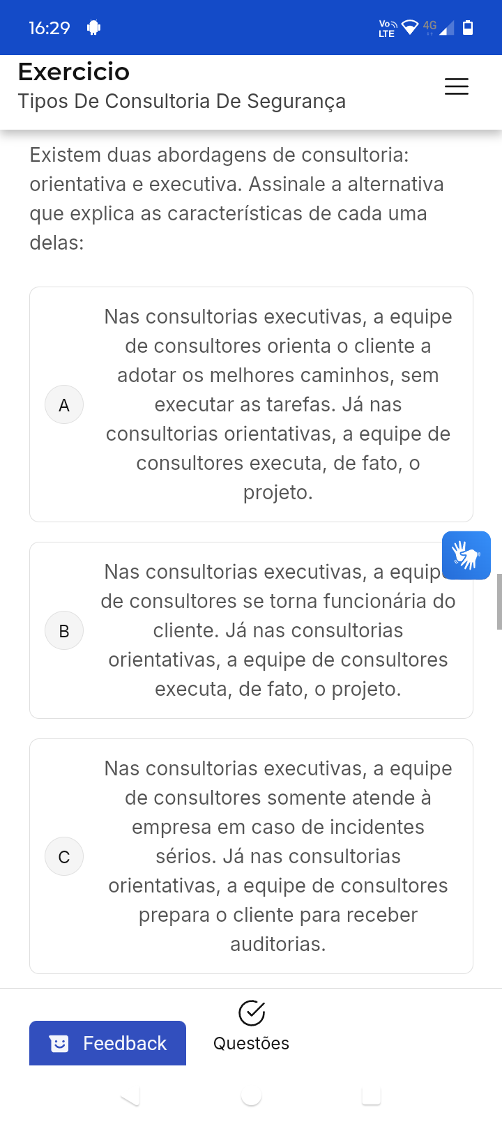 16:29 Vo 4G LTE Exercicio Tipos De Consultoria De Segurança Existem duas abordagens de consultoria: orientativa e executiva. Assinale a alternativa que explica as características de cada uma delas: Nas consultorias executivas, a equipe de consultores orienta o cliente a adotar os melhores caminhos, sem A executar as tarefas. Já nas consultorias orientativas, a equipe de consultores executa, de fato, o projeto. Nas consultorias executivas, a equip de consultores se torna funcionária do B cliente. Já nas consultorias orientativas, a equipe de consultores executa, de fato, o projeto. Nas consultorias executivas, a equipe de consultores somente atende à empresa em caso de incidentes C sérios. Já nas consultorias orientativas, a equipe de consultores prepara o cliente para receber auditorias. Feedback Questões