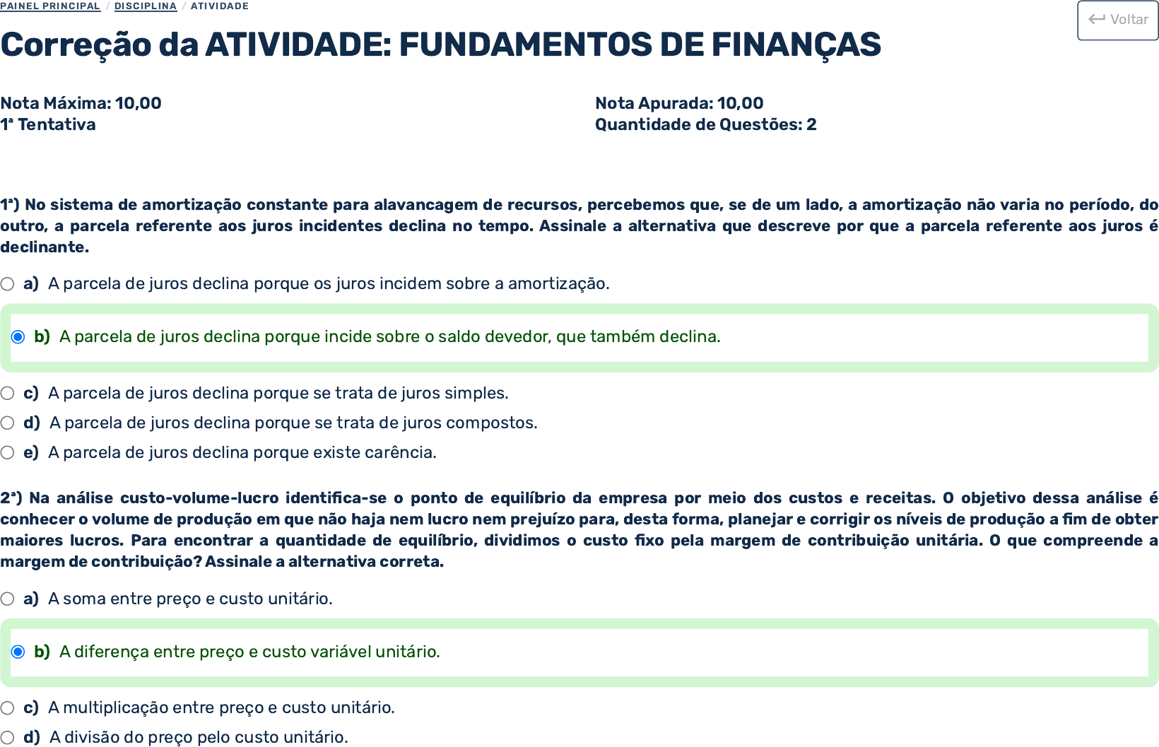 1ª) No sistema de amortização constante para alavancagem de recursos, percebemos que, se de um lado, a amortização não varia no período, do outro, a parcela referente aos juros incidentes declina no tempo. Assinale a alternativa que descreve por que a parcela referente aos juros é declinante. a) A parcela de juros declina porque os juros incidem sobre a amortização. b) A parcela de juros declina porque incide sobre o saldo devedor, que também declina. c) A parcela de juros declina porque se trata de juros simples. d) A parcela de juros declina porque se trata de juros compostos. e) A parcela de juros declina porque existe carência. 2ª) Na análise custo-volume-lucro identi�ca-se o ponto de equilíbrio da empresa por meio dos custos e receitas. O objetivo dessa análise é conhecer o volume de produção em que não haja nem lucro nem prejuízo para, desta forma, planejar e corrigir os níveis de produção a �m de obter maiores lucros. Para encontrar a quantidade de equilíbrio, dividimos o custo �xo pela margem de contribuição unitária. O que compreende a margem de contribuição? Assinale a alternativa correta. a) A soma entre preço e custo unitário. b) A diferença entre preço e custo variável unitário. c) A multiplicação entre preço e custo unitário. d) A divisão do preço pelo custo unitário. PAINEL PRINCIPAL / DISCIPLINA / ATIVIDADE Correção da ATIVIDADE: FUNDAMENTOS DE FINANÇAS Voltar Nota Máxima: 10,00 Nota Apurada: 10,00 1ª Tentativa Quantidade de Questões: 2 https://www.portaleducacionalead.com.br/portal-aluno/painel-principal https://www.portaleducacionalead.com.br/portal-aluno/sala-aula-disciplina.php?disciplina=15789&turma=1060&curso=1316 https://www.portaleducacionalead.com.br/portal-aluno/sala-aula-disciplina.php?disciplina=15789&turma=1060&curso=1316 e) A diferença entre o custo unitário e o custo variável.