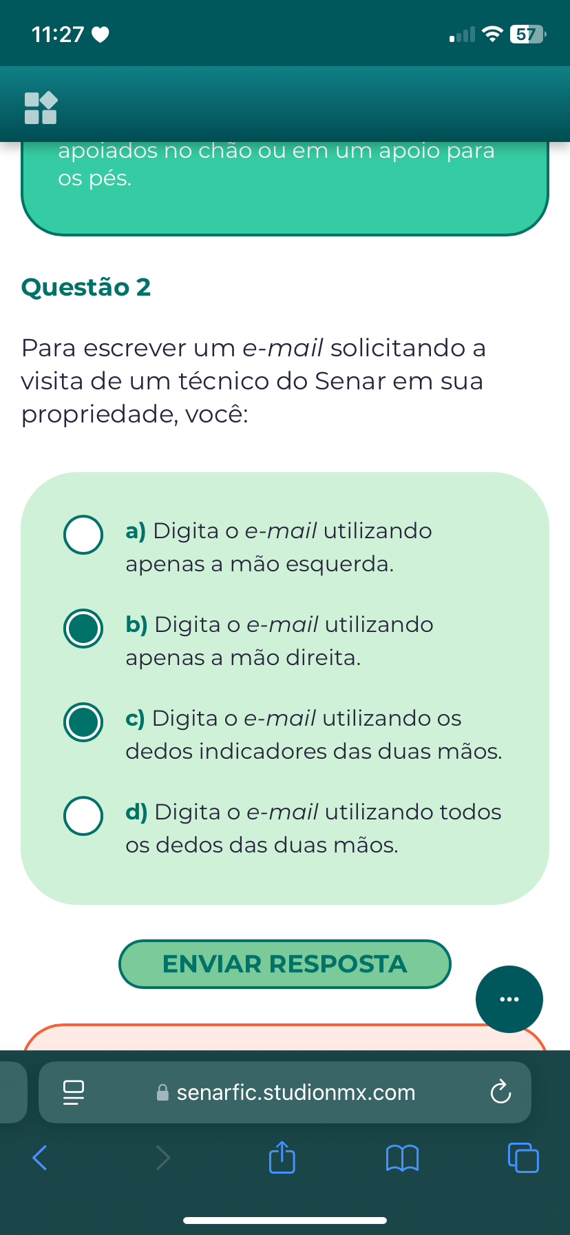 11:27 57 apoiados no chão ou em um apoio para os pés. Questão 2 Para escrever um e-mail solicitando a visita de um técnico do Senar em sua propriedade, você: a) Digita e-mail utilizando apenas a mão esquerda. b) Digita e-mail utilizando apenas a mão direita. c) e-mail utilizando os dedos indicadores das duas mãos. d) Digita e-mail utilizando todos os dedos das duas mãos. ENVIAR RESPOSTA senarfic.studionmx.com &