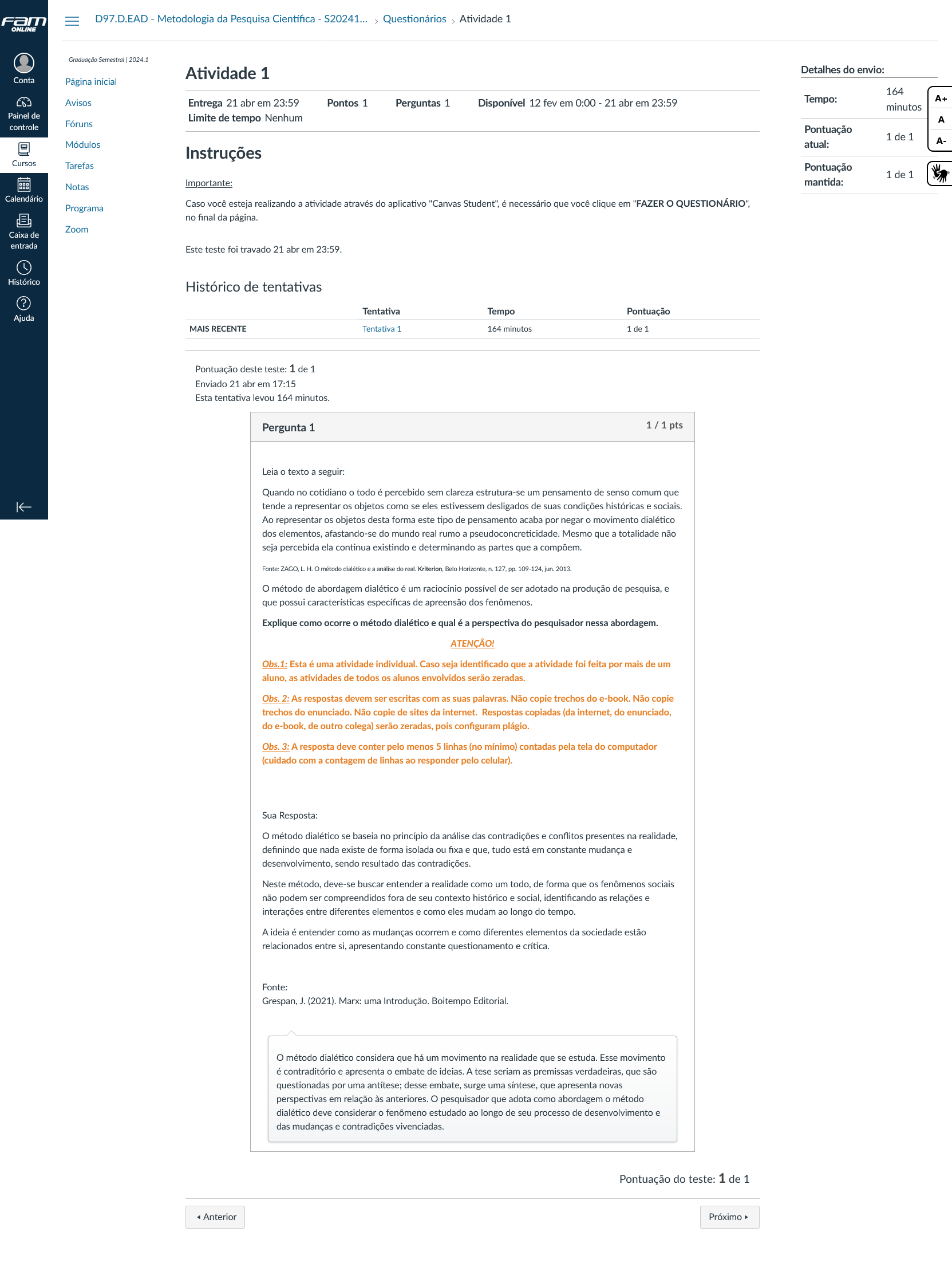 D97.D.EAD Metodologia da Pesquisa Científica S20241. Questionários Atividade 1 ONLINE Graduação Semestral 2024.1 Atividade 1 Detalhes do envio: Conta Página inicial 164 Avisos Entrega 21 abr em 23:59 Pontos 1 Perguntas 1 Tempo: A+ Disponível 12 fev em 0:00 21 abr em 23:59 minutos Painel de Limite de tempo Nenhum A controle Fóruns Pontuação 1 de 1 atual: A- Módulos Instruções Cursos Tarefas Pontuação 1 de 1 Notas Importante: mantida: Calendário Caso você esteja realizando a atividade através do aplicativo "Canvas é necessário que você clique em "FAZER QUESTIONÁRIO", Programa no final da página. Zoom Caixa de entrada Este teste foi travado 21 abr em Histórico Histórico de tentativas Tentativa Tempo Pontuação Ajuda MAIS RECENTE Tentativa 1 164 minutos de 1 Pontuação deste teste: 1 de 1 Enviado 21 abr em 17:15 Esta tentativa levou 164 Pergunta 1 1 pts Leia texto a seguir: Quando no cotidiano o todo é percebido sem clareza estrutura-se um pensamento de senso comum que tende a representar os objetos como se eles estivessem desligados de suas condições históricas e sociais Ao representar os objetos desta forma este tipo de pensamento acaba por negar movimento dialético dos elementos. afastando-se do mundo real rumo a Mesmo que a totalidade não seja percebida ela continua existindo e determinando as partes que a compõem Fonte: ZAGO dialético análise do real Kriterion Belo 127. DD 109-124 jun 2013 método de abordagem dialético é um raciocínio possível de ser adotado na produção de pesquisa, e que possui características específicas de apreensão dos fenômenos Explique como ocorre método dialético e qual é a perspectiva do pesquisador nessa abordagem. Esta é uma atividade Caso seja identificado que a atividade foi feita por mais de um aluno, as atividades de todos os alunos envolvidos serão Obs. 2: As respostas devem ser escritas com as suas palavras. Não copie trechos do e-book. Não copie trechos do enunciado. Não copie de sites da Respostas copiadas (da internet do enunciado. do e-book. de outro colega) serão pois configuram plágio. Obs. 3: A resposta deve conter pelo menos 5 linhas (no mínimo) contadas pela tela do computador (cuidado com a contagem de linhas ao responder pelo celular). Sua Resposta: método dialético se baseia no princípio da análise das contradições e conflitos presentes na realidade definindo que nada existe de forma isolada ou fixa e que, tudo está em constante mudança e sendo resultado das Neste método. deve-se buscar entender a realidade como um todo de forma que os fenômenos sociais não podem ser compreendidos fora de seu contexto histórico e identificando as relações e interações entre diferentes elementos e como eles mudam ao longo do tempo A ideia é entender como as mudanças ocorrem e como diferentes elementos da sociedade estão relacionados entre si apresentando constante questionamento e crítica Fonte: Grespan. J. Marx: uma Boitempo método dialético considera que há um movimento na realidade que se estuda. Esse movimento é contraditório e apresenta embate de ideias A tese seriam as premissas que são questionadas por uma desse surge uma que apresenta novas perspectivas em relação às anteriores. pesquisador que adota como abordagem o método dialético deve considerar fenômeno estudado ao longo de seu processo de desenvolvimento e das mudanças e contradições vivenciadas. Pontuação do teste: 1 de 1 Anterior Próximo