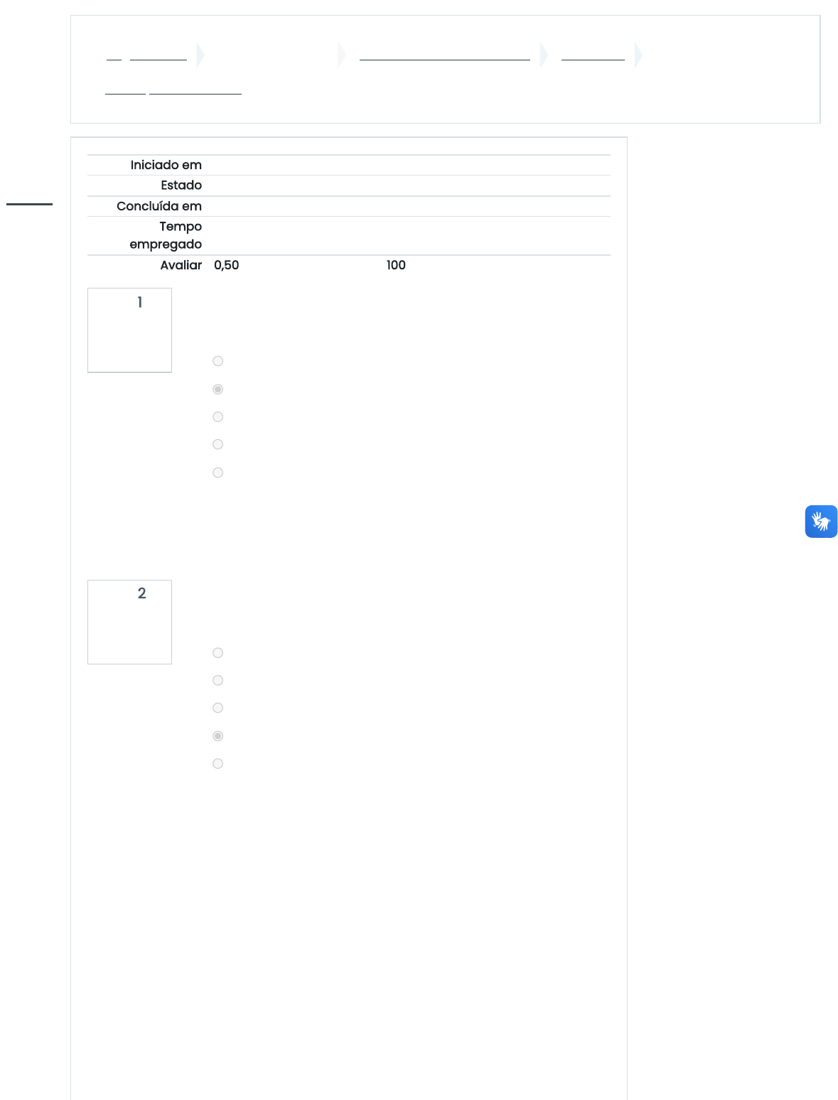 Página inicial Minhas disciplinas 2024/4 - Anatomia Humana UNIDADE III Avaliação - Unidade III Questão 1 Completo Atingiu 0,05 de 0,05 Questão 2 Completo Atingiu 0,05 de 0,05 Iniciado em sexta, 18 out 2024, 15:02 Estado Finalizada Concluída em sexta, 18 out 2024, 15:11 Tempo empregado 9 minutos 23 segundos Avaliar 0,50 de um máximo de 0,50(100%) A laringofaringe ou parte laríngea da faringe possui comunicação direta com a. Cavidade oral e traqueia. b. Laringe e esôfago. c. Esôfago e traqueia. d. Nasofaringe e nariz. e. Esôfago e estômago. A resposta correta é: Laringe e esôfago. As artérias coronárias direita e esquerda são ramos diretos da artéria aorta, responsáveis pelo(a) a. Edema do pericárdio. b. Bombeamento de sangue venoso. c. Drenagem do músculo cardíaco d. Suprimento sanguíneo do coração. e. Irrigação dos tecidos corporais. A resposta correta é: Suprimento sanguíneo do coração. Questão 3 Completo Atingiu 0,05 de 0,05 Questão 4 Completo Atingiu 0,05 de 0,05 Questão 5 Completo Atingiu 0,05 de 0,05 Assinale a alternativa que apresenta a sequência correta do caminho percorrido pelo ar nas vias condutoras durante a inspiração. a. Nariz, cavidade nasal, laringe, faringe, traqueia e brônquios. b. Cavidade nasal, faringe, traqueia, brônquios e pulmões. c. Nariz, cavidade nasal, faringe, laringe, traqueia e brônquios. d. Cavidade nasal, laringe, traqueia, brônquios e pulmões. e. Laringe, nariz, faringe, cavidade nasal, brônquios e traqueia. A resposta correta é: Nariz, cavidade nasal, faringe, laringe, traqueia e brônquios. Considere as características anatômicas da laringe e assinale a afirmativa correta. a. A glândula tireóide é uma saliência longitudinal situada na laringe e configura uma característica no dimorfismo sexual. b. As cartilagens pares da laringe são chamadas de pregas vocais e atuam no processo de fonação. c. A laringe tem forma cilíndrica e ocupa posição anterior no pescoço, ligando o esôfago à traqueia. d. As cartilagens tireóidea, cricóidea e epiglote são consideradas ímpares na laringe. e. A laringe participa da via aérea inferior e está localizada anterior ao estômago. A resposta correta é: As cartilagens tireóidea, cricóidea e epiglote são consideradas ímpares na laringe. Durante a circulação pulmonar, qual vaso sanguíneo conduz o sangue para o pulmão direito? a. Veia cava superior. b. Artéria pulmonar direita. c. Veia pulmonar direita. d. Artéria aorta. e. Veia jugular direita. A resposta correta é: Artéria pulmonar direita. Questão 6 Completo Atingiu 0,05 de 0,05 Questão 7 Completo Atingiu 0,05 de 0,05 Questão 8 Completo Atingiu 0,05 de 0,05 Questão 9 Completo Atingiu 0,05 de 0,05 Hemocaterese ocorre em qual órgão linfático? a. Baço. b. Corpo pineal. c. Pâncreas. d. Tonsila lingual. e. Fígado. A resposta correta é: Baço. O ducto linfático direito recebe a linfa coletada de quais partes do corpo? a. Parte direita superior do corpo. b. Parte inferior direita do corpo. c. Membros superiores e inferiores. d. Pé direito e braço direito. e. Tórax e abdome. A resposta correta é: Parte direita superior do corpo. O ducto nasolacrimal se abre no(a) a. Meato acústico externo. b. Vestíbulo nasal. c. Meato nasal inferior. d. Meato nasal superior. e. Concha nasal média. A resposta correta é: Meato nasal inferior. O vestíbulo nasal representa uma a. abertura medial nas fossas nasais responsável pela purificação do ar. b. parte piramidal situada entre as conchas nasais. c. porção dilatada e anterior da cavidade nasal. d. região de comunicação entre a boca e o nariz. e. porção dilatada da faringe que conduz o ar diretamente para a nasofaringe. A resposta correta é: porção dilatada e anterior da cavidade nasal. Questão 10 Completo Atingiu 0,05 de 0,05 Sobre a inervação do coração, leia as afirmativas: I. Os elementos simpático e parassimpático do sistema nervoso autônomo auxiliam no controle da frequência cardíaca e são considerados elementos da inervação extrínseca do coração. II. Filamentos de músculo liso do coração são capazes de auto estimulação dos átrios e ventrículos. III. Fibras do endocárdio formam o marcapasso natural do coração.Pode-se afirmar que: a. III está correta. b. II está correta. c. I e II estão corretas. d. I, II e III estão corretas. e. I está correta. A resposta correta é: I está correta. Atividade anterior ◄ Slides Videoaula 2 Seguir para... Próxima atividade Videoaula 1 ► Manter contato UNINGÁ https://www.uninga.br Mobile : 0800 800 5009 Baixar o aplicativo móvel.