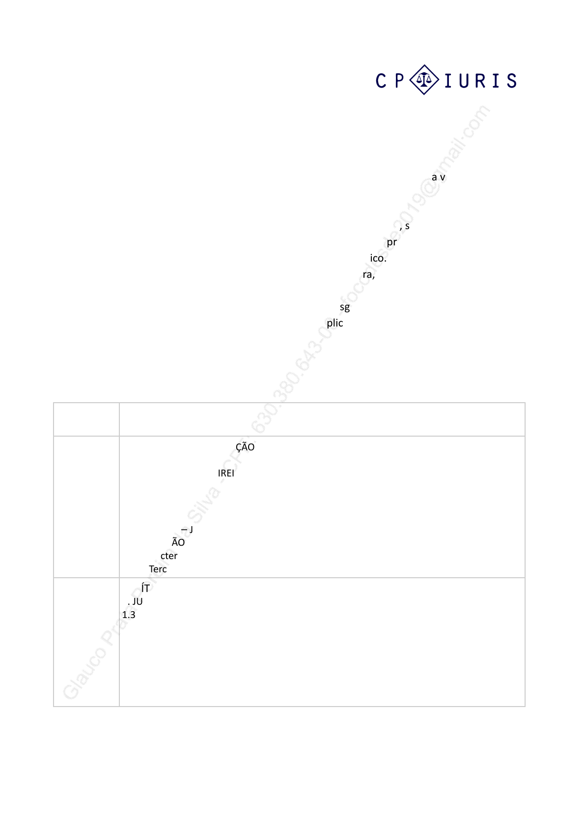 ROTEIRO DE LEITURA – DIREITO PROCESSUAL CIVIL Prezado(a) leitor(a), Nós da equipe Editora CP Iuris agradecemos a preferência e desejamos a você uma ótima leitura! Abaixo segue o cronograma de leitura do ebook. Pensamos em uma leitura de 1h30min por dia por e-book. Assim, se você possuir 3 horas por dia para leitura, por exemplo, sugerimos que concilie a leitura do presente ebook com a leitura de outro. Isso tornará seu estudo menos enfadonho e mais dinâmico. Caso possua tempo superior a 03 horas por dia para leitura, intensifique a leitura de um dos ebooks escolhidos. Abaixo, estão os números de dias necessários para esgotamento da presente obra, seguindo este cronograma, observando os temas aqui explicitados. Conte conosco! Atenciosamente, Equipe Editora CP Iuris. Dia Disciplina 1 CAPÍTULO 1 – INTRODUÇÃO AO DIREITO PROCESSUAL CIVIL E NORMAS FUNDAMENTAIS DO PROCESSO CIVIL 1. INTRODUÇÃO AO DIREITO PROCESSUAL CIVIL Ao CAPÍTULO 2 – JURISDIÇÃO E COMPETÊNCIA 1. JURISDIÇÃO 1.2. Características da jurisdição 1.2.7. Terceiro imparcial 2 CAPÍTULO 2 – JURISDIÇÃO E COMPETÊNCIA JURISDIÇÃO E COMPETÊNCIA 1. JURISDIÇÃO 1.3. Princípios da jurisdição Ao CAPÍTULO 2 – JURISDIÇÃO E COMPETÊNCIA JURISDIÇÃO E COMPETÊNCIA 2. COMPETÊNCIA 2.9. Conflito de competência G la uc o P ra ta P er ei ra d a S ilv a - C P F : 6 30 .3 80 .6 43 -0 0 - fo co de sd e2 01 9@ gm ai l·c om G la uc o P ra ta P er ei ra d a S ilv a - C P F : 6 30 .3 80 .6 43 -0 0 - fo co de sd e2 01 9@ gm ai l·c om 3 CAPÍTULO 3 – AÇÃO 1. AÇÃO Ao CAPÍTULO 5 – SUJEITOS PROCESSUAIS 3. DEFENSORIA PÚBLICA 3.4. Responsabilidade Civil 4 CAPÍTULO 6 – LITISCONSÓRCIO 1. LITISCONSÓRCIO Ao CAPÍTULO 8 – TUTELA PROVISÓRIA COMENTÁRIOS DAS QUESTÕES 5 CAPÍTULO 9 – ATOS E NEGÓCIOS JURÍDICOS PROCESSUAIS 1. ATOS E NEGÓCIOS PROCESSUAIS Ao CAPÍTULO 10 – PROCESSO DE CONHECIMENTO 2. PETIÇÃO INICIAL 2.1.8. Forma da petição inicia 6 CAPÍTULO 10 – PROCESSO DE CONHECIMENTO 2. PETIÇÃO INICIAL 2.2. Propositura da ação e seu juízo inicial Ao CAPÍTULO 10 – PROCESSO DE CONHECIMENTO 7. PROVIDÊNCIAS PRELIMINARES 7.4. Saneamento do processo 7 CAPÍTULO 11 – PROVAS 1. PROVAS Ao CAPÍTULO 12 – SENTENÇA 5. ASSINATURA G la uc o P ra ta P er ei ra d a S ilv a - C P F : 6 30 .3 80 .6 43 -0 0 - fo co de sd e2 01 9@ gm ai l·c om G la uc o P ra ta P er ei ra d a S ilv a - C P F : 6 30 .3 80 .6 43 -0 0 - fo co de sd e2 01 9@ gm ai l·c om 8 CAPÍTULO 12 – SENTENÇA 6.FIXAÇÃO DA SUCUMBÊNCIA: HONORÁRIOS E CUSTAS Ao CAPÍTULO 12 – SENTENÇA 12. INFORMATIVOS DE JURISPRUDÊNCIA 12.6. Sentença e coisa julgada 9 CAPÍTULO 13 – LIQUIDAÇÃO DE SENTENÇA 1. LIQUIDAÇÃO Ao CAPÍTULO 14 – PROCESSO DE EXECUÇÃO 3. PRINCÍPIOS DA EXECUÇÃO 3.5. Princípio do desfecho único 10 CAPÍTULO 14 – PROCESSO DE EXECUÇÃO 4. CONCENTRAÇÃO DOS PODERES DE EXECUÇÃO DO JUIZ Ao CAPÍTULO 15 – DIVERSAS ESPÉCIES DE EXECUÇÃO 2. DISPOSIÇÕES GERAIS PERTINENTES ÀS DIVERSAS ESPÉCIES DE EXECUÇÃO 2.8. Nulidade da execução 11 CAPÍTULO 15 – DIVERSAS ESPÉCIES DE EXECUÇÃO 3. EXECUÇÃO PARA ENTREGA DE COISA CERTA Ao CAPÍTULO 15 – DIVERSAS ESPÉCIES DE EXECUÇÃO 11. EXPROPRIAÇÃO 11.3. Pagamento ao credor 12 CAPÍTULO 15 – DIVERSAS ESPÉCIES DE EXECUÇÃO 12. EXECUÇÃO CONTRA A FAZENDA PÚBLICA Ao CAPÍTULO 16 – PROCEDIMENTOS ESPECIAIS DE JURISDIÇÃO CONTENCIOSA E VOLUNTÁRIA 1. PROCEDIMENTOS ESPECIAIS DE JURISDIÇÃO CONTENCIOSA 1.4. Ação de divisão e de demarcação de terras particulares 1.4.3. Ação divisória G la uc o P ra ta P er ei ra d a S ilv a - C P F : 6 30 .3 80 .6 43 -0 0 - fo co de sd e2 01 9@ gm ai l·c om G la uc o P ra ta P er ei ra d a S ilv a - C P F : 6 30 .3 80 .6 43 -0 0 - fo co de sd e2 01 9@ gm ai l·c om 13 CAPÍTULO 16 – PROCEDIMENTOS ESPECIAIS DE JURISDIÇÃO CONTENCIOSA E VOLUNTÁRIA 1. PROCEDIMENTOS ESPECIAIS DE JURISDIÇÃO CONTENCIOSA 1.5. Ação de dissolução parcial de sociedade Ao CAPÍTULO 16 – PROCEDIMENTOS ESPECIAIS DE JURISDIÇÃO CONTENCIOSA E VOLUNTÁRIA 1. PROCEDIMENTOS ESPECIAIS DE JURISDIÇÃO CONTENCIOSA 1.14. Homologação de penhor legal 14 CAPÍTULO 16 – PROCEDIMENTOS ESPECIAIS DE JURISDIÇÃO CONTENCIOSA E VOLUNTÁRIA 2. PROCEDIMENTOS ESPECIAIS DE JURISDIÇÃO VOLUNTÁRIA 2.1. Considerações iniciais Ao CAPÍTULO 17: PROCESSOS NOS TRIBUNAIS E MEIOS DE IMPUGNAÇÃO DAS DECISÕES JUDICIAIS 5. EFEITOS DOS RECURSOS 5.1. Efeito suspensivo e efeito ativo 15 CAPÍTULO 17: PROCESSOS NOS TRIBUNAIS E MEIOS DE IMPUGNAÇÃO DAS DECISÕES JUDICIAIS 5. EFEITOS DOS RECURSOS 5.2. Efeito devolutivo Ao CAPÍTULO 17: PROCESSOS NOS TRIBUNAIS E MEIOS DE IMPUGNAÇÃO DAS DECISÕES JUDICIAIS 8. RECURSOS EM ESPÉCIE 8.6. EMBARGOS DE DECLARAÇÃO 8.6.5. Reiteração de embargos de declaração e multas 16 CAPÍTULO 17: PROCESSOS NOS TRIBUNAIS E MEIOS DE IMPUGNAÇÃO DAS DECISÕES JUDICIAIS 8. RECURSOS EM ESPÉCIE 8.7. Recurso especial, recurso extraordinário e seus respectivos agravos denegatórios Ao CAPÍTULO 17: PROCESSOS NOS TRIBUNAIS E MEIOS DE IMPUGNAÇÃO DAS DECISÕES JUDICIAIS 10. AÇÕES AUTÔNOMAS DE IMPUGNAÇÃO E INCIDENTES NOS TRIBUNAIS 10.1. Ação rescisória 10.1.2. Hipóteses de cabimento – decisões de mérito h) Erro de fato verificável do exame dos autor (art. 966, VIII e § 1º, CPC) G la uc o P ra ta P er ei ra d a S ilv a - C P F : 6 30 .3 80 .6 43 -0 0 - fo co de sd e2 01 9@ gm ai l·c om G la uc o P ra ta P er ei ra d a S ilv a - C P F : 6 30 .3 80 .6 43 -0 0 - fo co de sd e2 01 9@ gm ai l·c om 17 CAPÍTULO 17: PROCESSOS NOS TRIBUNAIS E MEIOS DE IMPUGNAÇÃO DAS DECISÕES JUDICIAIS 10. AÇÕES AUTÔNOMAS DE IMPUGNAÇÃO E INCIDENTES NOS TRIBUNAIS 10.1. Ação rescisória 10.1.3. Hipóteses de cabimento – decisões sem resolução de mérito Ao CAPÍTULO 18: PROCESSO COLETIVO 8. COISA JULGADA 18 Leitura remanescente do E-book de Direito Civil É possível passar seu ebook para o kindle, basta seguir os seg