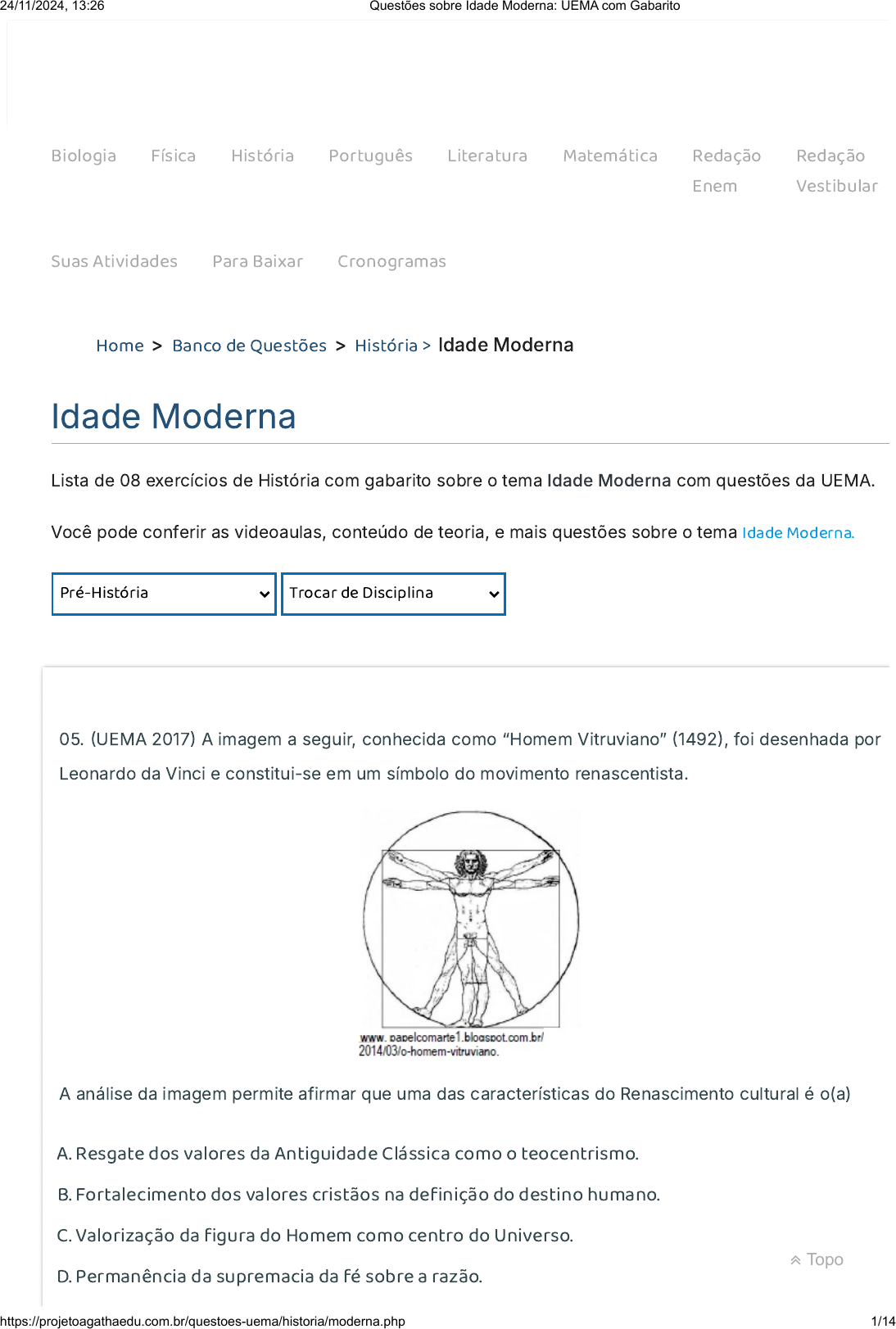 Biologia Física História Português Literatura Matemática Redação Enem Redação Vestibular Suas Atividades Para Baixar Cronogramas Home > Banco de Questões > História > Idade Moderna Idade Moderna Lista de 08 exercícios de História com gabarito sobre o tema Idade Moderna com questões da UEMA. Você pode conferir as videoaulas, conteúdo de teoria, e mais questões sobre o tema Idade Moderna. Pré-História Trocar de Disciplina 05. �UEMA 2017� A imagem a seguir, conhecida como “Homem Vitruviano” �1492�, foi desenhada por Leonardo da Vinci e constitui-se em um símbolo do movimento renascentista. A análise da imagem permite afirmar que uma das características do Renascimento cultural é o(a) A. Resgate dos valores da Antiguidade Clássica como o teocentrismo. B. Fortalecimento dos valores cristãos na de�nição do destino humano. C. Valorização da �gura do Homem como centro do Universo. D. Permanência da supremacia da fé sobre a razão. Topo 24/11/2024, 13:26 Questões sobre Idade Moderna: UEMA com Gabarito https://projetoagathaedu.com.br/questoes-uema/historia/moderna.php 1/14 https://projetoagathaedu.com.br/ https://projetoagathaedu.com.br/ https://projetoagathaedu.com.br/blog/biologia.php https://projetoagathaedu.com.br/blog/fisica.php https://projetoagathaedu.com.br/blog/historia.php https://projetoagathaedu.com.br/blog/linguagens.php https://projetoagathaedu.com.br/blog/literatura.php https://projetoagathaedu.com.br/blog/matematica.php https://projetoagatharedacao.com.br/guia-de-redacao-enem.php https://projetoagatharedacao.com.br/guia-de-redacao-enem.php https://projetoagatharedacao.com.br/guia-de-redacao-vestibular.php https://projetoagatharedacao.com.br/guia-de-redacao-vestibular.php https://projetoagathaedu.com.br/app/ https://projetoagathaedu.com.br/app/material.php https://projetoagathaedu.com.br/cronogramas-de-estudo.php https://projetoagathaedu.com.br/ https://projetoagathaedu.com.br/banco-de-questoes.php https://projetoagathaedu.com.br/banco-de-questoes/historia.php https://projetoagathaedu.com.br/app/disciplinas/historia.php https://projetoagathaedu.com.br/questoes-uema/historia/moderna.php E. Supremacia da Teologia sobre o Humanismo. 02. �UEMA 2014� “Os carneiros, antes animais tão delicados e inofensivos, tornaram-se devoradores de homens.” Fonte: MORUS, Thomas. A Utopia. Tradução: Paulo Neves. Porto Alegre: L&PM Editores, 1ª Ed. 1997. A frase de Morus faz alusão a um dos principais fatores que antecedeu a Revolução Industrial, conhecido como A. As doenças provocadas pelas condições de trabalho. B. O surgimento da propriedade privada. C. O cercamento dos campos. D. O nascimento da classe operária. E. A separação entre capital e trabalho. 03. �UEMA 2013� O cumprimento do nosso destino manifesto se espalhou pelo continente atribuído pela Providência Divina para o livre desenvolvimento dos nossos milhões [de habitantes] recentemente multiplicados. O‘SULLIVAN, J. L. Annexation. United States Magazine and Democratic Review, jul/ago. 1845. (traduzido.) O texto, de autoria do jornalista estadunidense John L. O‘Sullivan, foi elaborado num momento da história de seu país, caracterizado pelo(a) A. Expansão territorial em direção ao oeste. B. Reconstrução após a Guerra da Secessão. C. Hegemonia política no continente americano. D. Envolvimento da Guerra Hispano-Americana. E. Combate ao racismo nas fronteiras da expansão. Topo 24/11/2024, 13:26 Questões sobre Idade Moderna: UEMA com Gabarito https://projetoagathaedu.com.br/questoes-uema/historia/moderna.php 2/14 https://projetoagathaedu.com.br/questoes-uema/historia/moderna.php 04. �UEMA 2012� Das alternativas abaixo, marque aquela que apresenta o sentido de cultura elaborado pelos humanistas no Renascimento do século XVI. A. Cultura é a valorização do trabalho, pois se acredita que pelo trabalho o homem não só aprimora suas habilidades como também ganha dignidade. B. Cultura é o cultivo do espírito no sentido de seguir �rmemente os ordenamentos de Deus aqui na terra como necessário para a salvação da alma. C. Cultura é o cultivo do espírito, exprimindo a ação de desenvolver a capacidade intelectual e de aprimorar as qualidades naturais dos homens. D. Cultura seria associada à prática do lazer, do cultivo às artes, à ciência e às letras. E. Cultura seria o fazer humano por meio do qual o homem produz bens materiais e se autoproduz. 05. �UEMA 2012� As épocas históricas do mundo ocidental: antiga, média, moderna e contemporânea são construções discursivas, até certo ponto arbitrárias, inventadas pelo modelo quadripartite francês durante o século XIX. Como construção social, convencionou-se estipular a época moderna, compreendida entre os séculos XV e XVIII. Dessa forma, esse período foi caracterizado como I - um período novo, moderno, derivado do latim modernitas, estabelecido a partir do novo antropocentrismo: a relação de Deus como centro do Universo e o desenvolvimento de um novo humanismo. II - um período de “desencantamento” do mundo, do fim da tradição antiga, segundo Hannah Arendt, pois nessa fase o que passou a mover as sociedades modernas foi a razão, o progresso e a nova concepção de política. III - uma ciência moderna — elemento diferenciador de qualquer outra época — pautada no empirismo, refutando a religião, a intuição e até mesmo a especulação filosófica como elementos conhecedores do mundo. IV - instaurador de uma nova lógica econômica, o sistema capitalista, que mudou as relações de trabalho, acelerou a exploração da natureza, colonizou a América e estabeleceu a Europa como região hegemônica economicamente. V - um modelo que estigmatizou o Oriente como exemplo a não ser seguido, pois não se equiparou ao Ocidente que, através da técnica, do capital e da ideologia cristã sobrepujou outras regiões, como a África. Topo 24/11/2024, 13:26 Questões sobre Idade