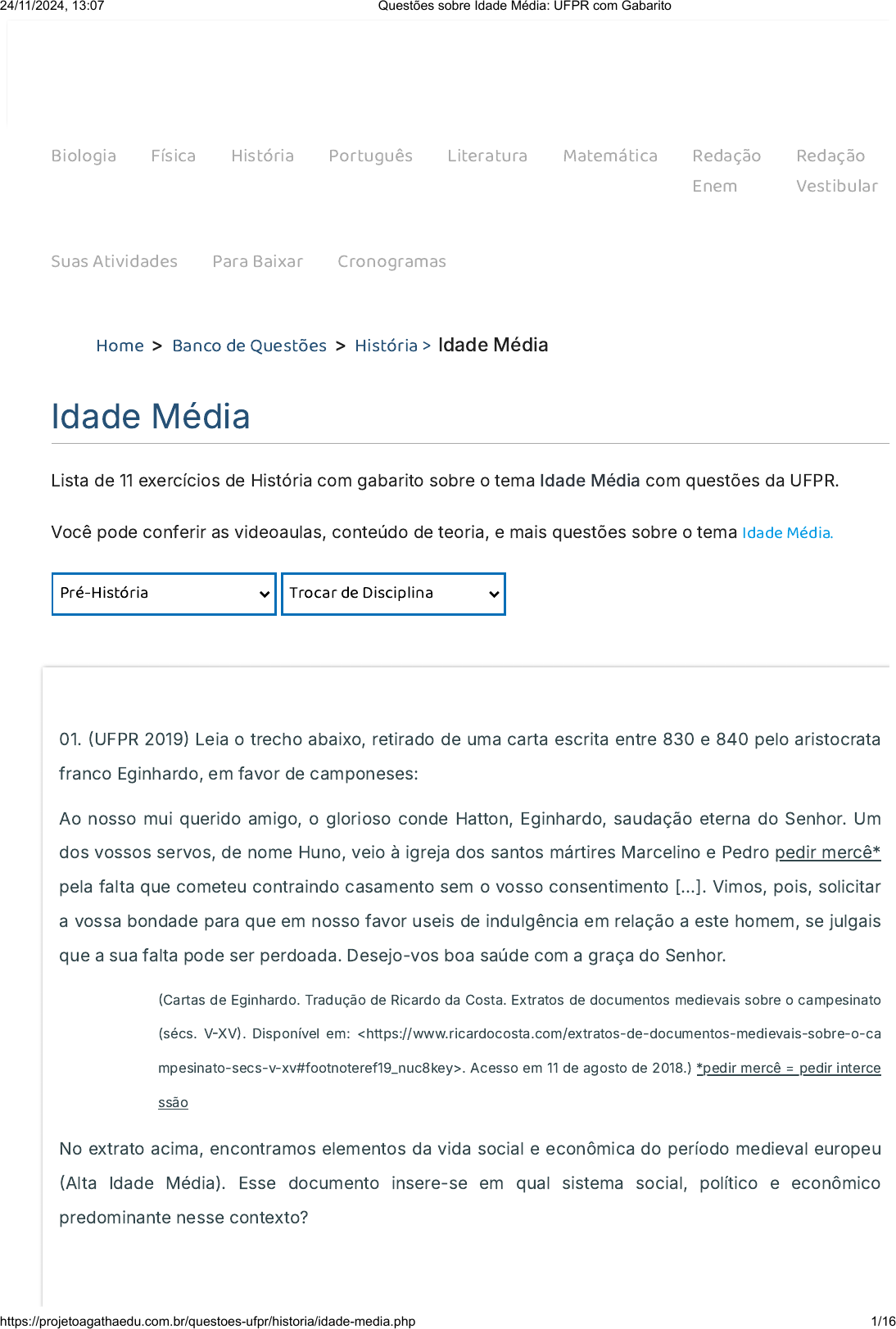 Biologia Física História Português Literatura Matemática Redação Enem Redação Vestibular Suas Atividades Para Baixar Cronogramas Home > Banco de Questões > História > Idade Média Idade Média Lista de 11 exercícios de História com gabarito sobre o tema Idade Média com questões da UFPR. Você pode conferir as videoaulas, conteúdo de teoria, e mais questões sobre o tema Idade Média. Pré-História Trocar de Disciplina 01. �UFPR 2019� Leia o trecho abaixo, retirado de uma carta escrita entre 830 e 840 pelo aristocrata franco Eginhardo, em favor de camponeses: Ao nosso mui querido amigo, o glorioso conde Hatton, Eginhardo, saudação eterna do Senhor. Um dos vossos servos, de nome Huno, veio à igreja dos santos mártires Marcelino e Pedro pedir mercê* pela falta que cometeu contraindo casamento sem o vosso consentimento [...]. Vimos, pois, solicitar a vossa bondade para que em nosso favor useis de indulgência em relação a este homem, se julgais que a sua falta pode ser perdoada. Desejo-vos boa saúde com a graça do Senhor. �Cartas de Eginhardo. Tradução de Ricardo da Costa. Extratos de documentos medievais sobre o campesinato (sécs. V�XV�. Disponível em: . Acesso em 11 de agosto de 2018.) *pedir mercê = pedir interce ssão No extrato acima, encontramos elementos da vida social e econômica do período medieval europeu �Alta Idade Média). Esse documento insere-se em qual sistema social, político e econômico predominante nesse contexto? 24/11/2024, 13:07 Questões sobre Idade Média: UFPR com Gabarito https://projetoagathaedu.com.br/questoes-ufpr/historia/idade-media.php 1/16 https://projetoagathaedu.com.br/ https://projetoagathaedu.com.br/ https://projetoagathaedu.com.br/blog/biologia.php https://projetoagathaedu.com.br/blog/fisica.php https://projetoagathaedu.com.br/blog/historia.php https://projetoagathaedu.com.br/blog/linguagens.php https://projetoagathaedu.com.br/blog/literatura.php https://projetoagathaedu.com.br/blog/matematica.php https://projetoagatharedacao.com.br/guia-de-redacao-enem.php https://projetoagatharedacao.com.br/guia-de-redacao-enem.php https://projetoagatharedacao.com.br/guia-de-redacao-vestibular.php https://projetoagatharedacao.com.br/guia-de-redacao-vestibular.php https://projetoagathaedu.com.br/app/ https://projetoagathaedu.com.br/app/material.php https://projetoagathaedu.com.br/cronogramas-de-estudo.php https://projetoagathaedu.com.br/ https://projetoagathaedu.com.br/banco-de-questoes.php https://projetoagathaedu.com.br/banco-de-questoes/historia.php https://projetoagathaedu.com.br/app/disciplinas/historia.php A. Feudalismo, caracterizado pela ruralização da economia, pela relação senhorial entre nobres e servos e pela atuação social e política da Igreja Católica. B. Mercantilismo, caracterizado pela urbanização da economia, pela relação senhorial entre nobres e camponeses e pela atuação social e política da Igreja Protestante. C. Socialismo, caracterizado pela ruralização da economia, pela relação remunerada entre nobres e servos e pela atuação cultural e política da Igreja Cristã. D. Mercantilismo, caracterizado pela urbanização da economia, pela relação campesina entre nobres e vassalos e pela atuação social e política da Igreja Ortodoxa. E. Feudalismo, caracterizado pela urbanização da economia, pela relação agrária entre o clero e os servos e pela atuação social e cultural da Igreja Cristã. 02. �UFPR 2018� Para muitos pesquisadores, é correto assinalar que durante a Idade Média foram os árabes, não os cristãos, os herdeiros e sucessores da ciência helênica, uma herança que fez com que toda a extensão dos seus domínios, da Espanha ao Afeganistão, o mundo muçulmano, fosse cenário de uma atividade intelectual intensa, não só em filosofia, mas também em matemática, astronomia e medicina. Nem sempre conhecida ou traduzida no Ocidente, essa produção está preservada em uma grande quantidade de manuscritos. �BISSIO, Beatriz. O mundo falava árabe. A civilização árabe-islâmica clássica através da obra de Ibn Khaldun e Ibn Battuta. Rio de Janeiro: Civilização Brasileira, 2012, p. 36.) Com base no texto acima e nos conhecimentos sobre o mundo muçulmano na Idade Média, assinale a alternativa correta. A. Foi justamente em função do seu caráter religioso fragmentado que o mundo muçulmano e a sua civilização distinguiramse mais vigorosamente do Ocidente cristão, fortemente homogêneo. A existência, no seio do Império Muçulmano, de numerosas tendências religiosas teve consequências consideráveis na produção de manuscritos. B. Apesar da sua hegemonia nas ciências durante o período medieval, a civilização muçulmana era, a�nal, um simples conjunto díspar de empréstimos culturais, o qual não conseguia re�etir o novo universalismo e a nova ordem social que se instaurou com o surgimento do Islã. C. Durante esse período, cidades como Córdoba, Bagdá e Alexandria, entre outras, se tornaram centros de intercâmbio de conhecimentos. Tratava-se de um circuito cosmopolita do qual a Europa, periférica e tragada por diversas crises religiosas, não participou. D. A Idade Média foi um período caraterizado pelo domínio efetivo, militar e político, dos países muçulmanos sobre os países cristãos. Um domínio caracterizado, entre outras coisas, pela 24/11/2024, 13:07 Questões sobre Idade Média: UFPR com Gabarito https://projetoagathaedu.com.br/questoes-ufpr/historia/idade-media.php 2/16 presença hegemônica da língua árabe nos espaços comerciais, políticos e acadêmicos da Europa. E. Existe consenso entre a maioria dos historiadores que estudam o período de que a emergência do horizonte renascentista deve muito ao trabalho dos sábios e acadêmicos muçulmanos, conhecidos pelo mundo cristão, sobretudo, através da Península Ibérica. 03. �UFPR 2017� Considere o fragmento abaixo: Durante a Idade Média, a figura feminina revest