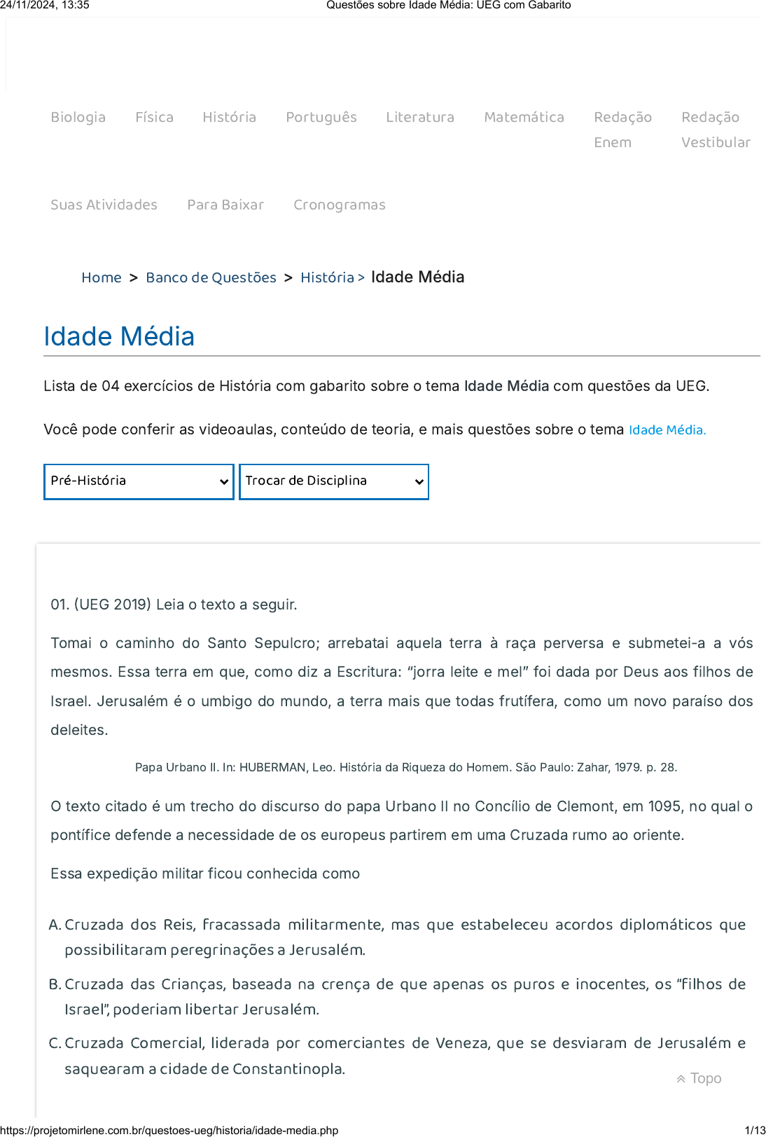 Biologia Física História Português Literatura Matemática Redação Enem Redação Vestibular Suas Atividades Para Baixar Cronogramas Home > Banco de Questões > História > Idade Média Idade Média Lista de 04 exercícios de História com gabarito sobre o tema Idade Média com questões da UEG. Você pode conferir as videoaulas, conteúdo de teoria, e mais questões sobre o tema Idade Média. Pré-História Trocar de Disciplina 01. �UEG 2019� Leia o texto a seguir. Tomai o caminho do Santo Sepulcro; arrebatai aquela terra à raça perversa e submetei-a a vós mesmos. Essa terra em que, como diz a Escritura: “jorra leite e mel” foi dada por Deus aos filhos de Israel. Jerusalém é o umbigo do mundo, a terra mais que todas frutífera, como um novo paraíso dos deleites. Papa Urbano II. In: HUBERMAN, Leo. História da Riqueza do Homem. São Paulo: Zahar, 1979. p. 28. O texto citado é um trecho do discurso do papa Urbano II no Concílio de Clemont, em 1095, no qual o pontífice defende a necessidade de os europeus partirem em uma Cruzada rumo ao oriente. Essa expedição militar ficou conhecida como A. Cruzada dos Reis, fracassada militarmente, mas que estabeleceu acordos diplomáticos que possibilitaram peregrinações a Jerusalém. B. Cruzada das Crianças, baseada na crença de que apenas os puros e inocentes, os “�lhos de Israel”, poderiam libertar Jerusalém. C. Cruzada Comercial, liderada por comerciantes de Veneza, que se desviaram de Jerusalém e saquearam a cidade de Constantinopla. Topo 24/11/2024, 13:35 Questões sobre Idade Média: UEG com Gabarito https://projetomirlene.com.br/questoes-ueg/historia/idade-media.php 1/13 https://projetoagathaedu.com.br/ https://projetoagathaedu.com.br/ https://projetoagathaedu.com.br/blog/biologia.php https://projetoagathaedu.com.br/blog/fisica.php https://projetoagathaedu.com.br/blog/historia.php https://projetoagathaedu.com.br/blog/linguagens.php https://projetoagathaedu.com.br/blog/literatura.php https://projetoagathaedu.com.br/blog/matematica.php https://projetoagatharedacao.com.br/guia-de-redacao-enem.php https://projetoagatharedacao.com.br/guia-de-redacao-enem.php https://projetoagatharedacao.com.br/guia-de-redacao-vestibular.php https://projetoagatharedacao.com.br/guia-de-redacao-vestibular.php https://projetoagathaedu.com.br/app/ https://projetoagathaedu.com.br/app/material.php https://projetoagathaedu.com.br/cronogramas-de-estudo.php https://projetoagathaedu.com.br/ https://projetoagathaedu.com.br/banco-de-questoes.php https://projetoagathaedu.com.br/banco-de-questoes/historia.php https://projetoagathaedu.com.br/app/disciplinas/historia.php https://projetomirlene.com.br/questoes-ueg/historia/idade-media.php D. Cruzada dos Pobres, liderada por líderes messiânicos que pretendiam enriquecer conquistando os tesouros de Jerusalém. E. Cruzada dos Nobres, uma campanha bem-sucedida que chegou a fundar em moldes feudais o Reino Latino de Jerusalém. 02. �UEG 2016� Leia o texto a seguir. A Cruzada foi fonte de enormes infelicidades, desde a própria época: a tomada de Jerusalém, em 1099, o saque de Constantinopla em 1204 são páginas vergonhosas da história do Ocidente Cristão [...]. É claro que a Cruzada foi muito importante para a identidade da cristandade: um tal projeto une uma comunidade, dá-lhe uma unidade. LE GOFF, Jacques. Uma longa Idade Média. Rio de Janeiro: Civilização Brasileira, 2008. p. 101�102. Quando, no século XI, o papa Urbano II convocou a Primeira Grande Cruzada ao Oriente, usou como justificativa para tamanha movimentação de tropas e recursos o projeto de A. Rea�rmar a universalidade da fé católica, ameaçada pelas conversões em massa dos cristãos do Oriente ao islamismo. B. Reuni�car os Impérios Romano do Oriente e do Ocidente, separados desde o Édito de Tessalônica de 395. C. Retomar a posse de reinos cristãos ibéricos ocupados por muçulmanos, num projeto militar chamado de Reconquista. D. Defender os cristãos do Oriente e a retomada dos “lugares santos” que estavam em posse dos muçulmanos. E. Punir os cavaleiros cristãos que desobedeciam a Paz e a Trégua de Deus, enviando-os em missão suicida ao Oriente. 03. �UEG 2014� Topo 24/11/2024, 13:35 Questões sobre Idade Média: UEG com Gabarito https://projetomirlene.com.br/questoes-ueg/historia/idade-media.php 2/13 https://projetomirlene.com.br/questoes-ueg/historia/idade-media.php A gravura apresentada foi produzida no contexto da Reforma Protestante, ocorrida na Alemanha no século XVI. Ela critica qual prática católica? A. A de que a crença na infalibilidade do papa foi transformada em dogma. B. A de que as indulgências eram um meio de livrar as almas do Purgatório. C. A de que a prática da usura era um pecado que impedia a salvação do �el. D. A de que a tradição da Igreja possuía um peso religioso maior do que as Escrituras. 04. �UEG 2013� A justiça feudal Imagine que um servo se sentisse injustiçado pelo senhor feudal. A quem ele iria reclamar? Àquele que controlava as leis e julgamentos no feudo, ou seja... o próprio senhor feudal! O nobre poderia, gentilmente propor para “deixar o julgamento nas mãos de Deus”. Como seria isso? O servo deveria segurar um ferro em brasa, ou então ser amarrado a uma pedra enorme e atirado no rio: diziam que se ele fosse inocente Deus não o deixaria queimar-se ou afogar-se... Dá pra perceber que poucos servos conseguiam o que queriam. SCHMIDT, Mario. Nova História Crítica: moderna e contemporânea. São Paulo: Nova Geração, 1996. p. 9. O texto citado descreve um aspecto do direito consuetudinário vigente na Europa medieval. Do ponto de vista sociológico, a situação descrita no texto pode ser caracterizada como um exemplo de A. Fetichismo da mercadoria, já que se acreditava que o sobrenatural teria in�uência para resolver os con�itos entre duas classes sociais. B. Alienação social, uma vez que, pelo fato de serem analfabetos, os ser