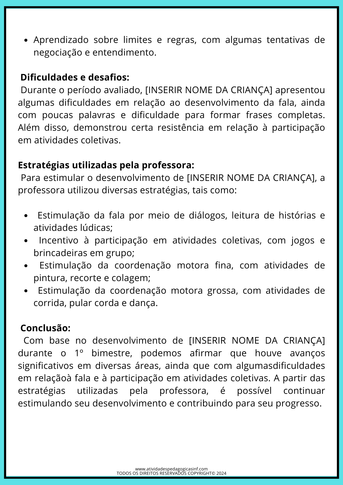 Aprendizado sobre limites e regras, com algumas tentativas de negociação e entendimento. Dificuldades e desafios: Durante o período avaliado, [INSERIR NOME DA CRIANÇA] apresentou algumas dificuldades em relação ao desenvolvimento da fala, ainda com poucas palavras e dificuldade para formar frases completas. Além disso, demonstrou certa resistência em relação à participação em atividades coletivas. Estratégias utilizadas pela professora: Para estimular o desenvolvimento de [INSERIR NOME DA CRIANÇA], a professora utilizou diversas estratégias, tais como: Estimulação da fala por meio de diálogos, leitura de histórias e atividades lúdicas; Incentivo à participação em atividades coletivas, com jogos e brincadeiras em grupo; Estimulação da coordenação motora fina, com atividades de pintura, recorte e colagem; Estimulação da coordenação motora grossa, com atividades de corrida, pular corda e dança. Conclusão: Com base no desenvolvimento de [INSERIR NOME DA CRIANÇA] durante o 1° bimestre, podemos afirmar que houve avanços significativos em diversas áreas, ainda que com algumasdificuldades em relaçãoà fala e à participação em atividades coletivas. A partir das estratégias utilizadas pela professora, é possível continuar estimulando seu desenvolvimento e contribuindo para seu progresso. TODOS os DIREITOS COPYRIGHT© 2024