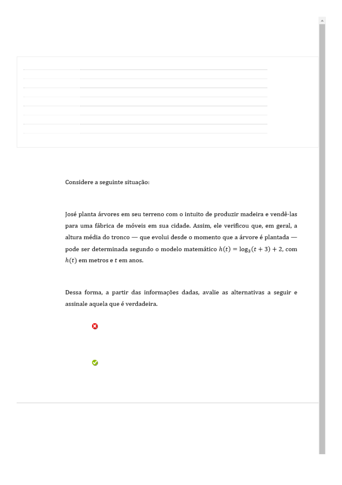 07/12/2018 Revisar envio do teste: ATIVIDADE 4 – Bloco 2 - 2018.2 ... https://unp.blackboard.com/webapps/late-Course_Landing_Page-BBLEARN/Controller# 1/9 REVISAR ENVIO DO TESTE: ATIVIDADE 4 Usuário FRANCISCO DE ASSIS DANTAS JUNIOR Curso Bloco 2 - 2018.2 TURMA_IES ED EAD-PN SD - JOGOS MATEMÁTICOS (ON) Teste ATIVIDADE 4 Iniciado 03/12/18 22:28 Enviado 03/12/18 23:30 Status Completada Resultado da tentativa 0,75 em 2,5 pontos Tempo decorrido 1 hora, 1 minuto Resultados exibidos Respostas enviadas, Respostas corretas, Comentários Pergunta 1 Resposta Selecionada: Resposta Correta: José deseja que os troncos de suas árvores alcancem 3,5 metros antes de cortá-los. Portanto, ele precisará deixar suas árvores crescerem durante 48 meses até o momento do corte. Se uma das árvores plantadas por José foi cortada quando seu tronco alcançou 4 metros de altura, o tempo transcorrido desde o plantio até o momento do corte foi de exatamente 6 anos. Pergunta 2 ← OK 0 em 0,25 pontos 0 em 0,25 pontos javascript:launch('/webapps/gradebook/do/student/viewAttempts?course_id=_389778_1&method=list&nolaunch_after_review=true'); 07/12/2018 Revisar envio do teste: ATIVIDADE 4 – Bloco 2 - 2018.2 ... https://unp.blackboard.com/webapps/late-Course_Landing_Page-BBLEARN/Controller# 2/9 Resposta Selecionada: Resposta Correta: Feedback da resposta: As proposições I e II são verdadeiras, mas a II não é uma justi cativa da I. A proposição I é falsa, e a proposição II é verdadeira. Infelizmente sua resposta está incorreta. Lembre-se de que uma função, cujo valor da base é um número maior do que 1, é caracterizada como uma função crescente. Reveja o conteúdo e tente responder novamente! Pergunta 3 ← OK 0 em 0,25 pontos javascript:launch('/webapps/gradebook/do/student/viewAttempts?course_id=_389778_1&method=list&nolaunch_after_review=true'); 07/12/2018 Revisar envio do teste: ATIVIDADE 4 – Bloco 2 - 2018.2 ... https://unp.blackboard.com/webapps/late-Course_Landing_Page-BBLEARN/Controller# 3/9 Resposta Selecionada: Resposta Correta: Feedback da resposta: 2, 3, 4, 1, 5. 5, 1, 3, 2, 4. Não é isso, sua resposta está incorreta. Lembre-se: quais são as operações que não podem ser efetuadas em todo o conjunto real? As raízes de números negativos pertencem ao conjunto dos reais? É possível dividir um número por zero? Reveja o conteúdo e tente responder novamente à questão. Pergunta 4 ← OK 0,25 em 0,25 pontos javascript:launch('/webapps/gradebook/do/student/viewAttempts?course_id=_389778_1&method=list&nolaunch_after_review=true'); 07/12/2018 Revisar envio do teste: ATIVIDADE 4 – Bloco 2 - 2018.2 ... https://unp.blackboard.com/webapps/late-Course_Landing_Page-BBLEARN/Controller# 4/9 Resposta Selecionada: Resposta Correta: Feedback da resposta: V, F, F, V. V, F, F, V. A resposta está correta! Pergunta 5 Resposta Selecionada: Resposta Correta: A proposição I é verdadeira, e a proposição II é falsa. A proposição I é verdadeira, e a proposição II é falsa. ← OK 0,25 em 0,25 pontos javascript:launch('/webapps/gradebook/do/student/viewAttempts?course_id=_389778_1&method=list&nolaunch_after_review=true'); 07/12/2018 Revisar envio do teste: ATIVIDADE 4 – Bloco 2 - 2018.2 ... https://unp.blackboard.com/webapps/late-Course_Landing_Page-BBLEARN/Controller# 5/9 Feedback da resposta: Muito bem, sua resposta está correta! Calculando a razão da progressão aritmética com as informações dadas, descobrimos que o resultado encontrado é igual a . Além disso, é correto dizer que toda progressão aritmética com razão positiva é crescente. Pergunta 6 Resposta Selecionada: Resposta Correta: I e IV, apenas. II e IV, apenas. Pergunta 7 ← OK 0 em 0,25 pontos 0 em 0,25 pontos javascript:launch('/webapps/gradebook/do/student/viewAttempts?course_id=_389778_1&method=list&nolaunch_after_review=true'); 07/12/2018 Revisar envio do teste: ATIVIDADE 4 – Bloco 2 - 2018.2 ... https://unp.blackboard.com/webapps/late-Course_Landing_Page-BBLEARN/Controller# 6/9 Resposta Selecionada: Resposta Correta: Feedback da resposta: V, V, F, V. V, F, F, V. pena, sua resposta está incorreta. Vamos tentar de novo! Tente sistematiza rmações e usá-las nas fórmulas fundamentais de cada progressão. Lembre-se a da P.A. nos permite calcular o valor da soma dos seus termos equidistantes. Pergunta 8 ← OK 0 em 0,25 pontos javascript:launch('/webapps/gradebook/do/student/viewAttempts?course_id=_389778_1&method=list&nolaunch_after_review=true'); 07/12/2018 Revisar envio do teste: ATIVIDADE 4 – Bloco 2 - 2018.2 ... https://unp.blackboard.com/webapps/late-Course_Landing_Page-BBLEARN/Controller# 7/9 Resposta Selecionada: Resposta Correta: Feedback da resposta: 4, 3, 2, 5, 1. 3, 5, 4, 2, 1. Infelizmente sua resposta está incorreta. Lembre-se de que a relação entre os coe cientes das incógnitas pode ajudar a determinar a quantidade de soluções do sistema linear, sem que haja a necessidade de resolver propriamente o sistema. Reveja o conteúdo e tente responder novamente! Pergunta 9 ← OK 0,25 em 0,25 pontos javascript:launch('/webapps/gradebook/do/student/viewAttempts?course_id=_389778_1&method=list&nolaunch_after_review=true'); 07/12/2018 Revisar envio do teste: ATIVIDADE 4 – Bloco 2 - 2018.2 ... https://unp.blackboard.com/webapps/late-Course_Landing_Page-BBLEARN/Controller# 8/9 Resposta Selecionada: Resposta Correta: Feedback da resposta: I, II e IV, apenas. I, II e IV, apenas. A resposta está correta! Pergunta 10 Resposta Selecionada: ← OK 0 em 0,25 pontos javascript:launch('/webapps/gradebook/do/student/viewAttempts?course_id=_389778_1&method=list&nolaunch_after_review=true'); 07/12/2018 Revisar envio do teste: ATIVIDADE 4 – Bloco 2 - 2018.2 ... https://unp.blackboard.com/webapps/late-Course_Landing_Page-BBLEARN/Controller# 9/9 Sexta-feira, 7 de Dezembro de 2018 06h48min31s BRST Resposta Correta: O turista deveria ter parado após a sexta aposta, pois seu prejuízo já era de $ 1.365,00.