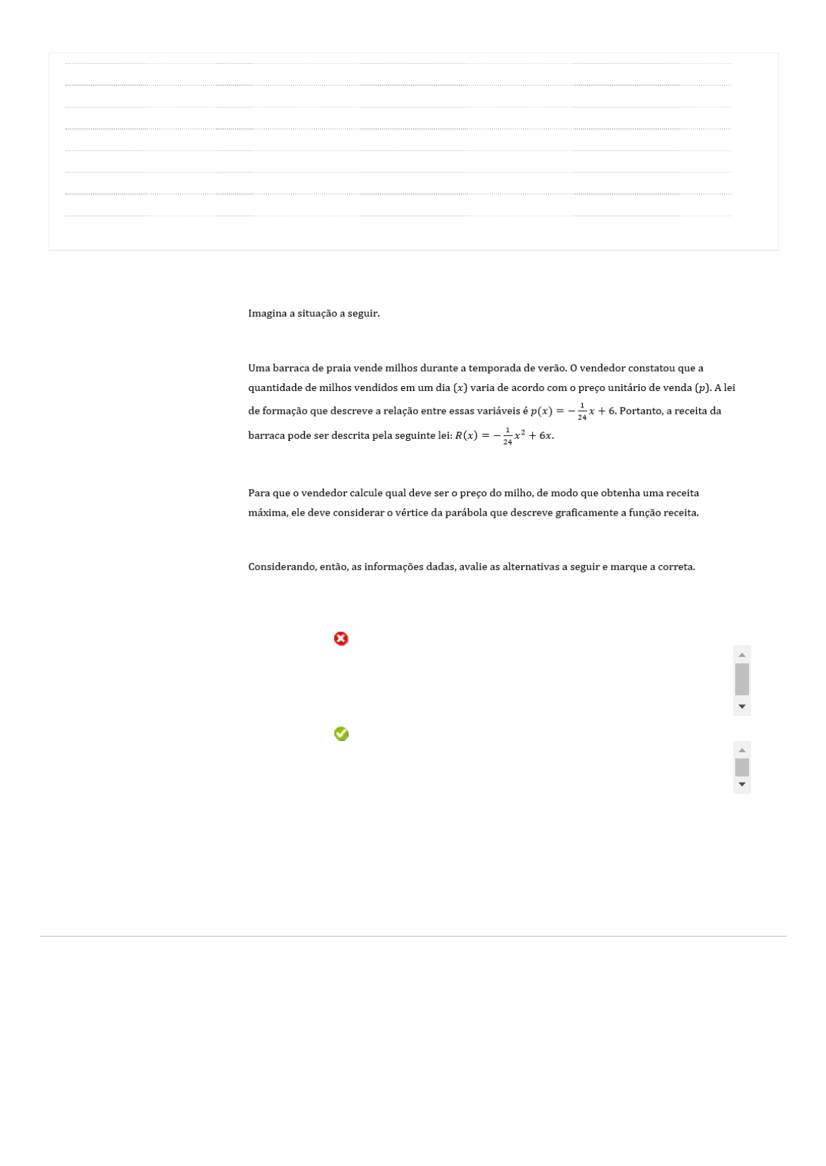 07/12/2018 Minha Disciplina https://unp.blackboard.com/webapps/late-Course_Landing_Page-BBLEARN/Controller# 1/8 Curso Bloco 2 - 2018.2 TURMA_IES ED EAD-PN SD - JOGOS MATEMÁTICOS (ON) Teste ATIVIDADE 2 Iniciado 19/11/18 21:22 Enviado 19/11/18 22:25 Status Completada Resultado da tentativa 1,25 em 2,5 pontos Tempo decorrido 1 hora, 3 minutos Resultados exibidos Respostas enviadas, Respostas corretas, Comentários Pergunta 1 Resposta Selecionada: Resposta Correta: Feedback da resposta: Não é possıv́el determinar uma receita máxima nesse caso. O discriminante da função é um número negativo e, assim, não existe uma imagem para o valor da coordenada do vértice da parábola. A receita é maximizada quando são vendidos 72 milhos por dia. Nesse caso, o preço unitário de venda é R$ 3,00 e a receita diária obtida é R$ 216,00. Que pena! Observe como são calculados os pontos do vértice de uma parábola. Note, também, que o do vértice representará a quantidade diária que deve ser vendida para que a receita seja máxima. Reveja o conteúdo e tente responder novamente! Pergunta 2 0 em 0,25 pontos 0 em 0,25 pontos 07/12/2018 Minha Disciplina https://unp.blackboard.com/webapps/late-Course_Landing_Page-BBLEARN/Controller# 2/8 Resposta Selecionada: Resposta Correta: Feedback da resposta: F, V, F, V. V, F, F, V. Que pena, sua resposta está errada. Vamos tentar de novo! Lembre-se de que a função relaciona a altura da bola com o tempo decorrido do lançamento. Fique atento, ainda, ao fato de que a trajetória da bola é descrita por uma parábola com a concavidade para baixo, já que o coe�iciente que acompanha o é um número negativo. Pergunta 3 Resposta Selecionada: Resposta Correta: Feedback da II e III, apenas. II e III, apenas. E� isso mesmo, a resposta está correta. As relações entre as quantias que Dona Elisa deve pagar ao banco Mais Dinheiro e 0,25 em 0,25 pontos 07/12/2018 Minha Disciplina https://unp.blackboard.com/webapps/late-Course_Landing_Page-BBLEARN/Controller# 3/8 resposta: ao banco Capital Money, bem como a quantidade de cheques emitidos em cada banco em um mês, podem ser descritas por meio das funções e , respectivamente. Dessa forma, substituindo pela quantidade de cheques emitidos, teremos o valor a ser pago, e vice-versa. Pergunta 4 Resposta Selecionada: Resposta Correta: Feedback da resposta: As proposições I e II são falsas. Muito bem! Sua resposta está correta. As duas asserções estão corretas, mas não é su�iciente para justi�icar a primeira proposição dizer que o discriminante é um valor positivo. Seria necessário, então, acrescentar que o grá�ico da função é uma parábola com concavidade para baixo. As proposições I e II são verdadeiras, mas a II não é uma justi�icativa da I. Infelizmente sua resposta está incorreta. O fato de o discriminante ser positivo indica que a função terá duas raıźes reais e distintas, mas não garante que, no intervalo entre esses pontos, a função será positiva. A análise do sinal da função depende, também, da concavidade da parábola. Reveja o conteúdo e tente responder novamente! Pergunta 5 0 em 0,25 pontos 0,25 em 0,25 pontos 07/12/2018 Minha Disciplina https://unp.blackboard.com/webapps/late-Course_Landing_Page-BBLEARN/Controller# 4/8 Resposta Selecionada: Resposta Correta: Feedback da resposta: As proposições I e II são verdadeiras, mas a II não é uma justi�icativa da I. As proposições I e II são verdadeiras, mas a II não é uma justi�icativa da I. Muito bem! Sua resposta está correta. As duas asserções estão corretas, mas não há relação de justi�icativa entre elas. Não é su�iciente dizer que o grá�ico da função é representado por uma reta oblıq́ua aos eixos das abscissas e das ordenadas para justi�icar a primeira proposição. Seria necessário, para isso, acrescentar que a função é decrescente. Pergunta 6 Resposta Selecionada: III, apenas. 0 em 0,25 pontos 07/12/2018 Minha Disciplina https://unp.blackboard.com/webapps/late-Course_Landing_Page-BBLEARN/Controller# 5/8 Resposta Correta: Feedback da resposta: I e III, apenas. Infelizmente sua resposta está incorreta. Lembre-se do que você aprendeu até aqui. Analise, primeiro, a lei de formação indicada no enunciado: o grá�ico será uma parábola com concavidade para cima ou para baixo? Depois, veri�ique o que o vértice da parábola e os pontos que cortam os eixos e representam para o problema Pergunta 7 Resposta Selecionada: Resposta Correta: Leia os textos a seguir. Texto I “Desde o ano de 2015, as contas de energia passaram a trazer uma novidade: o Sistema de Bandeiras Tarifárias, que apresenta as seguintes modalidades: verde, amarela e vermelha [...]. Cada modalidade apresenta as seguintes caracterıśticas: Bandeira verde: condições favoráveis de geração de energia. A tarifa não sofre nenhum acréscimo; Bandeira amarela: condições de geração menos favoráveis. A tarifa sofre acréscimo de R$ 0,010 para cada quilowatt-hora (kWh) consumidos; Bandeira vermelha - Patamar 1: condições mais custosas de geração. A tarifa sofre acréscimo de R$ 0,030 para cada quilowatt-hora kWh consumido”. BRASIL. Agência Nacional de Energia Elétrica. Bandeiras Tarifárias. 24 nov. 2015. Disponıv́el em: . Acesso em: 02/04/2017. Texto II De acordo com Diniz (2015), uma lâmpada incandescente de 60W, ligada 5 horas por dia, por 30 dias, consome, em média, 9 kWh. Uma �luorescente de 20W, por sua vez, que gera a mesma intensidade de luz, ligada pelo mesmo tempo, consome 3,6 kWh. Uma lâmpada de LED de 8W, que permanece ligada 5 horas, durante 30 dias, consome 1,2 kWh. DINIZ, M. Venda de lâmpadas incandescentes de 60W está proibida a partir de hoje. Agência Brasil, Brasıĺia, 01 jul. 2015. Disponıv́el em: . Acesso em: 02/04/2017. Sendo assim, considerando as informações dos textos e uma tarifa de R$ 0,50 por kWh em bandeira verde, avalie as alternativas a seguir e 
