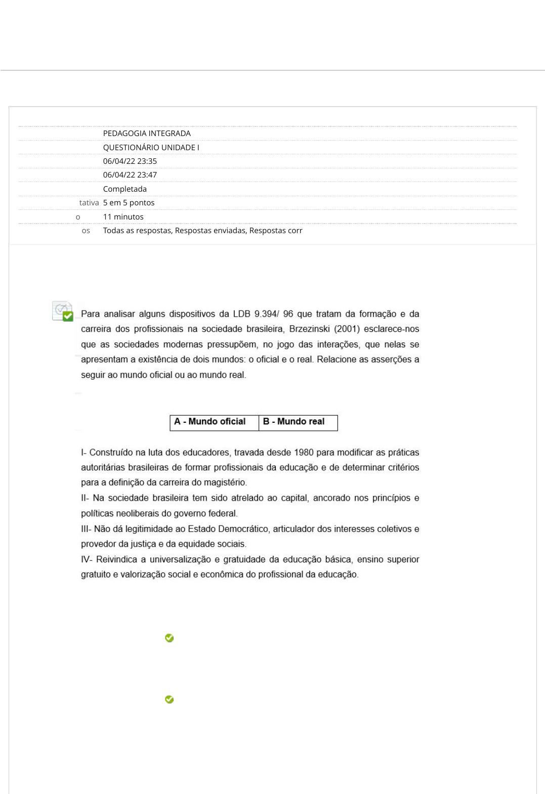 Revisar envio do teste: QUESTIONÁRIO UNIDADE IPEDAGOGIA INTEGRADA 5547-40_34202_R_F1_20221 CONTEÚDO Usuário WANESSA PALACIO Curso PEDAGOGIA INTEGRADA Teste QUESTIONÁRIO UNIDADE I Iniciado 06/04/22 23:35 Enviado 06/04/22 23:47 Status Completada Resultado da tentativa 5 em 5 pontos Tempo decorrido 11 minutos Resultados exibidos Todas as respostas, Respostas enviadas, Respostas corretas, Comentários, Perguntas respondidas incorretamente Pergunta 1 Resposta Selecionada: c. Respostas: a. b. c. d. e. Comentário da resposta: Relacione os itens acima e assinale a alternativa correta. A- II e III; B- I e IV; A- I e II; B- III e IV; A- II e IV; B- I e III; A- II e III; B- I e IV; A- I e III; B- II e IV; A- III e IV; B- I e II. Resposta correta: c) A- I e IV; B- II e III; UNIP EAD BIBLIOTECAS MURAL DO ALUNO TUTORIAIS LABORATÓRIOSCONTEÚDOS ACADÊMICOS 0.5 em 0.5 pontos http://company.blackboard.com/ https://ava.ead.unip.br/webapps/blackboard/execute/courseMain?course_id=_216047_1 https://ava.ead.unip.br/webapps/blackboard/content/listContent.jsp?course_id=_216047_1&content_id=_2669305_1&mode=reset https://ava.ead.unip.br/webapps/portal/execute/tabs/tabAction?tab_tab_group_id=_10_1 https://ava.ead.unip.br/webapps/portal/execute/tabs/tabAction?tab_tab_group_id=_27_1 https://ava.ead.unip.br/webapps/portal/execute/tabs/tabAction?tab_tab_group_id=_47_1 https://ava.ead.unip.br/webapps/portal/execute/tabs/tabAction?tab_tab_group_id=_29_1 https://ava.ead.unip.br/webapps/portal/execute/tabs/tabAction?tab_tab_group_id=_64_1 https://ava.ead.unip.br/webapps/portal/execute/tabs/tabAction?tab_tab_group_id=_25_1 https://ava.ead.unip.br/webapps/login/?action=logout wanes Retângulo Comentário Leia excerto de Brzezinski (2001, p. 3 e 4) – ANPEd (Associação Nacional de Pós-Graduação e Pesquisa em Educação – Contribuições) na Audiência Pública Nacional sobre “Diretrizes para a Formação Inicial de Professores da Educação Básica em curso de Nível Superior”, realizada no Conselho Nacional de Educação – CNE, Brasília, 23/04/2001: “De um lado, o mundo do sistema (o�cial) que, aportado nas políticas de princípios neoliberais, saúda a globalização excludente como sinal inquestionável de progresso e de pós-modernidade, rea�rmando parcerias com organismos internacionais. De outro, o mundo vivido, construído na luta travada desde 1980 pelo Movimento Nacional de Educadores, que propõe a adoção de uma política global de formação e de pro�ssionalização docente. (Nele), a identidade do professor como pro�ssional do ensino, tal como foi de�nida, constrói-se como parte de um projeto de sociedade que se fundamenta na concepção histórico-social e tem como paradigma educacional as relações entre cultura, sociedade e educação. Esse paradigma leva em conta as transformações sociais, das forças produtivas e do mundo do trabalho, transformações que, dialeticamente, provocam mudanças no papel social do professor. Diante da adoção desse paradigma, com o qual se busca a superação das desigualdades educacionais, a formação do pro�ssional da educação para atuar na educação básica é entendida como um processo marcado pela complexidade do conhecimento, pela crítica, pela re�exão-ação e pela criatividade. O mundo o�cial, por sua vez, pela dependência para com os organismos estrangeiros, �nanciadores das políticas educacionais brasileiras, submete-se ao modelo de formação de pro�ssionais da educação, implantado em outros países. Esse modelo institucionaliza preferencialmente a formação fora da Universidade e preocupa-se muito mais em conceder uma certi�cação do que conferir uma boa quali�cação aos futuros professores do sistema educacional e aos leigos que nele atuam”. Pergunta 2 Resposta Selecionada: a. Respostas: a. b. c. d. e. Comentário da resposta: Alguns pesquisadores descrevem e discutem o que chamam de “crise” na Educação. As alternativas abaixo encontram-se de acordo com tal a�rmação e discussão dos estudiosos, exceto a alternativa: É um tema novo nos debates da Academia, que busca trazer à luz propostas de melhores ações de enfrentamento de tais questões. É um tema novo nos debates da Academia, que busca trazer à luz propostas de melhores ações de enfrentamento de tais questões. Já se falava em crise desde o �nal do século XIX, quando a instituição escolar se consolidava na Europa, a despeito de ainda não se encontrar universalizada. Refere-se a questões que abrangem, entre outras, a desvalorização do campo de conhecimento da Pedagogia e o baixo nível de formação docente. Nos Estados Unidos, no momento em que se iniciava o processo de universalização do sistema escolar e de suas instituições, o discurso sobre a crise da educação já havia se instalado no meio cientí�co da educação. Em suas re�exões, Arendt a�rma ser a crise da educação consequência da crise da modernidade. Resposta correta: a) Comentário O discurso sobre a crise na educação é antigo, não se con�gurando como exclusivo das últimas décadas, momento em que o tema da crise educacional alcançou absoluta centralidade nos debates pedagógicos. Segundo Arendt (2005), assim, no momento mesmo em que se iniciava o processo de universalização do sistema escolar e de suas instituições nos Estados Unidos e na Europa, com o desenvolvimento das primeiras políticas educacionais, o discurso sobre a crise da educação já havia se instalado no meio cientí�co da educação. Em suas re�exões, Arendt a�rma ser a crise da educação consequência da crise da modernidade. “A crise da autoridade da educação guarda a mais estreita conexão com a crise da tradição, ou seja, com a crise de nossa atitude face ao âmbito do passado.” (ARENDT, 2005, p. 243). 0.5 em 0.5 pontos Pergunta 3 Resposta Selecionada: e. Respostas: a. b. c. d. e. Comentário da resposta: Coloque “V” nas expressões ver