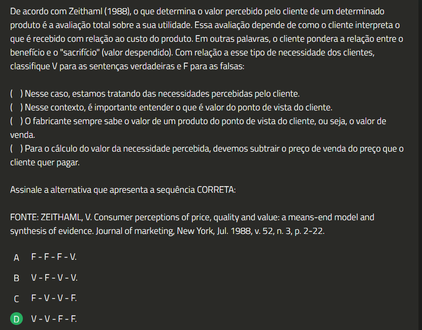 De acordo com Zeithaml (1988), que determina valor percebido pelo cliente de um determinado produto é a avaliação total sobre a sua utilidade. Essa avaliação depende de como cliente interpreta que é recebido com relação ao custo do produto. Em outras palavras, 0 cliente pondera a relação entre benefício e "sacrifício" (valor despendido). Com relação a esse tipo de necessidade dos clientes, classifique V para as sentenças verdadeiras e F para as falsas: ( ) Nesse caso, estamos tratando das necessidades percebidas pelo cliente. ( ) Nesse contexto, é importante entender que é valor do ponto de vista do cliente. ( ) fabricante sempre sabe valor de um produto do ponto de vista do cliente, ou seja, valor de venda. ( ) Para cálculo do valor da necessidade percebida, devemos preço de venda do preço que cliente quer pagar. Assinale a alternativa que apresenta a CORRETA: FONTE: ZEITHAML, V. Consumer perceptions of price, quality and value: a means-end model and synthesis of evidence. Journal of marketing, New York, Jul. 1988, V. 52, n. 3, p. 2 -22. A F-F-F-V. - D