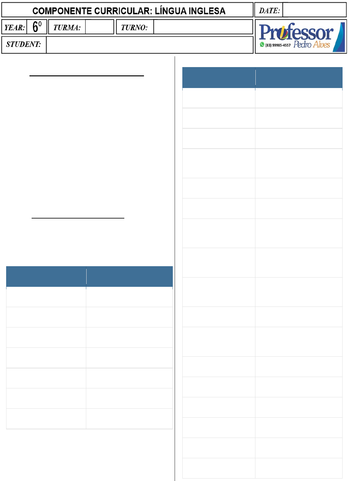 SAUDAÇÕES EM INGLÊS Um dos primeiros conteúdos que os estudantes aprendem ao estudarem inglês são os greetings (cumprimentos). As greetings, também traduzidos como saudações, são sempre a primeira etapa utilizada para estabelecer uma comunicação com alguém. Quando chegamos a um local e encontramos outra pessoa, geralmente cumprimentamos com um olá, oi, bom dia, boa tarde, etc. Confira abaixo uma lista com as principais saudações utilizadas em inglês e veja a tradução correspondente. ❖ SAUDAÇÕES DE CHEGADA As saudações de chegada são aquelas que usamos para cumprimentar quem está no local onde chegamos ou que usamos quando alguém chega a um lugar onde já estamos. INGLÊS PORTUGUÊS Hello! Olá!; Oi! Hi! Olá!; Oi! Hi, what's your name? Oi! Qual é o seu nome? Good morning! Bom dia! Good afternoon! Boa tarde! Good evening! Boa noite! Welcome! Seja bem-vindo(a)! SAUDAÇÕES DURANTE UMA CONVERSA INGLÊS PORTUGUÊS How are you? Como vai? How are you doing? Como vai? How is it going? Como vão as coisas? How have you been? Como você tem estado/passado? What's going on? O que está acontecendo? What's up? E aí? O que você me conta? What's new? O que você conta de novo?; Quais são as novidades? What have you been up to all these years? Onde você esteve esses anos? Where have you been hiding? Por onde você andava? It's been a long time! Quanto tempo! It’s been ages since I’ve seen you. Faz um tempão que eu não te vejo. How long has it been? Quanto tempo! Long time no see! Há quanto tempo não te vejo! It's been too long! Você sumiu! Glad to meet you! Prazer em conhecê-lo! Nice to meet you! Prazer em conhecê-lo! Nice to meet you too! Prazer em conhecer você INGLÊS PORTUGUÊS também! Pleased to meet you! Prazer em conhecê-lo! The pleasure is mine! O prazer é meu! My pleasure! O prazer é meu! It’s always a pleasure to see you. É sempre um prazer te ver! SAUDAÇÕES DE DESPEDIDA São as saudações que utilizamos ao nos despedirmos de alguém. INGLÊS PORTUGUÊS Good night! Boa noite! See you later! Até logo! See ya! Até logo! Until next time! Até a próxima! See you tomorrow! Até amanhã! Goodbye! Tchau! Bye! Tchau! Bye-bye Tchau! Pleased to meet you! Prazer em conhecê-lo! Nice to meet you! Prazer em conhecê-lo! Take care! Se cuida! Have a nice weekend! Bom fim de semana! Have a nice day! Tenha um bom dia! So long! Até! SAUDAÇÕES EM CARTAS E E-MAILS As saudações também são utilizadas na comunicação por escrito para cumprimentarmos o destinatário ou para nos despedirmos dele. As saudações variam de acordo com o nível de formalidade da comunicação. SAUDAÇÕES PARA CARTAS E E-MAILS FORMAIS Em uma comunicação formal, seja ela um e-mail ou uma carta, utilizamos as seguintes saudações: ❖ SAUDAÇÕES FORMAIS INICIAIS PARA CARTAS E E-MAILS INGLÊS PORTUGUÊS Dear Sir, Prezado/Caro/Exmo. Senhor, Dear Madam, Prezada/Cara/Exma. Senhora, Dear Mr. (+sobrenome), Prezado/Caro Senhor (+sobrenome), Dear Mrs. (+sobrenome), Prezada/Cara Senhora (+sobrenome), ❖ SAUDAÇÕES FORMAIS FINAIS PARA CARTAS E E-MAILS INGLÊS PORTUGUÊS Sincerely, Atenciosamente,; Atentamente,; Cordialmente, Sincerely yours, Atenciosamente,; Atentamente,; Cordialmente, Yours sincerely, Atenciosamente,; Atentamente,; Cordialmente, Yours faithfully, Atenciosamente,; Atentamente,; Cordialmente, Yours truly, Atenciosamente,; Atentamente,; Cordialmente, SAUDAÇÕES PARA CARTAS E E-MAILS INFORMAIS Em uma comunicação informal, seja ela um e- mail ou uma carta, utilizamos as seguintes saudações: ❖ SAUDAÇÕES INFORMAIS INICIAIS PARA CARTAS E E-MAILS INGLÊS PORTUGUÊS Dear ..., Querido(a)..., Dear friend, Querido(a) amigo(a), Hi..., Oi...,; Olá..., Hello ..., Oi...,; Olá..., My dear ..., Meu querido...,/Minha querida..., ❖ SAUDAÇÕES INFORMAIS FINAIS PARA CARTAS E E-MAILS INGLÊS PORTUGUÊS Cheers, Um abraço, See you, Até logo, With love, Com afeto, Love, Com afeto, Best wishes, Um abraço, Kisses, Beijos, Kisses and hugs, Beijos e abraços XOXO, Beijos e abraços Regards, Saudações,; Lembranças, Kind regards, Saudações,; Lembranças, Best regards, Saudações,; Lembranças,