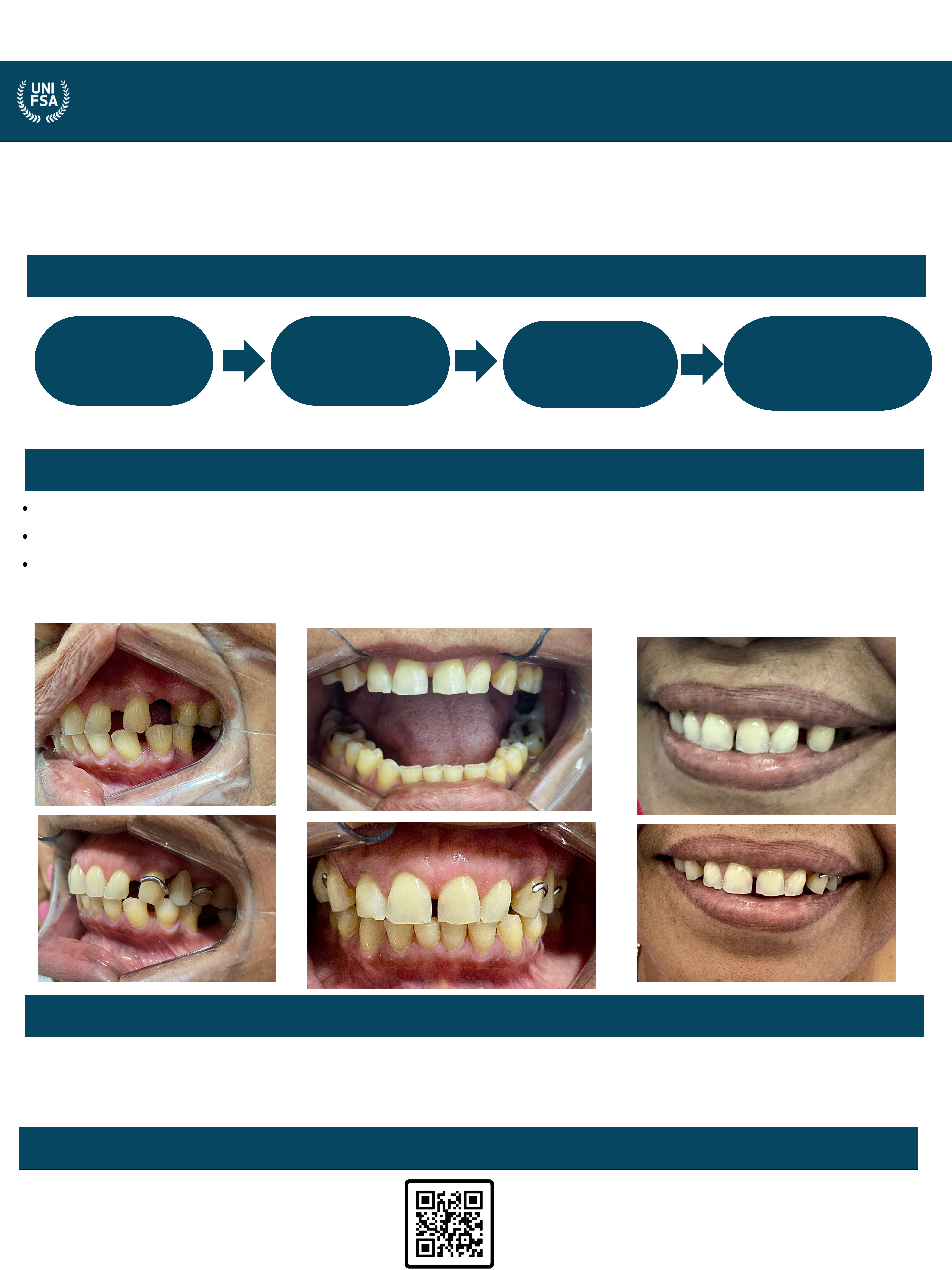 Introdução REABILITAÇÃO ORAL COM PPR - RELATO DE CASO Relato do caso Referências Considerações finais Devolver a estética Paciente LMSA, sexo feminino, 62 anos, compareceu a Clínica Escola Carolina Freitas Lira. Queixa principal a falta de dentes - “esses espaços me incomodam”. Foi confeccionada uma PPR superior,Classe III Mod 2, para sanar as necessidades da paciente, de acordo os preceitos científicos. Leticya Vitória Ferreira SANTANA 1, Maria Clara Leal GUIMARÃES 2. 1 Aluno de graduação, Centro Universitário Santo Agostinho (UNIFSA)- Teresina -PI 2 Aluno de graduação, Centro Universitário Santo Agostinho (UNIFSA)- Teresina - PI O trabalho descrito, demonstrou o sucesso da reabilitação, através de um bom planejamento e delineamento, garantindo suporte, estabilidade, retenção e satisfação da paciente. Função mastigatória Fonação Modalidade terapêutica mais utilizada Autores