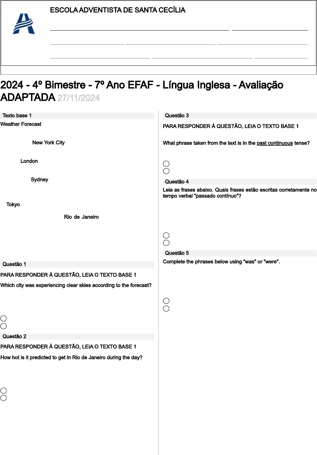 2024 - 4º Bimestre - 7º Ano EFAF - Língua Inglesa - Avaliação ADAPTADA 27/11/2024 Texto base 1 Weather Forecast Hey folks, time for your daily weather update! Let's take a look at what Mother Nature has in store for us around the globe. Starting off in New York City, it's looking partly cloudy with a high of 68°F (20°C) and a low of 52°F (11°C). Don't forget your light jacket if you're heading out! Over in London, expect some scattered showers throughout the day. Temperatures will hover around 55°F (13°C) for the high and dip down to 45°F (7°C) overnight. Better grab that umbrella! Heading to Sydney, Australia, it's going to be a sunny one! Temperatures will soar to a warm 80°F (27°C) during the day, perfect for hitting the beach. But be prepared for it to cool down to 65°F (18°C) after dark. In Tokyo, Japan, it's looking clear with a high of 70°F (21°C) and a low of 55°F (13°C). A great day for exploring the city's sights! And finally, let's check out Rio de Janeiro, Brazil. It's going to be hot and humid, with temperatures reaching up to 90°F (32°C) during the day and only dropping to 75°F (24°C) overnight. Stay hydrated, folks! That's it for today's weather roundup. Careful, it was raining here before we started. Wherever you are, make sure to dress appropriately and stay safe out there! a b Questão 1 PARA RESPONDER À QUESTÃO, LEIA O TEXTO BASE 1 Which city was experiencing clear skies according to the forecast? Tokyo Sydney a b Questão 2 PARA RESPONDER À QUESTÃO, LEIA O TEXTO BASE 1 How hot is it predicted to get in Rio de Janeiro during the day? 90°F (32°C) 68°F (20°C) a b Questão 3 PARA RESPONDER À QUESTÃO, LEIA O TEXTO BASE 1 What phrase taken from the text is in the past continuous tense? Careful, it was raining here before we started. And finally, let's check out Rio de Janeiro, Brazil. a b Questão 4 Leia as frases abaixo. Quais frases estão escritas corretamente no tempo verbal "passado contínuo"? a) Oswald were chasing that bat. b) Jason and Tommy were starting to like the color red. c) Joey was a very good pianist. Letter A, only. Letter B, only. a b Questão 5 Complete the phrases below using "was" or "were". a) She ______ studying for her exam all night. b) They _______ playing soccer when it started to rain. c) I ________ cooking dinner while listening to music. was - were - were was - were - was ESCOLA ADVENTISTA DE SANTA CECÍLIA Aluno(a): Matrícula: Data: Turma: Bimestre: Professor(a): Disciplina: Nota: a b Questão 6 Observe a imagem abaixo. Marque a opção de roupa que o homem está utilizando. Disponível em: https://www.vecteezy.com/photo/28925082-african- am erican-man-enjoys-the-winter-snowy-day-in-playful- emontional-dynamic-pose-ai-generative Earmuffs. Gloves.. Texto base 2 Extreme Conditions Extreme weather can be really scary and dangerous. One kind of extreme weather is a tornado. Imagine a big, spinning wind that can tear houses apart and toss cars around like toys. It's terrifying! Tornadoes often happen during thunderstorms. Another extreme weather event is a flood. When it rains a lot or when rivers overflow, water covers everything. Streets turn into rivers. Floods can make people lose their homes. Wildfires are another scary thing. They're big fires that happen in hot and dry places. Wildfires can destroy everything in their path, including homes and animals. Then there's the hurricane. It's like a giant storm with strong winds and heavy rain. Hurricanes are formed over warm ocean water and can cause huge waves and flooding when they reach land. They can be really destructive. Extreme weather can be very dangerous, but there are ways to stay safe. Pay attention to weather warnings, have an emergency plan, and listen to the advice of authorities. Nature is powerful, but we can prepare and protect ourselves as best as we can. a b c Questão 7 PARA RESPONDER À QUESTÃO, LEIA O TEXTO BASE 2 What extreme weather event is described as a big, spinning wind? Flood. Tornado . a b d Questão 8 PARA RESPONDER À QUESTÃO, LEIA O TEXTO BASE 2 What causes hurricanes to form? Warm ocean water. Strong winds. . a b Questão 9 PARA RESPONDER À QUESTÃO, LEIA O TEXTO BASE 2 How should people prepare for extreme weather events? Have an emergency plan. Always stay outside. a b Questão 10 Considering the use of when and while, choose the correct option: Michael had no time to run when the flood invaded his house. The population in town was fleeing when the tropical storm was advancing.