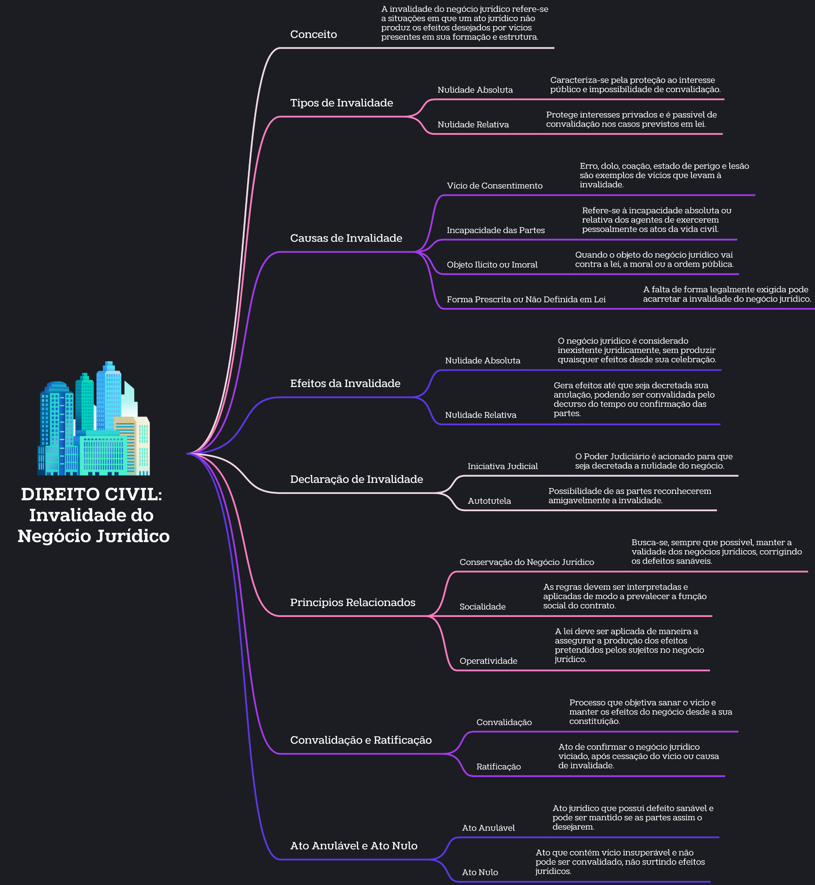 DIREITO CIVIL: Invalidade do Negócio Jurídico Conceito A invalidade do negócio jurídico refere-se a situações em que um ato jurídico não produz os efeitos desejados por vícios presentes em sua formação e estrutura. Tipos de Invalidade Nulidade Absoluta Caracteriza-se pela proteção ao interesse público e impossibilidade de convalidação. Nulidade Relativa Protege interesses privados e é passível de convalidação nos casos previstos em lei. Causas de Invalidade Vício de Consentimento Erro, dolo, coação, estado de perigo e lesão são exemplos de vícios que levam à invalidade. Incapacidade das Partes Refere-se à incapacidade absoluta ou relativa dos agentes de exercerem pessoalmente os atos da vida civil. Objeto Ilícito ou Imoral Quando o objeto do negócio jurídico vai contra a lei, a moral ou a ordem pública. Forma Prescrita ou Não Definida em Lei A falta de forma legalmente exigida pode acarretar a invalidade do negócio jurídico. Efeitos da Invalidade Nulidade Absoluta O negócio jurídico é considerado inexistente juridicamente, sem produzir quaisquer efeitos desde sua celebração. Nulidade Relativa Gera efeitos até que seja decretada sua anulação, podendo ser convalidada pelo decurso do tempo ou confirmação das partes. Declaração de Invalidade Iniciativa Judicial O Poder Judiciário é acionado para que seja decretada a nulidade do negócio. Autotutela Possibilidade de as partes reconhecerem amigavelmente a invalidade. Princípios Relacionados Conservação do Negócio Jurídico Busca-se, sempre que possível, manter a validade dos negócios jurídicos, corrigindo os defeitos sanáveis. Socialidade As regras devem ser interpretadas e aplicadas de modo a prevalecer a função social do contrato. Operatividade A lei deve ser aplicada de maneira a assegurar a produção dos efeitos pretendidos pelos sujeitos no negócio jurídico. Convalidação e Ratificação Convalidação Processo que objetiva sanar o vício e manter os efeitos do negócio desde a sua constituição. Ratificação Ato de confirmar o negócio jurídico viciado, após cessação do vício ou causa de invalidade. Ato Anulável e Ato Nulo Ato Anulável Ato jurídico que possui defeito sanável e pode ser mantido se as partes assim o desejarem. Ato Nulo Ato que contém vício insuperável e não pode ser convalidado, não surtindo efeitos jurídicos.