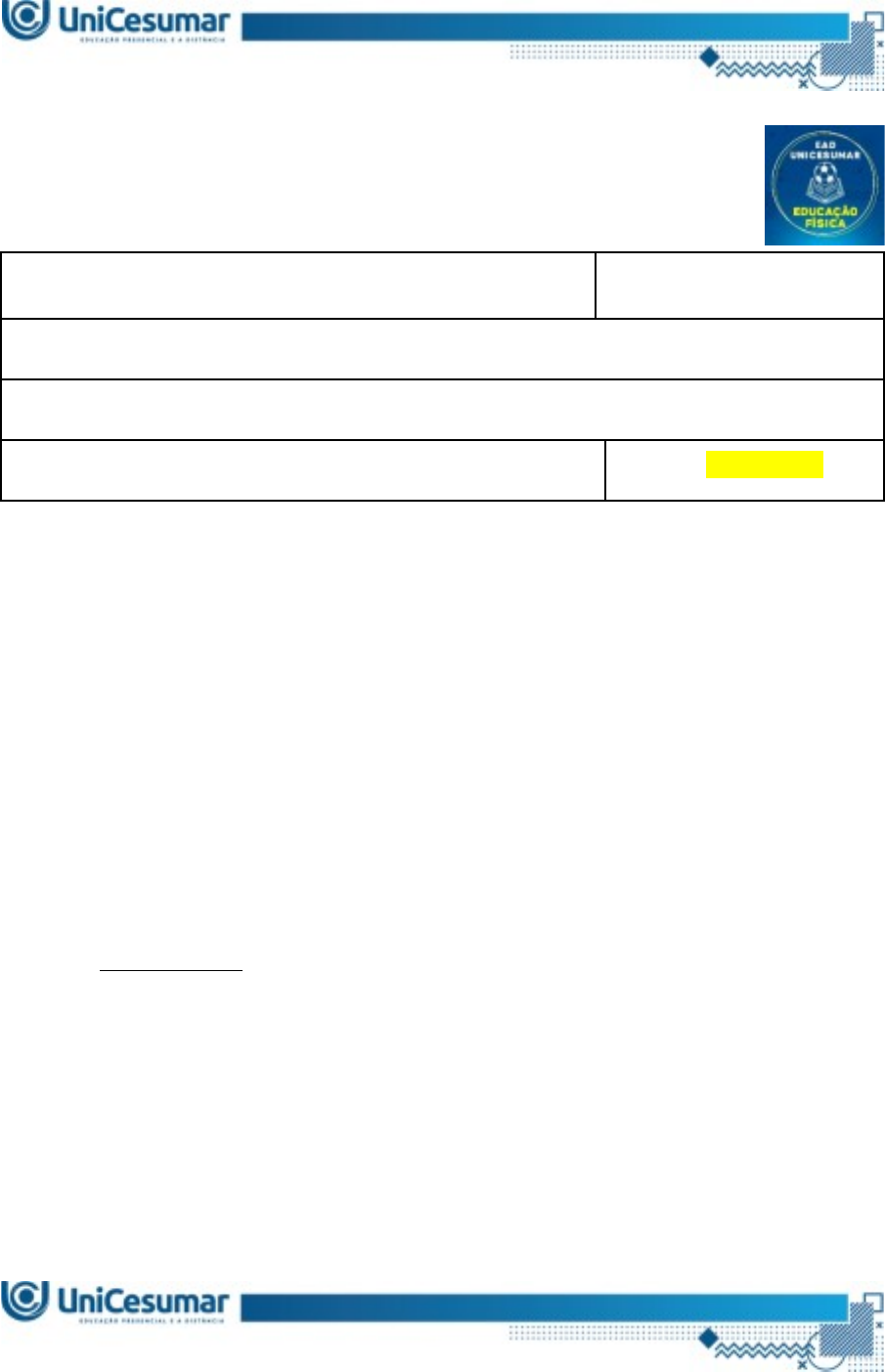 MAPA – Material de Avaliação Prática da Aprendizagem Acadêmico: Victor Gonçalves Espósito Ferreira R.A.22113341-5 Curso: EDUCAÇÃO FÍSICA - BACHARELADO Disciplina: MUSCULAÇÃO E EXERCÍCOOS RESISTIDOS Valor da atividade: 3,5 Prazo: 17/03/2024 Instruções para Realização da Atividade 1. Todos os campos acima deverão ser devidamente preenchidos; 2. É obrigatória a utilização deste formulário para a realização do MAPA; 3. Esta é uma atividade individual. Caso identificado cópia de colegas, o trabalho de ambos sofrerá decréscimo de nota; 4. Utilizando este formulário, realize sua atividade, salve em seu computador, renomeie e envie em forma de anexo; 5. Formatação exigida para esta atividade: documento Word, Fonte Arial ou Times New Roman tamanho 12, Espaçamento entre linhas 1,5, texto justificado; 6. Ao utilizar quaisquer materiais de pesquisa referencie conforme as normas da ABNT; 7. Na Sala do Café do ambiente virtual da disciplina você encontrará orientações importantes para elaboração desta atividade. Confira! 8. Critérios de avaliação: Utilização do template; Atendimento ao Tema; Constituição dos argumentos e organização das Ideias; Correção Gramatical e atendimento às normas ABNT. 9. Procure argumentar de forma clara e objetiva, de acordo com o conteúdo da disciplina. Em caso de dúvidas, entre em contato com seu Professor Mediador. Bons estudos! INSTRUÇÕES Olá, aluno(a) Antes de realizar as quatro tarefas e entregar esse arquivo, leia com atenção e siga as instruções abaixo: • Faça a leitura com calma e atenção de todas as tarefas e diante de dúvidas, pergunte ao professor mediador. • Utilize o livro (PDF) da disciplina como principal fonte de apoio. • Você deverá entregar esse arquivo em formato Word ou PDF. • Não exclua nenhuma página desse arquivo, apenas preencha os campos das respostas. • Antes de entregar, confira se o arquivo está correto. • Cópias parcial ou total serão zeradas. • Todas as atividades do curso são avaliadas conforme o que está sendo solicitado e as instruções fornecidas. Sendo assim, o descumprimento dessas orientações sempre acarreta algum desconto na nota. O músculo estriado esquelético é responsável pela movimentação do corpo humano e pela produção de força. A respeito da produção de força, ele pode manifestar diferentes tipos de força, a depender do trabalho muscular realizado. Essas manifestações podem ser na forma de força máxima, resistência de força e potência muscular (força explosiva), ou ainda, a hipertrofia muscular, que não necessariamente está ligada à força, mas ao volume muscular ocasionado por ela. Fonte: OLIVEIRA, D. V. Musculação e exercícios resistidos. Maringá: UniCesumar, 2021. Uma vez que é fundamental que o profissional de educação física compreenda as diferentes manifestações da força e saiba como estimular cada uma delas, nesta atividade MAPA suponha que você está estagiando em uma academia, e o professor responsável pela elaboração dos treinos dos alunos da musculação lhe trouxe 2 perfis de alunos diferentes. Você deverá analisar esses perfis e responder perguntas sobre eles. PERFIL 1 Aluno(a): Matheus Sexo: masculino Idade: 28 Especificações: Matheus treina musculação há 2 ano, pratica com o objetivo estético e busca de hipertrofia muscular. Em seu novo período de treino, Matheus será submetido a sessões de treinamento para estimular sua força máxima. Objetivo do treino resistido: aumentar a produção de força máxima. Nível de experiência na musculação: avançado. Alguns dados da avaliação da força muscular: - Teste submáximo para predizer o 1-RM no Leg Press. Peso utilizado no teste: 300 kg. Número de repetições: 5. - Teste submáximo para predizer o 1-RM no Supino Reto. Peso utilizado no teste: 110 kg. Número de repetições: 3. PERFIL 2 Aluno(a): Aline Sexo: feminino Idade: 63 Especificações: Aline têm osteoporose e por recomendação médica está iniciando o treino na musculação. Além desta condição, Aline não apresenta nenhuma outra morbidade que lhe impeça de realizar o exercício físico. Objetivo do treino resistido: melhorar sua condição de saúde. Nível de experiência na musculação: iniciante. Alguns dados da avaliação da força muscular: - Teste submáximo para predizer o 1-RM no Leg Press. Peso utilizado no teste: 40 kg. Número de repetições: 10. - Teste submáximo para predizer o 1-RM no Puxador Frente. Peso utilizado no teste: 20 kg. Número de repetições: 8. Com base nesse entendimento e na análise do perfil dos dois indivíduos descritos anteriormente, responda às questões que seguem. Antes de prosseguir, muita atenção: saiba que é recomendado que o treinamento resistido, na musculação, seja prescrito de acordo com objetivos e necessidades de cada pessoa, assim como que seja elaborado com base na avaliação das cargas máximas ou submáximas (utilizando percentuais) de força. 1. Analisando o objetivo de Matheus (Perfil 1), o treinamento resistido será destinado ao desenvolvimento de qual tipo de força? R: Aumentar a produção de força. 2. Com base nas informações sobre Matheus (Perfil 1), calcule a carga predita de 1- RM para os exercícios Leg Press e Supino Reto (utilize a fórmula de Prestes et al. (2015)). Descreva todos os cálculos completos 3. Considerando as especificações, o nível de experiência, assim como o objetivo de Matheus (Perfil 1), prescreva as variáveis intensidade e volume, descrevendo a carga e as repetições, para cada um dos exercícios. Para responder a essa questão, preencha a ficha de musculação seguindo as informações a seguir: - Você planejará parte de uma sessão de treino, composta de 2 exercícios: Leg Press e Supino Reto. - Intensidade: a carga será prescrita de acordo com o resultado do 1-RM predito; ela deve ser definida dentro da faixa percentual recomenda para o desenvolvi