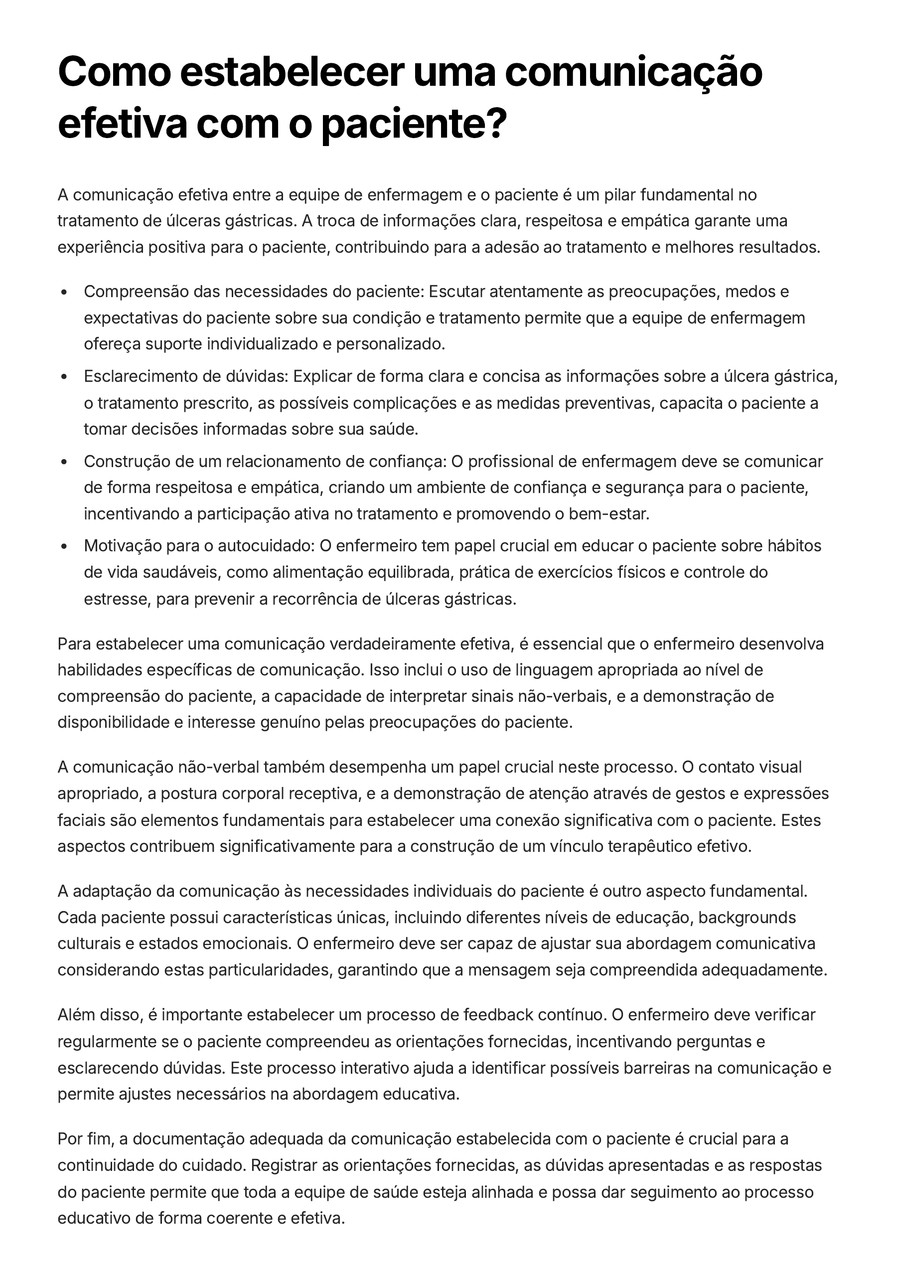 Como estabelecer uma comunicação efetiva com o paciente? A comunicação efetiva entre a equipe de enfermagem e o paciente é um pilar fundamental no tratamento de úlceras gástricas. A troca de informações clara, respeitosa e empática garante uma experiência positiva para o paciente, contribuindo para a adesão ao tratamento e melhores resultados. Compreensão das necessidades do paciente: Escutar atentamente as preocupações, medos e expectativas do paciente sobre sua condição e tratamento permite que a equipe de enfermagem ofereça suporte individualizado e personalizado. Esclarecimento de dúvidas: Explicar de forma clara e concisa as informações sobre a úlcera gástrica, o tratamento prescrito, as possíveis complicações e as medidas preventivas, capacita o paciente a tomar decisões informadas sobre sua saúde. Construção de um relacionamento de confiança: O profissional de enfermagem deve se comunicar de forma respeitosa e empática, criando um ambiente de confiança e segurança para o paciente, incentivando a participação ativa no tratamento e promovendo o bem-estar. Motivação para o autocuidado: O enfermeiro tem papel crucial em educar o paciente sobre hábitos de vida saudáveis, como alimentação equilibrada, prática de exercícios físicos e controle do estresse, para prevenir a recorrência de úlceras gástricas. Para estabelecer uma comunicação verdadeiramente efetiva, é essencial que o enfermeiro desenvolva habilidades específicas de comunicação. Isso inclui o uso de linguagem apropriada ao nível de compreensão do paciente, a capacidade de interpretar sinais não-verbais, e a demonstração de disponibilidade e interesse genuíno pelas preocupações do paciente. A comunicação não-verbal também desempenha um papel crucial neste processo. O contato visual apropriado, a postura corporal receptiva, e a demonstração de atenção através de gestos e expressões faciais são elementos fundamentais para estabelecer uma conexão significativa com o paciente. Estes aspectos contribuem significativamente para a construção de um vínculo terapêutico efetivo. A adaptação da comunicação às necessidades individuais do paciente é outro aspecto fundamental. Cada paciente possui características únicas, incluindo diferentes níveis de educação, backgrounds culturais e estados emocionais. O enfermeiro deve ser capaz de ajustar sua abordagem comunicativa considerando estas particularidades, garantindo que a mensagem seja compreendida adequadamente. Além disso, é importante estabelecer um processo de feedback contínuo. O enfermeiro deve verificar regularmente se o paciente compreendeu as orientações fornecidas, incentivando perguntas e esclarecendo dúvidas. Este processo interativo ajuda a identificar possíveis barreiras na comunicação e permite ajustes necessários na abordagem educativa. Por fim, a documentação adequada da comunicação estabelecida com o paciente é crucial para a continuidade do cuidado. Registrar as orientações fornecidas, as dúvidas apresentadas e as respostas do paciente permite que toda a equipe de saúde esteja alinhada e possa dar seguimento ao processo educativo de forma coerente e efetiva.