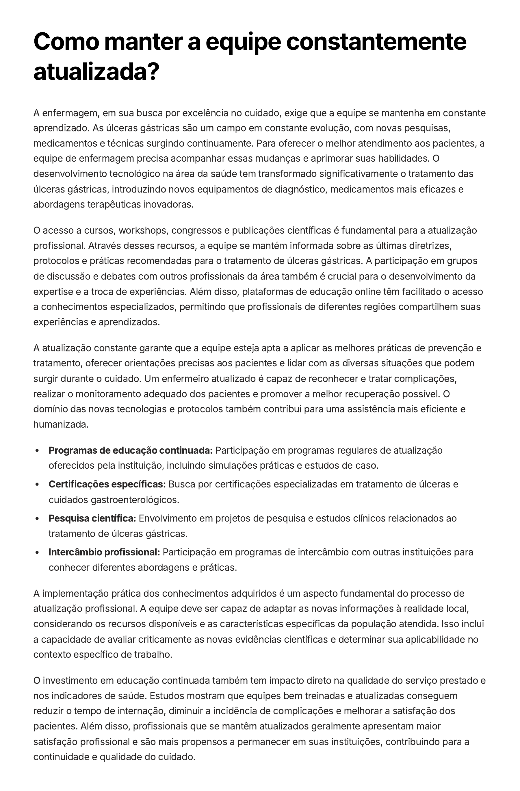Como manter a equipe constantemente atualizada? A enfermagem, em sua busca por excelência no cuidado, exige que a equipe se mantenha em constante aprendizado. As úlceras gástricas são um campo em constante evolução, com novas pesquisas, medicamentos e técnicas surgindo continuamente. Para oferecer o melhor atendimento aos pacientes, a equipe de enfermagem precisa acompanhar essas mudanças e aprimorar suas habilidades. O desenvolvimento tecnológico na área da saúde tem transformado significativamente o tratamento das úlceras gástricas, introduzindo novos equipamentos de diagnóstico, medicamentos mais eficazes e abordagens terapêuticas inovadoras. O acesso a cursos, workshops, congressos e publicações científicas é fundamental para a atualização profissional. Através desses recursos, a equipe se mantém informada sobre as últimas diretrizes, protocolos e práticas recomendadas para o tratamento de úlceras gástricas. A participação em grupos de discussão e debates com outros profissionais da área também é crucial para o desenvolvimento da expertise e a troca de experiências. Além disso, plataformas de educação online têm facilitado o acesso a conhecimentos especializados, permitindo que profissionais de diferentes regiões compartilhem suas experiências e aprendizados. A atualização constante garante que a equipe esteja apta a aplicar as melhores práticas de prevenção e tratamento, oferecer orientações precisas aos pacientes e lidar com as diversas situações que podem surgir durante o cuidado. Um enfermeiro atualizado é capaz de reconhecer e tratar complicações, realizar o monitoramento adequado dos pacientes e promover a melhor recuperação possível. O domínio das novas tecnologias e protocolos também contribui para uma assistência mais eficiente e humanizada. Programas de educação continuada: Participação em programas regulares de atualização oferecidos pela instituição, incluindo simulações práticas e estudos de caso. Certificações específicas: Busca por certificações especializadas em tratamento de úlceras e cuidados gastroenterológicos. Pesquisa científica: Envolvimento em projetos de pesquisa e estudos clínicos relacionados ao tratamento de úlceras gástricas. Intercâmbio profissional: Participação em programas de intercâmbio com outras instituições para conhecer diferentes abordagens e práticas. A implementação prática dos conhecimentos adquiridos é um aspecto fundamental do processo de atualização profissional. A equipe deve ser capaz de adaptar as novas informações à realidade local, considerando os recursos disponíveis e as características específicas da população atendida. Isso inclui a capacidade de avaliar criticamente as novas evidências científicas e determinar sua aplicabilidade no contexto específico de trabalho. O investimento em educação continuada também tem impacto direto na qualidade do serviço prestado e nos indicadores de saúde. Estudos mostram que equipes bem treinadas e atualizadas conseguem reduzir o tempo de internação, diminuir a incidência de complicações e melhorar a satisfação dos pacientes. Além disso, profissionais que se mantêm atualizados geralmente apresentam maior satisfação profissional e são mais propensos a permanecer em suas instituições, contribuindo para a continuidade e qualidade do cuidado.