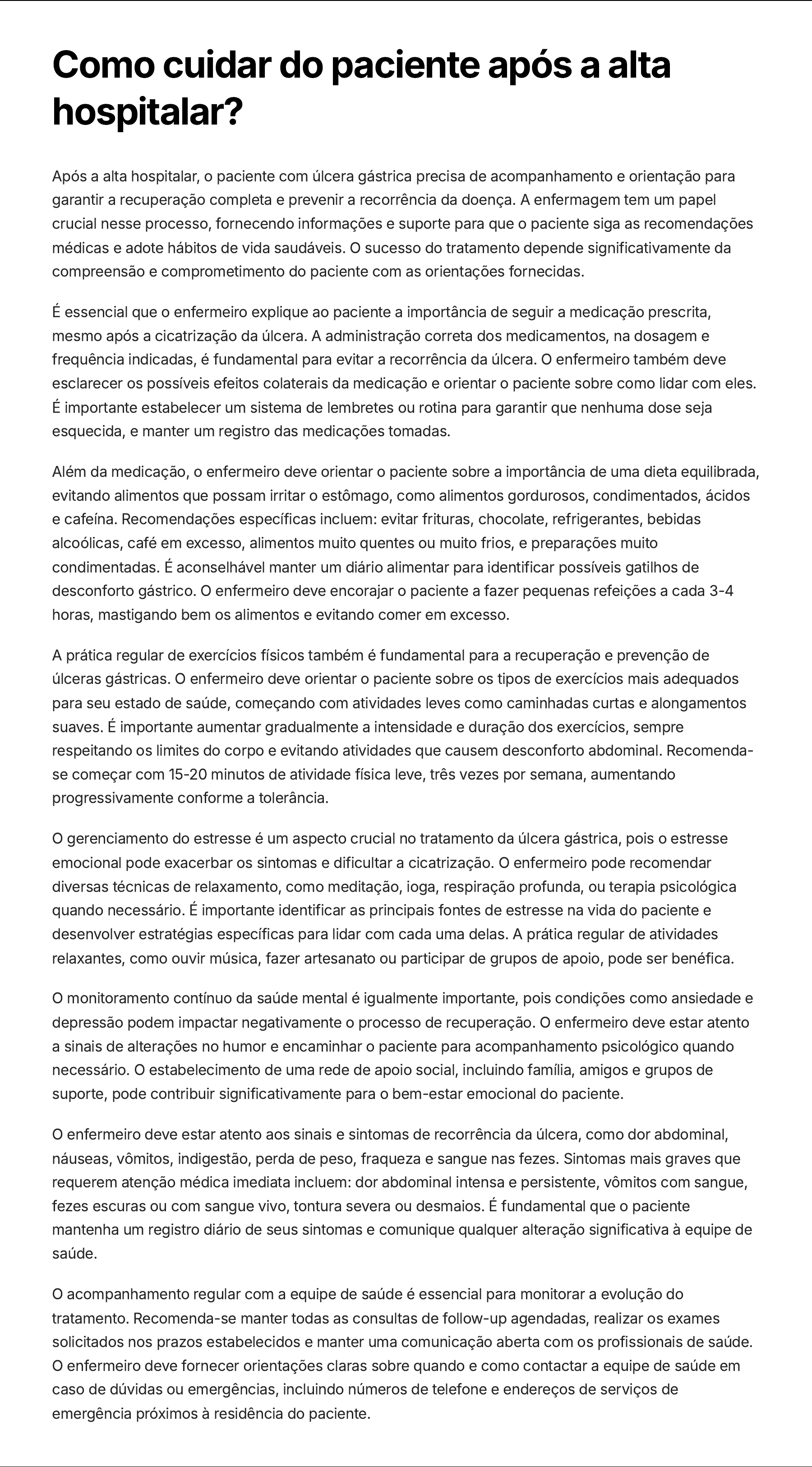 Como cuidar do paciente após a alta hospitalar? Após a alta hospitalar, o paciente com úlcera gástrica precisa de acompanhamento e orientação para garantir a recuperação completa e prevenir a recorrência da doença. A enfermagem tem um papel crucial nesse processo, fornecendo informações e suporte para que o paciente siga as recomendações médicas e adote hábitos de vida saudáveis. O sucesso do tratamento depende significativamente da compreensão e comprometimento do paciente com as orientações fornecidas. É essencial que o enfermeiro explique ao paciente a importância de seguir a medicação prescrita, mesmo após a cicatrização da úlcera. A administração correta dos medicamentos, na dosagem e frequência indicadas, é fundamental para evitar a recorrência da úlcera. O enfermeiro também deve esclarecer os possíveis efeitos colaterais da medicação e orientar o paciente sobre como lidar com eles. É importante estabelecer um sistema de lembretes ou rotina para garantir que nenhuma dose seja esquecida, e manter um registro das medicações tomadas. Além da medicação, o enfermeiro deve orientar o paciente sobre a importância de uma dieta equilibrada, evitando alimentos que possam irritar o estômago, como alimentos gordurosos, condimentados, ácidos e cafeína. Recomendações específicas incluem: evitar frituras, chocolate, refrigerantes, bebidas alcoólicas, café em excesso, alimentos muito quentes ou muito frios, e preparações muito condimentadas. É aconselhável manter um diário alimentar para identificar possíveis gatilhos de desconforto gástrico. O enfermeiro deve encorajar o paciente a fazer pequenas refeições a cada 3-4 horas, mastigando bem os alimentos e evitando comer em excesso. A prática regular de exercícios físicos também é fundamental para a recuperação e prevenção de úlceras gástricas. O enfermeiro deve orientar o paciente sobre os tipos de exercícios mais adequados para seu estado de saúde, começando com atividades leves como caminhadas curtas e alongamentos suaves. É importante aumentar gradualmente a intensidade e duração dos exercícios, sempre respeitando os limites do corpo e evitando atividades que causem desconforto abdominal. Recomenda- se começar com 15-20 minutos de atividade física leve, três vezes por semana, aumentando progressivamente conforme a tolerância. O gerenciamento do estresse é um aspecto crucial no tratamento da úlcera gástrica, pois o estresse emocional pode exacerbar os sintomas e dificultar a cicatrização. O enfermeiro pode recomendar diversas técnicas de relaxamento, como meditação, ioga, respiração profunda, ou terapia psicológica quando necessário. É importante identificar as principais fontes de estresse na vida do paciente e desenvolver estratégias específicas para lidar com cada uma delas. A prática regular de atividades relaxantes, como ouvir música, fazer artesanato ou participar de grupos de apoio, pode ser benéfica. O monitoramento contínuo da saúde mental é igualmente importante, pois condições como ansiedade e depressão podem impactar negativamente o processo de recuperação. O enfermeiro deve estar atento a sinais de alterações no humor e encaminhar o paciente para acompanhamento psicológico quando necessário. O estabelecimento de uma rede de apoio social, incluindo família, amigos e grupos de suporte, pode contribuir significativamente para o bem-estar emocional do paciente. O enfermeiro deve estar atento aos sinais e sintomas de recorrência da úlcera, como dor abdominal, náuseas, vômitos, indigestão, perda de peso, fraqueza e sangue nas fezes. Sintomas mais graves que requerem atenção médica imediata incluem: dor abdominal intensa e persistente, vômitos com sangue, fezes escuras ou com sangue vivo, tontura severa ou desmaios. É fundamental que o paciente mantenha um registro diário de seus sintomas e comunique qualquer alteração significativa à equipe de saúde. O acompanhamento regular com a equipe de saúde é essencial para monitorar a evolução do tratamento. Recomenda-se manter todas as consultas de follow-up agendadas, realizar os exames solicitados nos prazos estabelecidos e manter uma comunicação aberta com os profissionais de saúde. O enfermeiro deve fornecer orientações claras sobre quando e como contactar a equipe de saúde em caso de dúvidas ou emergências, incluindo números de telefone e endereços de serviços de emergência próximos à residência do paciente.