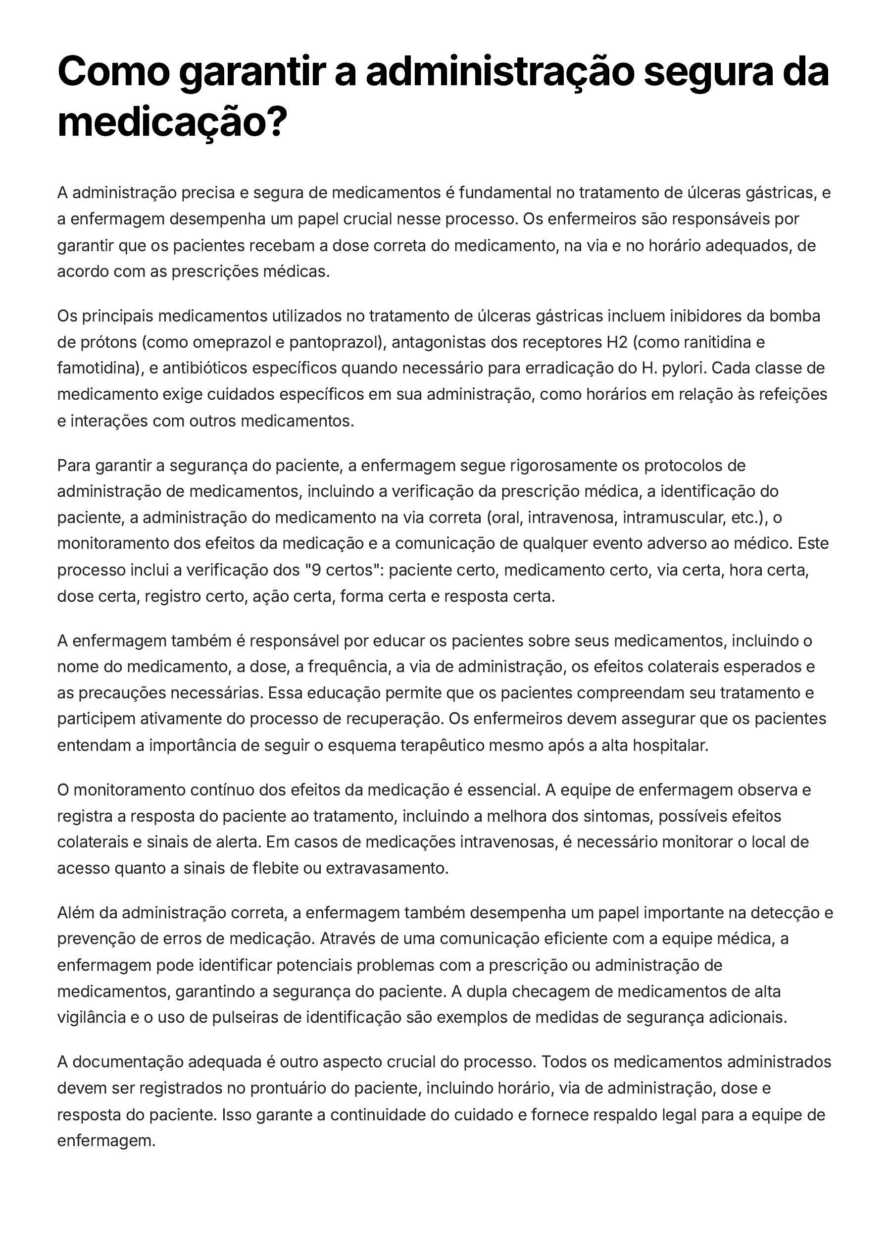 Como garantir a administração segura da medicação? A administração precisa e segura de medicamentos é fundamental no tratamento de úlceras gástricas, e a enfermagem desempenha um papel crucial nesse processo. Os enfermeiros são responsáveis por garantir que os pacientes recebam a dose correta do medicamento, na via e no horário adequados, de acordo com as prescrições médicas. Os principais medicamentos utilizados no tratamento de úlceras gástricas incluem inibidores da bomba de prótons (como omeprazol e pantoprazol), antagonistas dos receptores H2 (como ranitidina e famotidina), e antibióticos específicos quando necessário para erradicação do H. pylori. Cada classe de medicamento exige cuidados específicos em sua administração, como horários em relação às refeições e interações com outros medicamentos. Para garantir a segurança do paciente, a enfermagem segue rigorosamente os protocolos de administração de medicamentos, incluindo a verificação da prescrição médica, a identificação do paciente, a administração do medicamento na via correta (oral, intravenosa, intramuscular, etc.), o monitoramento dos efeitos da medicação e a comunicação de qualquer evento adverso ao médico. Este processo inclui a verificação dos "9 certos": paciente certo, medicamento certo, via certa, hora certa, dose certa, registro certo, ação certa, forma certa e resposta certa. A enfermagem também é responsável por educar os pacientes sobre seus medicamentos, incluindo o nome do medicamento, a dose, a frequência, a via de administração, os efeitos colaterais esperados e as precauções necessárias. Essa educação permite que os pacientes compreendam seu tratamento e participem ativamente do processo de recuperação. Os enfermeiros devem assegurar que os pacientes entendam a importância de seguir o esquema terapêutico mesmo após a alta hospitalar. O monitoramento contínuo dos efeitos da medicação é essencial. A equipe de enfermagem observa e registra a resposta do paciente ao tratamento, incluindo a melhora dos sintomas, possíveis efeitos colaterais e sinais de alerta. Em casos de medicações intravenosas, é necessário monitorar o local de acesso quanto a sinais de flebite ou extravasamento. Além da administração correta, a enfermagem também desempenha um papel importante na detecção e prevenção de erros de medicação. Através de uma comunicação eficiente com a equipe médica, a enfermagem pode identificar potenciais problemas com a prescrição ou administração de medicamentos, garantindo a segurança do paciente. A dupla checagem de medicamentos de alta vigilância e o uso de pulseiras de identificação são exemplos de medidas de segurança adicionais. A documentação adequada é outro aspecto crucial do processo. Todos os medicamentos administrados devem ser registrados no prontuário do paciente, incluindo horário, via de administração, dose e resposta do paciente. Isso garante a continuidade do cuidado e fornece respaldo legal para a equipe de enfermagem.