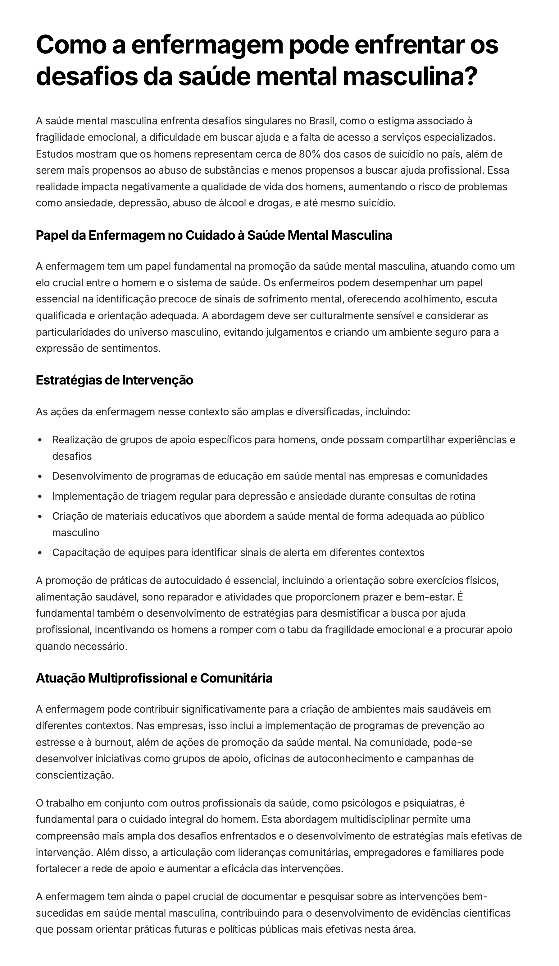 Como a enfermagem pode enfrentar os desafios da saúde mental masculina? A saúde mental masculina enfrenta desafios singulares no Brasil, como o estigma associado à fragilidade emocional, a dificuldade em buscar ajuda e a falta de acesso a serviços especializados. Estudos mostram que os homens representam cerca de 80% dos casos de suicídio no país, além de serem mais propensos ao abuso de substâncias e menos propensos a buscar ajuda profissional. Essa realidade impacta negativamente a qualidade de vida dos homens, aumentando o risco de problemas como ansiedade, depressão, abuso de álcool e drogas, e até mesmo suicídio. Papel da Enfermagem no Cuidado à Saúde Mental Masculina A enfermagem tem um papel fundamental na promoção da saúde mental masculina, atuando como um elo crucial entre o homem e o sistema de saúde. Os enfermeiros podem desempenhar um papel essencial na identificação precoce de sinais de sofrimento mental, oferecendo acolhimento, escuta qualificada e orientação adequada. A abordagem deve ser culturalmente sensível e considerar as particularidades do universo masculino, evitando julgamentos e criando um ambiente seguro para a expressão de sentimentos. Estratégias de Intervenção As ações da enfermagem nesse contexto são amplas e diversificadas, incluindo: Realização de grupos de apoio específicos para homens, onde possam compartilhar experiências e desafios Desenvolvimento de programas de educação em saúde mental nas empresas e comunidades Implementação de triagem regular para depressão e ansiedade durante consultas de rotina Criação de materiais educativos que abordem a saúde mental de forma adequada ao público masculino Capacitação de equipes para identificar sinais de alerta em diferentes contextos A promoção de práticas de autocuidado é essencial, incluindo a orientação sobre exercícios físicos, alimentação saudável, sono reparador e atividades que proporcionem prazer e bem-estar. É fundamental também o desenvolvimento de estratégias para desmistificar a busca por ajuda profissional, incentivando os homens a romper com o tabu da fragilidade emocional e a procurar apoio quando necessário. Atuação Multiprofissional e Comunitária A enfermagem pode contribuir significativamente para a criação de ambientes mais saudáveis em diferentes contextos. Nas empresas, isso inclui a implementação de programas de prevenção ao estresse e à burnout, além de ações de promoção da saúde mental. Na comunidade, pode-se desenvolver iniciativas como grupos de apoio, oficinas de autoconhecimento e campanhas de conscientização. O trabalho em conjunto com outros profissionais da saúde, como psicólogos e psiquiatras, é fundamental para o cuidado integral do homem. Esta abordagem multidisciplinar permite uma compreensão mais ampla dos desafios enfrentados e o desenvolvimento de estratégias mais efetivas de intervenção. Além disso, a articulação com lideranças comunitárias, empregadores e familiares pode fortalecer a rede de apoio e aumentar a eficácia das intervenções. A enfermagem tem ainda o papel crucial de documentar e pesquisar sobre as intervenções bem- sucedidas em saúde mental masculina, contribuindo para o desenvolvimento de evidências científicas que possam orientar práticas futuras e políticas públicas mais efetivas nesta área.