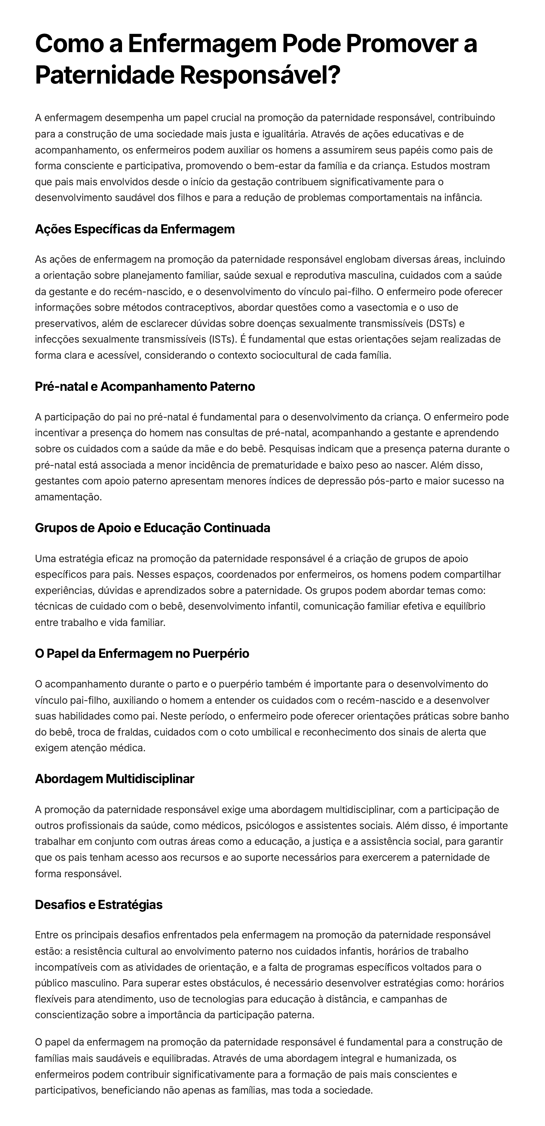 Como a Enfermagem Pode Promover a Paternidade Responsável? A enfermagem desempenha um papel crucial na promoção da paternidade responsável, contribuindo para a construção de uma sociedade mais justa e igualitária. Através de ações educativas e de acompanhamento, os enfermeiros podem auxiliar os homens a assumirem seus papéis como pais de forma consciente e participativa, promovendo o bem-estar da família e da criança. Estudos mostram que pais mais envolvidos desde o início da gestação contribuem significativamente para o desenvolvimento saudável dos filhos e para a redução de problemas comportamentais na infância. Ações Específicas da Enfermagem As ações de enfermagem na promoção da paternidade responsável englobam diversas áreas, incluindo a orientação sobre planejamento familiar, saúde sexual e reprodutiva masculina, cuidados com a saúde da gestante e do recém-nascido, e o desenvolvimento do vínculo pai-filho. O enfermeiro pode oferecer informações sobre métodos contraceptivos, abordar questões como a vasectomia e o uso de preservativos, além de esclarecer dúvidas sobre doenças sexualmente transmissíveis (DSTs) e infecções sexualmente transmissíveis (ISTs). É fundamental que estas orientações sejam realizadas de forma clara e acessível, considerando o contexto sociocultural de cada família. Pré-natal e Acompanhamento Paterno A participação do pai no pré-natal é fundamental para o desenvolvimento da criança. O enfermeiro pode incentivar a presença do homem nas consultas de pré-natal, acompanhando a gestante e aprendendo sobre os cuidados com a saúde da mãe e do bebê. Pesquisas indicam que a presença paterna durante o pré-natal está associada a menor incidência de prematuridade e baixo peso ao nascer. Além disso, gestantes com apoio paterno apresentam menores índices de depressão pós-parto e maior sucesso na amamentação. Grupos de Apoio e Educação Continuada Uma estratégia eficaz na promoção da paternidade responsável é a criação de grupos de apoio específicos para pais. Nesses espaços, coordenados por enfermeiros, os homens podem compartilhar experiências, dúvidas e aprendizados sobre a paternidade. Os grupos podem abordar temas como: técnicas de cuidado com o bebê, desenvolvimento infantil, comunicação familiar efetiva e equilíbrio entre trabalho e vida familiar. O Papel da Enfermagem no Puerpério O acompanhamento durante o parto e o puerpério também é importante para o desenvolvimento do vínculo pai-filho, auxiliando o homem a entender os cuidados com o recém-nascido e a desenvolver suas habilidades como pai. Neste período, o enfermeiro pode oferecer orientações práticas sobre banho do bebê, troca de fraldas, cuidados com o coto umbilical e reconhecimento dos sinais de alerta que exigem atenção médica. Abordagem Multidisciplinar A promoção da paternidade responsável exige uma abordagem multidisciplinar, com a participação de outros profissionais da saúde, como médicos, psicólogos e assistentes sociais. Além disso, é importante trabalhar em conjunto com outras áreas como a educação, a justiça e a assistência social, para garantir que os pais tenham acesso aos recursos e ao suporte necessários para exercerem a paternidade de forma responsável. Desafios e Estratégias Entre os principais desafios enfrentados pela enfermagem na promoção da paternidade responsável estão: a resistência cultural ao envolvimento paterno nos cuidados infantis, horários de trabalho incompatíveis com as atividades de orientação, e a falta de programas específicos voltados para o público masculino. Para superar estes obstáculos, é necessário desenvolver estratégias como: horários flexíveis para atendimento, uso de tecnologias para educação à distância, e campanhas de conscientização sobre a importância da participação paterna. O papel da enfermagem na promoção da paternidade responsável é fundamental para a construção de famílias mais saudáveis e equilibradas. Através de uma abordagem integral e humanizada, os enfermeiros podem contribuir significativamente para a formação de pais mais conscientes e participativos, beneficiando não apenas as famílias, mas toda a sociedade.