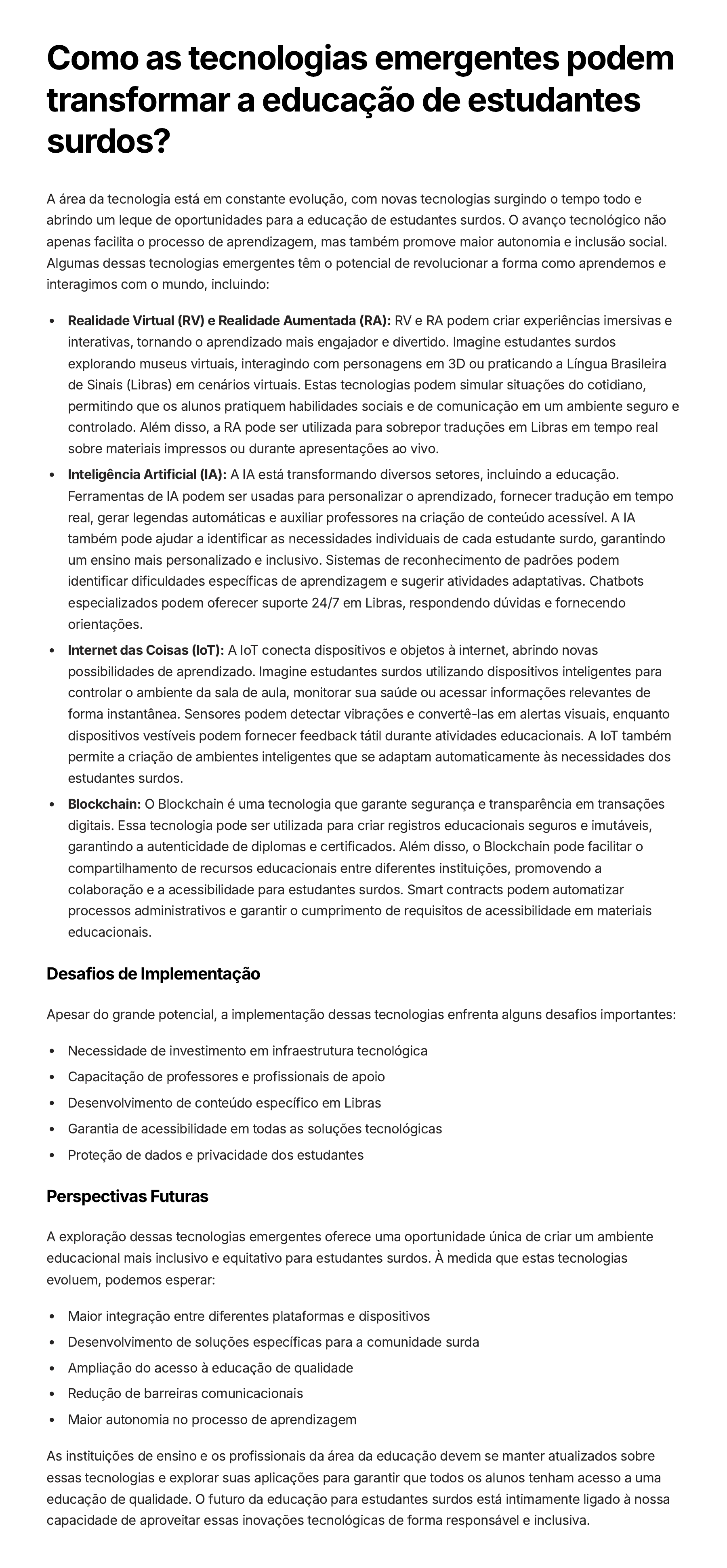 Como as tecnologias emergentes podem transformar a educação de estudantes surdos? A área da tecnologia está em constante evolução, com novas tecnologias surgindo o tempo todo e abrindo um leque de oportunidades para a educação de estudantes surdos. O avanço tecnológico não apenas facilita o processo de aprendizagem, mas também promove maior autonomia e inclusão social. Algumas dessas tecnologias emergentes têm o potencial de revolucionar a forma como aprendemos e interagimos com o mundo, incluindo: Realidade Virtual (RV) e Realidade Aumentada (RA): RV e RA podem criar experiências imersivas e interativas, tornando o aprendizado mais engajador e divertido. Imagine estudantes surdos explorando museus virtuais, interagindo com personagens em 3D ou praticando a Língua Brasileira de Sinais (Libras) em cenários virtuais. Estas tecnologias podem simular situações do cotidiano, permitindo que os alunos pratiquem habilidades sociais e de comunicação em um ambiente seguro e controlado. Além disso, a RA pode ser utilizada para sobrepor traduções em Libras em tempo real sobre materiais impressos ou durante apresentações ao vivo. Inteligência Artificial (IA): A IA está transformando diversos setores, incluindo a educação. Ferramentas de IA podem ser usadas para personalizar o aprendizado, fornecer tradução em tempo real, gerar legendas automáticas e auxiliar professores na criação de conteúdo acessível. A IA também pode ajudar a identificar as necessidades individuais de cada estudante surdo, garantindo um ensino mais personalizado e inclusivo. Sistemas de reconhecimento de padrões podem identificar dificuldades específicas de aprendizagem e sugerir atividades adaptativas. Chatbots especializados podem oferecer suporte 24/7 em Libras, respondendo dúvidas e fornecendo orientações. Internet das Coisas (IoT): A IoT conecta dispositivos e objetos à internet, abrindo novas possibilidades de aprendizado. Imagine estudantes surdos utilizando dispositivos inteligentes para controlar o ambiente da sala de aula, monitorar sua saúde ou acessar informações relevantes de forma instantânea. Sensores podem detectar vibrações e convertê-las em alertas visuais, enquanto dispositivos vestíveis podem fornecer feedback tátil durante atividades educacionais. A IoT também permite a criação de ambientes inteligentes que se adaptam automaticamente às necessidades dos estudantes surdos. Blockchain: O Blockchain é uma tecnologia que garante segurança e transparência em transações digitais. Essa tecnologia pode ser utilizada para criar registros educacionais seguros e imutáveis, garantindo a autenticidade de diplomas e certificados. Além disso, o Blockchain pode facilitar o compartilhamento de recursos educacionais entre diferentes instituições, promovendo a colaboração e a acessibilidade para estudantes surdos. Smart contracts podem automatizar processos administrativos e garantir o cumprimento de requisitos de acessibilidade em materiais educacionais. Desafios de Implementação Apesar do grande potencial, a implementação dessas tecnologias enfrenta alguns desafios importantes: Necessidade de investimento em infraestrutura tecnológica Capacitação de professores e profissionais de apoio Desenvolvimento de conteúdo específico em Libras Garantia de acessibilidade em todas as soluções tecnológicas Proteção de dados e privacidade dos estudantes Perspectivas Futuras A exploração dessas tecnologias emergentes oferece uma oportunidade única de criar um ambiente educacional mais inclusivo e equitativo para estudantes surdos. À medida que estas tecnologias evoluem, podemos esperar: Maior integração entre diferentes plataformas e dispositivos Desenvolvimento de soluções específicas para a comunidade surda Ampliação do acesso à educação de qualidade Redução de barreiras comunicacionais Maior autonomia no processo de aprendizagem As instituições de ensino e os profissionais da área da educação devem se manter atualizados sobre essas tecnologias e explorar suas aplicações para garantir que todos os alunos tenham acesso a uma educação de qualidade. O futuro da educação para estudantes surdos está intimamente ligado à nossa capacidade de aproveitar essas inovações tecnológicas de forma responsável e inclusiva.