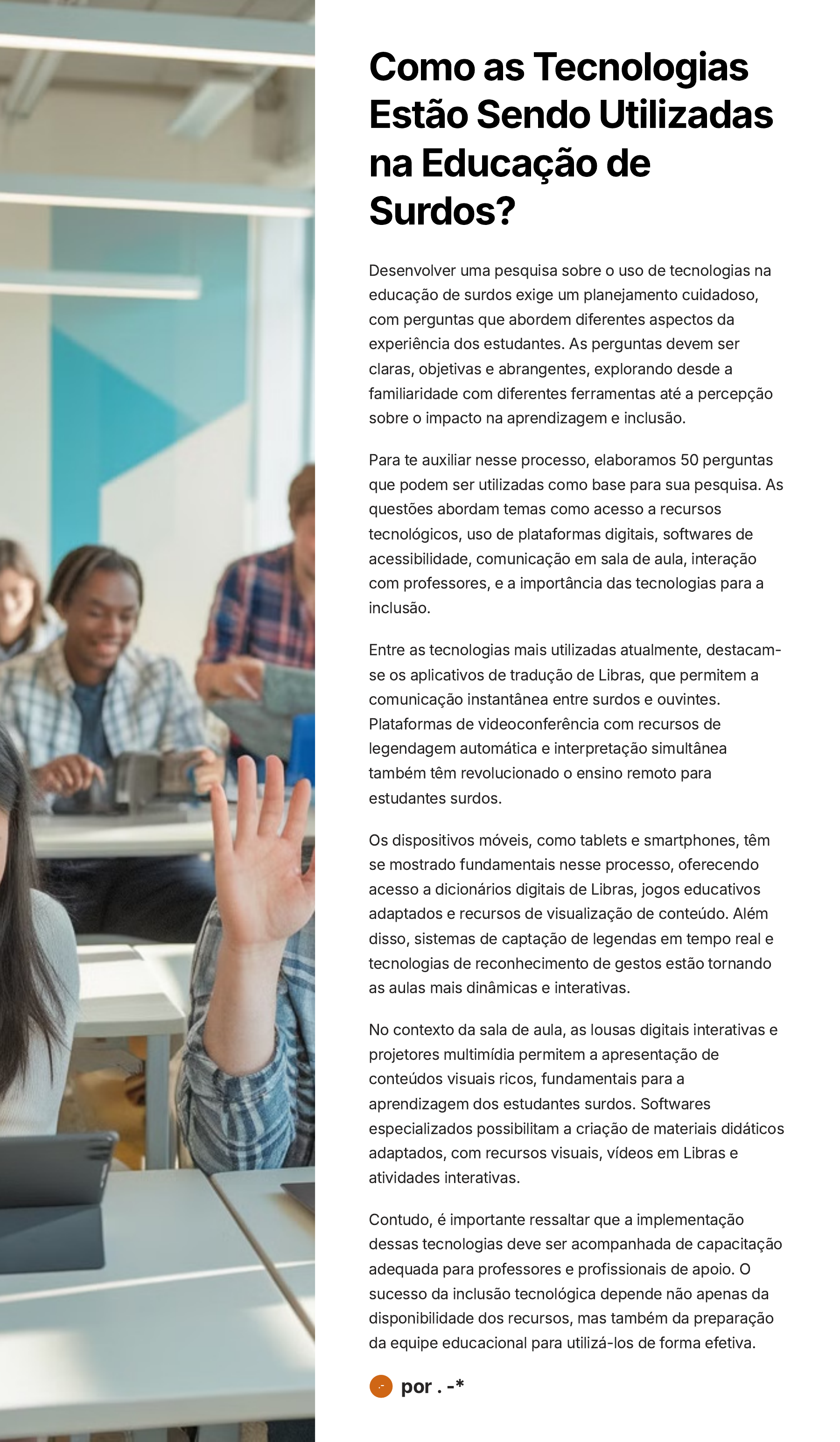 Como as Tecnologias Estão Sendo Utilizadas na Educação de Surdos? Desenvolver uma pesquisa sobre o uso de tecnologias na educação de surdos exige um planejamento cuidadoso, com perguntas que abordem diferentes aspectos da experiência dos estudantes. As perguntas devem ser claras, objetivas e abrangentes, explorando desde a familiaridade com diferentes ferramentas até a percepção sobre o impacto na aprendizagem e inclusão. Para te auxiliar nesse processo, elaboramos 50 perguntas que podem ser utilizadas como base para sua pesquisa. As questões abordam temas como acesso a recursos tecnológicos, uso de plataformas digitais, softwares de acessibilidade, comunicação em sala de aula, interação com professores, e a importância das tecnologias para a inclusão. Entre as tecnologias mais utilizadas atualmente, destacam- se os aplicativos de tradução de Libras, que permitem a comunicação instantânea entre surdos e ouvintes. Plataformas de videoconferência com recursos de legendagem automática e interpretação simultânea também têm revolucionado o ensino remoto para estudantes surdos. Os dispositivos móveis, como tablets e smartphones, têm se mostrado fundamentais nesse processo, oferecendo acesso a dicionários digitais de Libras, jogos educativos adaptados e recursos de visualização de conteúdo. Além disso, sistemas de captação de legendas em tempo real e tecnologias de reconhecimento de gestos estão tornando as aulas mais dinâmicas e interativas. No contexto da sala de aula, as lousas digitais interativas e projetores multimídia permitem a apresentação de conteúdos visuais ricos, fundamentais para a aprendizagem dos estudantes surdos. Softwares especializados possibilitam a criação de materiais didáticos adaptados, com recursos visuais, vídeos em Libras e atividades interativas. Contudo, é importante ressaltar que a implementação dessas tecnologias deve ser acompanhada de capacitação adequada para professores e profissionais de apoio. O sucesso da inclusão tecnológica depende não apenas da disponibilidade dos recursos, mas também da preparação da equipe educacional para utilizá-los de forma efetiva. por . -*.-