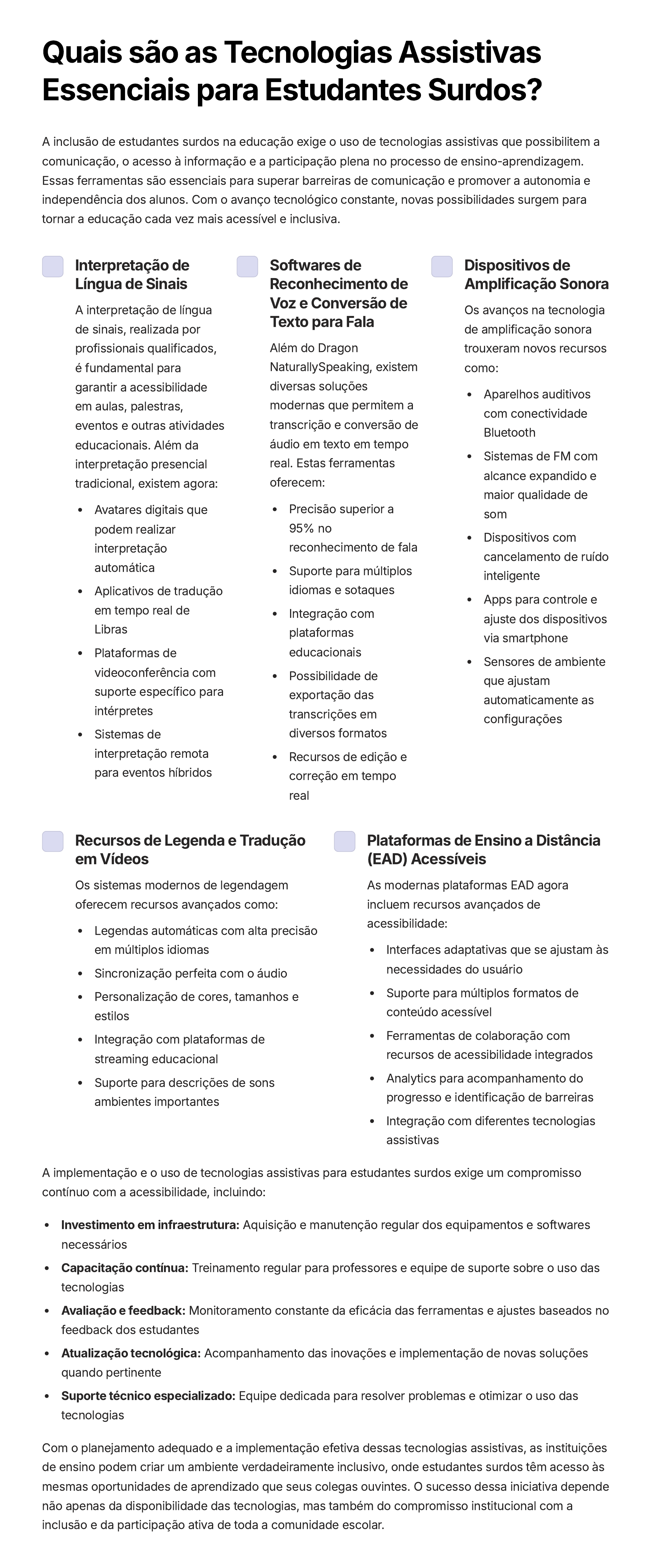 Quais são as Tecnologias Assistivas Essenciais para Estudantes Surdos? A inclusão de estudantes surdos na educação exige o uso de tecnologias assistivas que possibilitem a comunicação, o acesso à informação e a participação plena no processo de ensino-aprendizagem. Essas ferramentas são essenciais para superar barreiras de comunicação e promover a autonomia e independência dos alunos. Com o avanço tecnológico constante, novas possibilidades surgem para tornar a educação cada vez mais acessível e inclusiva. Interpretação de Língua de Sinais A interpretação de língua de sinais, realizada por profissionais qualificados, é fundamental para garantir a acessibilidade em aulas, palestras, eventos e outras atividades educacionais. Além da interpretação presencial tradicional, existem agora: Avatares digitais que podem realizar interpretação automática Aplicativos de tradução em tempo real de Libras Plataformas de videoconferência com suporte específico para intérpretes Sistemas de interpretação remota para eventos híbridos Softwares de Reconhecimento de Voz e Conversão de Texto para Fala Além do Dragon NaturallySpeaking, existem diversas soluções modernas que permitem a transcrição e conversão de áudio em texto em tempo real. Estas ferramentas oferecem: Precisão superior a 95% no reconhecimento de fala Suporte para múltiplos idiomas e sotaques Integração com plataformas educacionais Possibilidade de exportação das transcrições em diversos formatos Recursos de edição e correção em tempo real Dispositivos de Amplificação Sonora Os avanços na tecnologia de amplificação sonora trouxeram novos recursos como: Aparelhos auditivos com conectividade Bluetooth Sistemas de FM com alcance expandido e maior qualidade de som Dispositivos com cancelamento de ruído inteligente Apps para controle e ajuste dos dispositivos via smartphone Sensores de ambiente que ajustam automaticamente as configurações Recursos de Legenda e Tradução em Vídeos Os sistemas modernos de legendagem oferecem recursos avançados como: Legendas automáticas com alta precisão em múltiplos idiomas Sincronização perfeita com o áudio Personalização de cores, tamanhos e estilos Integração com plataformas de streaming educacional Suporte para descrições de sons ambientes importantes Plataformas de Ensino a Distância (EAD) Acessíveis As modernas plataformas EAD agora incluem recursos avançados de acessibilidade: Interfaces adaptativas que se ajustam às necessidades do usuário Suporte para múltiplos formatos de conteúdo acessível Ferramentas de colaboração com recursos de acessibilidade integrados Analytics para acompanhamento do progresso e identificação de barreiras Integração com diferentes tecnologias assistivas A implementação e o uso de tecnologias assistivas para estudantes surdos exige um compromisso contínuo com a acessibilidade, incluindo: Investimento em infraestrutura: Aquisição e manutenção regular dos equipamentos e softwares necessários Capacitação contínua: Treinamento regular para professores e equipe de suporte sobre o uso das tecnologias Avaliação e feedback: Monitoramento constante da eficácia das ferramentas e ajustes baseados no feedback dos estudantes Atualização tecnológica: Acompanhamento das inovações e implementação de novas soluções quando pertinente Suporte técnico especializado: Equipe dedicada para resolver problemas e otimizar o uso das tecnologias Com o planejamento adequado e a implementação efetiva dessas tecnologias assistivas, as instituições de ensino podem criar um ambiente verdadeiramente inclusivo, onde estudantes surdos têm acesso às mesmas oportunidades de aprendizado que seus colegas ouvintes. O sucesso dessa iniciativa depende não apenas da disponibilidade das tecnologias, mas também do compromisso institucional com a inclusão e da participação ativa de toda a comunidade escolar.