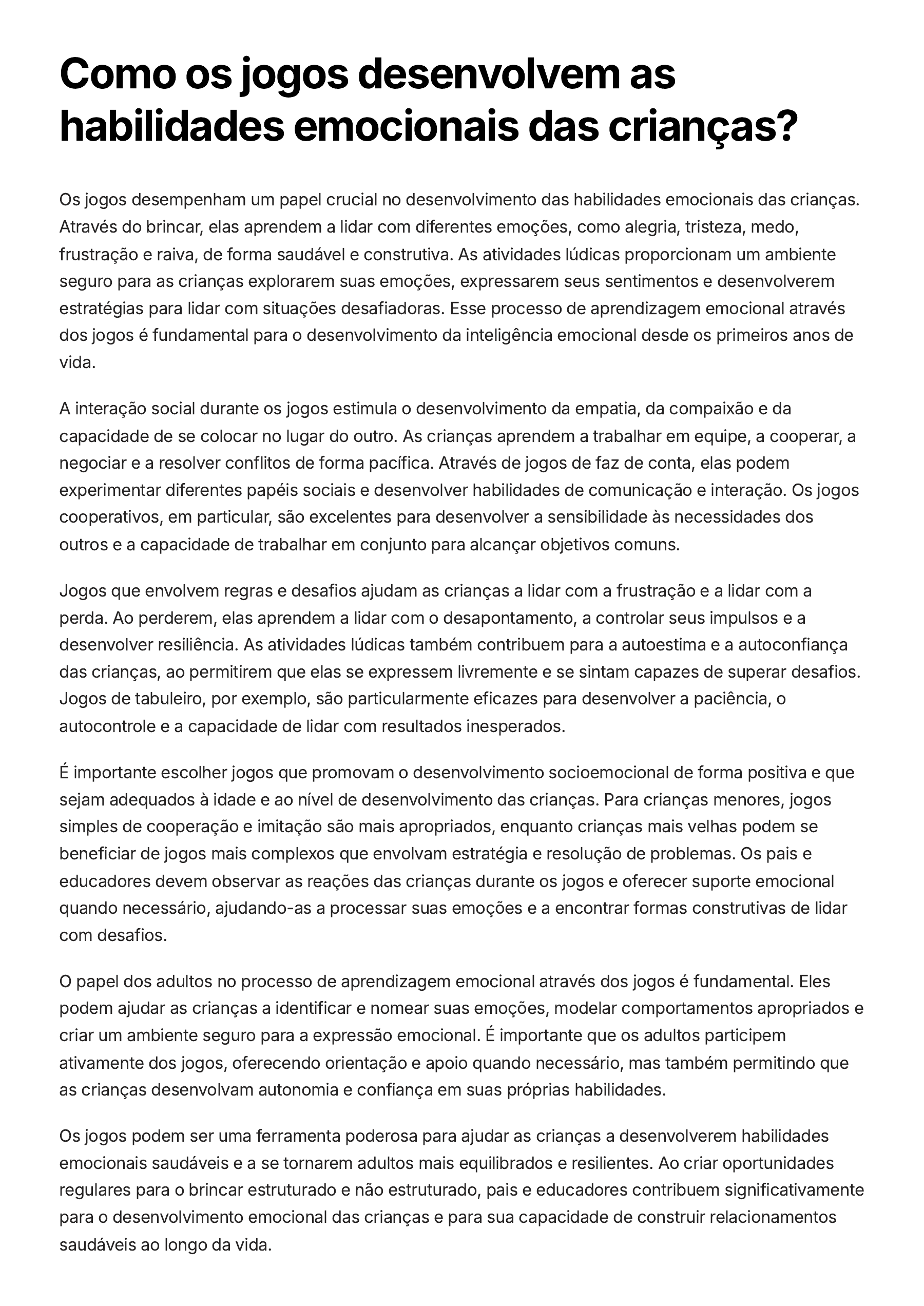 Como os jogos desenvolvem as habilidades emocionais das crianças? Os jogos desempenham um papel crucial no desenvolvimento das habilidades emocionais das crianças. Através do brincar, elas aprendem a lidar com diferentes emoções, como alegria, tristeza, medo, frustração e raiva, de forma saudável e construtiva. As atividades lúdicas proporcionam um ambiente seguro para as crianças explorarem suas emoções, expressarem seus sentimentos e desenvolverem estratégias para lidar com situações desafiadoras. Esse processo de aprendizagem emocional através dos jogos é fundamental para o desenvolvimento da inteligência emocional desde os primeiros anos de vida. A interação social durante os jogos estimula o desenvolvimento da empatia, da compaixão e da capacidade de se colocar no lugar do outro. As crianças aprendem a trabalhar em equipe, a cooperar, a negociar e a resolver conflitos de forma pacífica. Através de jogos de faz de conta, elas podem experimentar diferentes papéis sociais e desenvolver habilidades de comunicação e interação. Os jogos cooperativos, em particular, são excelentes para desenvolver a sensibilidade às necessidades dos outros e a capacidade de trabalhar em conjunto para alcançar objetivos comuns. Jogos que envolvem regras e desafios ajudam as crianças a lidar com a frustração e a lidar com a perda. Ao perderem, elas aprendem a lidar com o desapontamento, a controlar seus impulsos e a desenvolver resiliência. As atividades lúdicas também contribuem para a autoestima e a autoconfiança das crianças, ao permitirem que elas se expressem livremente e se sintam capazes de superar desafios. Jogos de tabuleiro, por exemplo, são particularmente eficazes para desenvolver a paciência, o autocontrole e a capacidade de lidar com resultados inesperados. É importante escolher jogos que promovam o desenvolvimento socioemocional de forma positiva e que sejam adequados à idade e ao nível de desenvolvimento das crianças. Para crianças menores, jogos simples de cooperação e imitação são mais apropriados, enquanto crianças mais velhas podem se beneficiar de jogos mais complexos que envolvam estratégia e resolução de problemas. Os pais e educadores devem observar as reações das crianças durante os jogos e oferecer suporte emocional quando necessário, ajudando-as a processar suas emoções e a encontrar formas construtivas de lidar com desafios. O papel dos adultos no processo de aprendizagem emocional através dos jogos é fundamental. Eles podem ajudar as crianças a identificar e nomear suas emoções, modelar comportamentos apropriados e criar um ambiente seguro para a expressão emocional. É importante que os adultos participem ativamente dos jogos, oferecendo orientação e apoio quando necessário, mas também permitindo que as crianças desenvolvam autonomia e confiança em suas próprias habilidades. Os jogos podem ser uma ferramenta poderosa para ajudar as crianças a desenvolverem habilidades emocionais saudáveis e a se tornarem adultos mais equilibrados e resilientes. Ao criar oportunidades regulares para o brincar estruturado e não estruturado, pais e educadores contribuem significativamente para o desenvolvimento emocional das crianças e para sua capacidade de construir relacionamentos saudáveis ao longo da vida.
