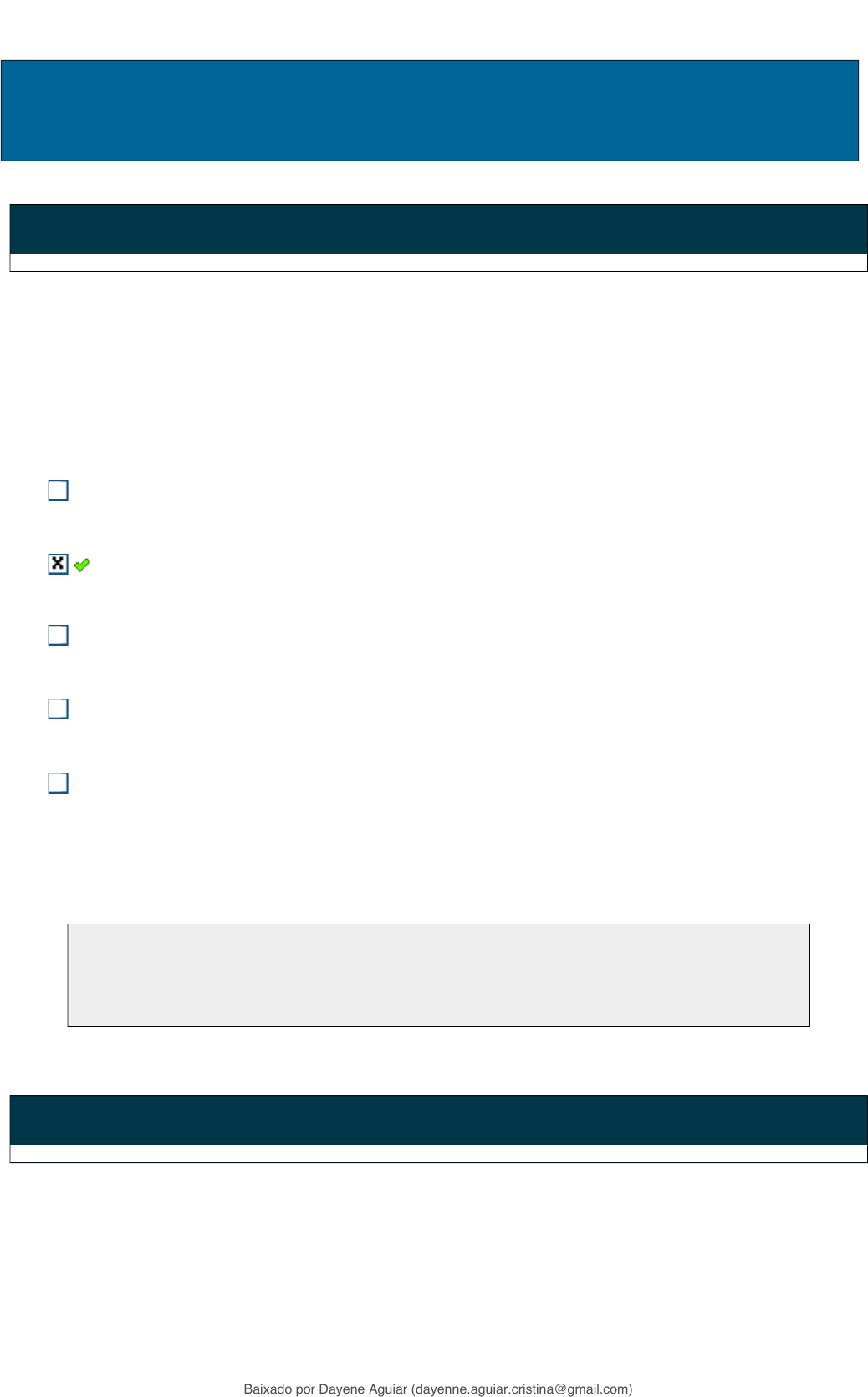 Disc.: QUALIDADE E TESTES DE SOFTWARE 1a Questão Acerto: 1,0 / 1,0 Um gerente de projetos tem pouca experiência, mas foi designado para assumir um novo projeto. Como trabalhará em uma organização matricial, ele pode esperar que as comunicações serão: (Assinale a alternativa CORRETA). Difíceis de automatizar Complexas Simples Fechadas Abertas Explicação: Como um projeto realizado em uma organização matricial envolve pessoas de bárias partes da organização, as comunicações são mais complexas. 2a Questão Acerto: 1,0 / 1,0 Fonte: FUNRIO 2013 ¿ MPOG Analista de Tecnologia da Informação Considere o seguinte problema encontrado em projetos de desenvolvimento de software: projetos reais raramente seguem um fluxo sequencial. Apesar de um modelo linear poder acomodar a iteração, ele o faz indiretamente. Como resultado, as modificações podem causar confusão à medida que a equipe de projeto prossegue. Esse é um dos problemas que são algumas vezes encontrados quando é aplicado o modelo de desenvolvimento. Baixado por Dayene Aguiar (dayenne.aguiar.cristina@gmail.com) lOMoARcPSD|30707823 Mobile User iterativo em cascata iterativo e incremental incremental evolutivo Explicação: O modelo em Cascata possui este problema de ter a necessidade de um fluxo sequencial e os projetos do mundo real não seguem necessariamente esta sequencialidade. 3a Questão Acerto: 1,0 / 1,0 O que podemos concluir do gráfico abaixo apresentado? No eixo vertical, temos o custo de conserto de erros em software No eixo horizontal, temos as fases do processo de desenvolvimento de software os testes não interferem na qualidade do produto de software Baixado por Dayene Aguiar (dayenne.aguiar.cristina@gmail.com) lOMoARcPSD|30707823 Mobile User os erros mais caros são detectados no inicio quando mais cedo os defeitos forem encontrados, mais barato é o custo da correção quando mais cedo os defeitos forem encontrados, mais caro é o custo da correção o ideal é detectarmos erros no software ao final do processo de desenvolvimento Explicação: Myers também ficou conhecido pela Regra de 10 de Myers, que mostra que ¿quanto mais tarde os defeitos forem encontrados, tanto mais caro será corrigi-los Consequentemente: quando mais cedo os defeitos forem encontrados, mais barato é o custo da correção 4a Questão Acerto: 1,0 / 1,0 Quanto às estratégias, existem muitas que podem ser utilizadas para testar um software. Uma das estratégias de teste é o Teste Unitário. O que visam os testes unitários? Visam verificar se os componentes funcionam corretamente juntos, conforme as especificações. Visam verificar se a solução atende aos objetivos do negócio e aos seus requisitos. Visam garantir que cada unidade de programa atenda as especificações e funcione corretamente. Visam tratar os testes como um processo organizado e muitas vezes paralelo e integrado ao processo de desenvolvimento. Visam a execução do sistema como um todo ou um subsistema. Baixado por Dayene Aguiar (dayenne.aguiar.cristina@gmail.com) lOMoARcPSD|30707823 Mobile User Explicação: Testes Unitários: São realizados no estágio mais baixo da escala de testes e são aplicados nas menores componentes de códigos criados, visando garantir que estes atendem as especificações, em termos de garantia e de funcionalidade. Testes de integração: São executados em uma combinação de componentes para verificar se eles funcionam corretamente juntos, conforme as especificações. Teste de sistema: São realizados pela equipe de testes, visando a execução do sistema como um todo ou um subsistema. Teste de aceitação: São os testes finais de execução do sistema, realizados pelos usuários, visando verificar se a solução atende aos objetivos do negócio e aos seus requisitos. Ao tratar os testes como um processo organizado e muitas vezes paralelo e integrado ao processo de desenvolvimento, os custos de manutenção serão reduzidos. 5a Questão Acerto: 1,0 / 1,0 O Modelo V é uma melhoria do Modelo Cascata (modelo Waterfall) do Desenvolvimento de Produto. A configuração desse modelo é representada por: Validação: unitário, integração, sistema e programação. Validação: requisitos, integração, sistema e programação. Verificação: integração, análise, desenvolvimento e código. Validação: unitário, código, sistema e programação. Verificação: requisitos, análise, arquitetura e código. Baixado por Dayene Aguiar (dayenne.aguiar.cristina@gmail.com) lOMoARcPSD|30707823 Mobile User Explicação: O Modelo V é uma melhoria do Modelo Cascata (modelo Waterfall) do Desenvolvimento de Produto, pois esse modelo tinha um problema de reatividade. Ele permite que, durante a integração de um sistema, os testes sejam feitos contra os próprios requisitos do componente ou interface que está sendo testado, em contraste com modelos anteriores onde o componente era testado contra a especificação do componente/interface. Verificação: requisitos, análise, arquitetura e código. Validação: unitário, integração, sistema e aceitação. 6a Questão Acerto: 1,0 / 1,0 A equipe Z realizou a codificação de uma nova tela para o sistema de controle de estoque. O objetivo da equipe é garantir que não existem erros considerando apenas a parte 'nova' do produto. Quais as diferentes visões que devem ser consideradas ao aplicarmos este tipo de teste? Visão da Engenharia de Software, das interfaces, da estrutura lógica de dados, de condições limites, dos caminhos de manipulação de erro. Visão da Engenharia de Software, dos objetivos de negócio da empresa, das interfaces, da estrutura lógica de dados, dos caminhos de manipulação de erro. Visão das interfaces, da estrutura lógica de dados, dos caminhos independentes, das condições limites, dos caminhos de manipulação de erro. Visão da Engenharia de Software, dos objetivos de negócio da empresa, das interfaces, da estrutura lógica de dados, de condiçõ