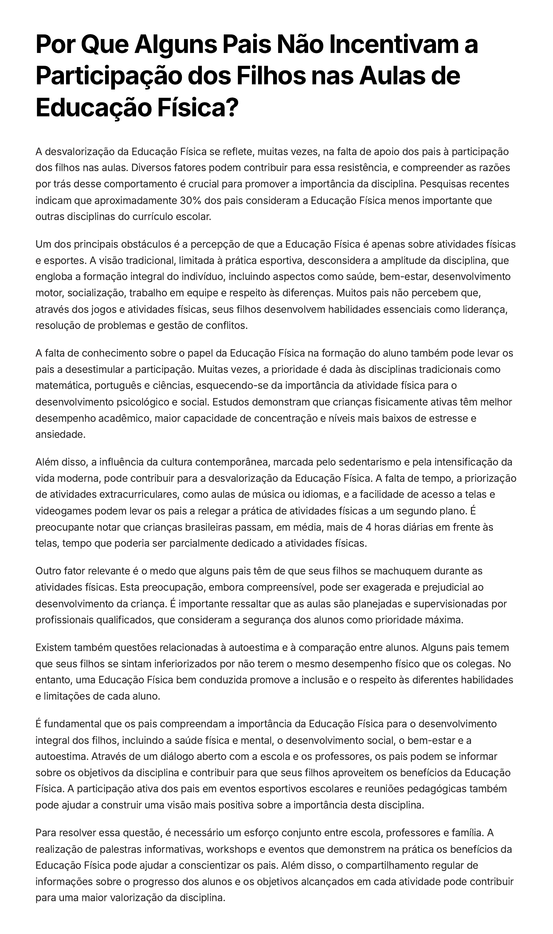 Por Que Alguns Pais Não Incentivam a Participação dos Filhos nas Aulas de Educação Física? A desvalorização da Educação Física se reflete, muitas vezes, na falta de apoio dos pais à participação dos filhos nas aulas. Diversos fatores podem contribuir para essa resistência, e compreender as razões por trás desse comportamento é crucial para promover a importância da disciplina. Pesquisas recentes indicam que aproximadamente 30% dos pais consideram a Educação Física menos importante que outras disciplinas do currículo escolar. Um dos principais obstáculos é a percepção de que a Educação Física é apenas sobre atividades físicas e esportes. A visão tradicional, limitada à prática esportiva, desconsidera a amplitude da disciplina, que engloba a formação integral do indivíduo, incluindo aspectos como saúde, bem-estar, desenvolvimento motor, socialização, trabalho em equipe e respeito às diferenças. Muitos pais não percebem que, através dos jogos e atividades físicas, seus filhos desenvolvem habilidades essenciais como liderança, resolução de problemas e gestão de conflitos. A falta de conhecimento sobre o papel da Educação Física na formação do aluno também pode levar os pais a desestimular a participação. Muitas vezes, a prioridade é dada às disciplinas tradicionais como matemática, português e ciências, esquecendo-se da importância da atividade física para o desenvolvimento psicológico e social. Estudos demonstram que crianças fisicamente ativas têm melhor desempenho acadêmico, maior capacidade de concentração e níveis mais baixos de estresse e ansiedade. Além disso, a influência da cultura contemporânea, marcada pelo sedentarismo e pela intensificação da vida moderna, pode contribuir para a desvalorização da Educação Física. A falta de tempo, a priorização de atividades extracurriculares, como aulas de música ou idiomas, e a facilidade de acesso a telas e videogames podem levar os pais a relegar a prática de atividades físicas a um segundo plano. É preocupante notar que crianças brasileiras passam, em média, mais de 4 horas diárias em frente às telas, tempo que poderia ser parcialmente dedicado a atividades físicas. Outro fator relevante é o medo que alguns pais têm de que seus filhos se machuquem durante as atividades físicas. Esta preocupação, embora compreensível, pode ser exagerada e prejudicial ao desenvolvimento da criança. É importante ressaltar que as aulas são planejadas e supervisionadas por profissionais qualificados, que consideram a segurança dos alunos como prioridade máxima. Existem também questões relacionadas à autoestima e à comparação entre alunos. Alguns pais temem que seus filhos se sintam inferiorizados por não terem o mesmo desempenho físico que os colegas. No entanto, uma Educação Física bem conduzida promove a inclusão e o respeito às diferentes habilidades e limitações de cada aluno. É fundamental que os pais compreendam a importância da Educação Física para o desenvolvimento integral dos filhos, incluindo a saúde física e mental, o desenvolvimento social, o bem-estar e a autoestima. Através de um diálogo aberto com a escola e os professores, os pais podem se informar sobre os objetivos da disciplina e contribuir para que seus filhos aproveitem os benefícios da Educação Física. A participação ativa dos pais em eventos esportivos escolares e reuniões pedagógicas também pode ajudar a construir uma visão mais positiva sobre a importância desta disciplina. Para resolver essa questão, é necessário um esforço conjunto entre escola, professores e família. A realização de palestras informativas, workshops e eventos que demonstrem na prática os benefícios da Educação Física pode ajudar a conscientizar os pais. Além disso, o compartilhamento regular de informações sobre o progresso dos alunos e os objetivos alcançados em cada atividade pode contribuir para uma maior valorização da disciplina.
