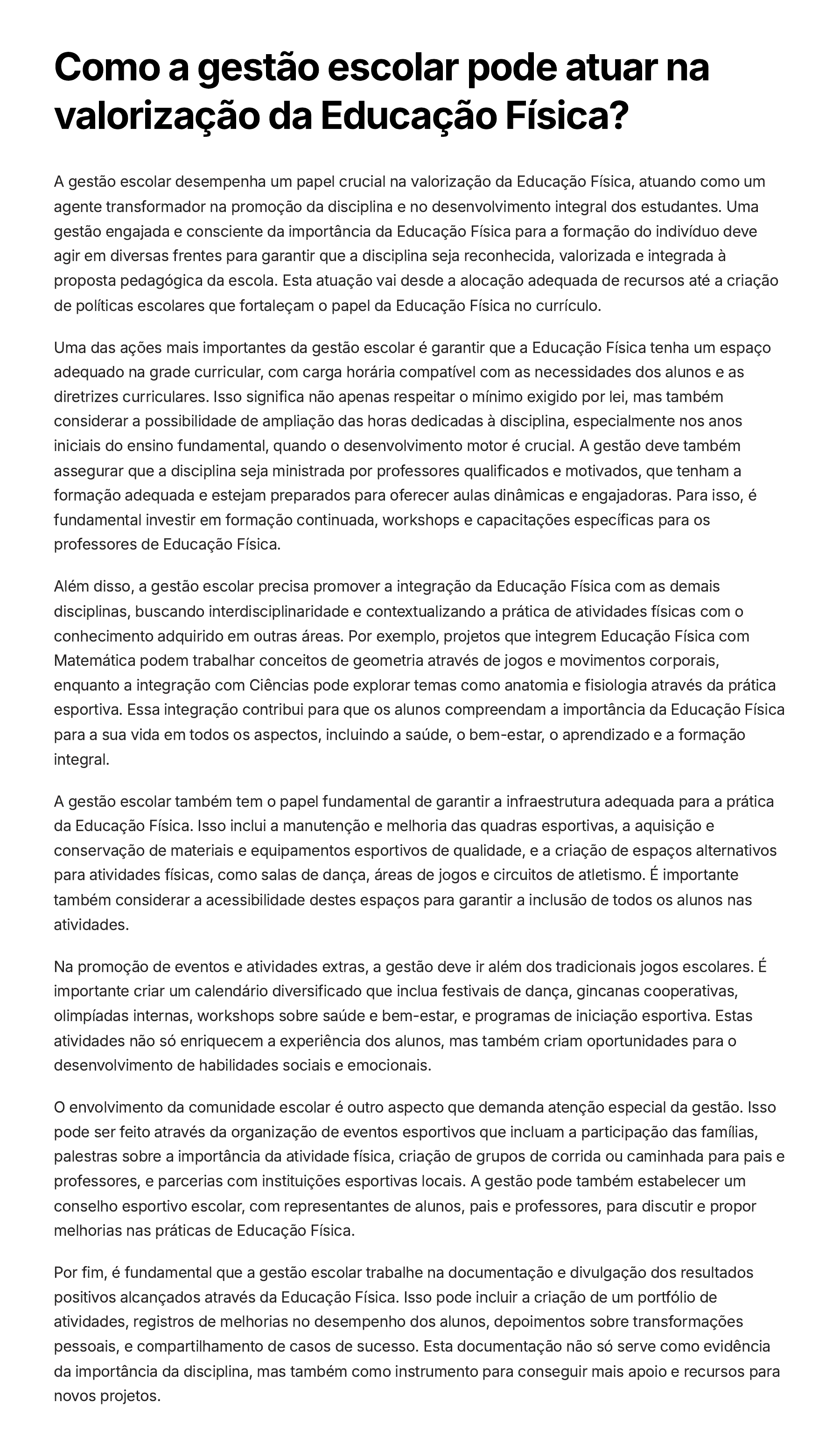 Como a gestão escolar pode atuar na valorização da Educação Física? A gestão escolar desempenha um papel crucial na valorização da Educação Física, atuando como um agente transformador na promoção da disciplina e no desenvolvimento integral dos estudantes. Uma gestão engajada e consciente da importância da Educação Física para a formação do indivíduo deve agir em diversas frentes para garantir que a disciplina seja reconhecida, valorizada e integrada à proposta pedagógica da escola. Esta atuação vai desde a alocação adequada de recursos até a criação de políticas escolares que fortaleçam o papel da Educação Física no currículo. Uma das ações mais importantes da gestão escolar é garantir que a Educação Física tenha um espaço adequado na grade curricular, com carga horária compatível com as necessidades dos alunos e as diretrizes curriculares. Isso significa não apenas respeitar o mínimo exigido por lei, mas também considerar a possibilidade de ampliação das horas dedicadas à disciplina, especialmente nos anos iniciais do ensino fundamental, quando o desenvolvimento motor é crucial. A gestão deve também assegurar que a disciplina seja ministrada por professores qualificados e motivados, que tenham a formação adequada e estejam preparados para oferecer aulas dinâmicas e engajadoras. Para isso, é fundamental investir em formação continuada, workshops e capacitações específicas para os professores de Educação Física. Além disso, a gestão escolar precisa promover a integração da Educação Física com as demais disciplinas, buscando interdisciplinaridade e contextualizando a prática de atividades físicas com o conhecimento adquirido em outras áreas. Por exemplo, projetos que integrem Educação Física com Matemática podem trabalhar conceitos de geometria através de jogos e movimentos corporais, enquanto a integração com Ciências pode explorar temas como anatomia e fisiologia através da prática esportiva. Essa integração contribui para que os alunos compreendam a importância da Educação Física para a sua vida em todos os aspectos, incluindo a saúde, o bem-estar, o aprendizado e a formação integral. A gestão escolar também tem o papel fundamental de garantir a infraestrutura adequada para a prática da Educação Física. Isso inclui a manutenção e melhoria das quadras esportivas, a aquisição e conservação de materiais e equipamentos esportivos de qualidade, e a criação de espaços alternativos para atividades físicas, como salas de dança, áreas de jogos e circuitos de atletismo. É importante também considerar a acessibilidade destes espaços para garantir a inclusão de todos os alunos nas atividades. Na promoção de eventos e atividades extras, a gestão deve ir além dos tradicionais jogos escolares. É importante criar um calendário diversificado que inclua festivais de dança, gincanas cooperativas, olimpíadas internas, workshops sobre saúde e bem-estar, e programas de iniciação esportiva. Estas atividades não só enriquecem a experiência dos alunos, mas também criam oportunidades para o desenvolvimento de habilidades sociais e emocionais. O envolvimento da comunidade escolar é outro aspecto que demanda atenção especial da gestão. Isso pode ser feito através da organização de eventos esportivos que incluam a participação das famílias, palestras sobre a importância da atividade física, criação de grupos de corrida ou caminhada para pais e professores, e parcerias com instituições esportivas locais. A gestão pode também estabelecer um conselho esportivo escolar, com representantes de alunos, pais e professores, para discutir e propor melhorias nas práticas de Educação Física. Por fim, é fundamental que a gestão escolar trabalhe na documentação e divulgação dos resultados positivos alcançados através da Educação Física. Isso pode incluir a criação de um portfólio de atividades, registros de melhorias no desempenho dos alunos, depoimentos sobre transformações pessoais, e compartilhamento de casos de sucesso. Esta documentação não só serve como evidência da importância da disciplina, mas também como instrumento para conseguir mais apoio e recursos para novos projetos.