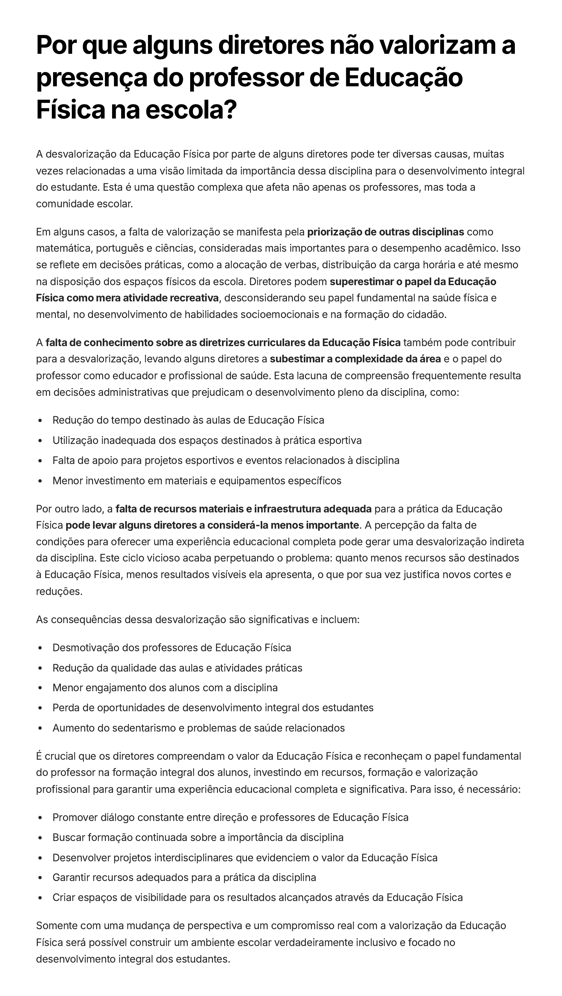 Por que alguns diretores não valorizam a presença do professor de Educação Física na escola? A desvalorização da Educação Física por parte de alguns diretores pode ter diversas causas, muitas vezes relacionadas a uma visão limitada da importância dessa disciplina para o desenvolvimento integral do estudante. Esta é uma questão complexa que afeta não apenas os professores, mas toda a comunidade escolar. Em alguns casos, a falta de valorização se manifesta pela priorização de outras disciplinas como matemática, português e ciências, consideradas mais importantes para o desempenho acadêmico. Isso se reflete em decisões práticas, como a alocação de verbas, distribuição da carga horária e até mesmo na disposição dos espaços físicos da escola. Diretores podem superestimar o papel da Educação Física como mera atividade recreativa, desconsiderando seu papel fundamental na saúde física e mental, no desenvolvimento de habilidades socioemocionais e na formação do cidadão. A falta de conhecimento sobre as diretrizes curriculares da Educação Física também pode contribuir para a desvalorização, levando alguns diretores a subestimar a complexidade da área e o papel do professor como educador e profissional de saúde. Esta lacuna de compreensão frequentemente resulta em decisões administrativas que prejudicam o desenvolvimento pleno da disciplina, como: Redução do tempo destinado às aulas de Educação Física Utilização inadequada dos espaços destinados à prática esportiva Falta de apoio para projetos esportivos e eventos relacionados à disciplina Menor investimento em materiais e equipamentos específicos Por outro lado, a falta de recursos materiais e infraestrutura adequada para a prática da Educação Física pode levar alguns diretores a considerá-la menos importante. A percepção da falta de condições para oferecer uma experiência educacional completa pode gerar uma desvalorização indireta da disciplina. Este ciclo vicioso acaba perpetuando o problema: quanto menos recursos são destinados à Educação Física, menos resultados visíveis ela apresenta, o que por sua vez justifica novos cortes e reduções. As consequências dessa desvalorização são significativas e incluem: Desmotivação dos professores de Educação Física Redução da qualidade das aulas e atividades práticas Menor engajamento dos alunos com a disciplina Perda de oportunidades de desenvolvimento integral dos estudantes Aumento do sedentarismo e problemas de saúde relacionados É crucial que os diretores compreendam o valor da Educação Física e reconheçam o papel fundamental do professor na formação integral dos alunos, investindo em recursos, formação e valorização profissional para garantir uma experiência educacional completa e significativa. Para isso, é necessário: Promover diálogo constante entre direção e professores de Educação Física Buscar formação continuada sobre a importância da disciplina Desenvolver projetos interdisciplinares que evidenciem o valor da Educação Física Garantir recursos adequados para a prática da disciplina Criar espaços de visibilidade para os resultados alcançados através da Educação Física Somente com uma mudança de perspectiva e um compromisso real com a valorização da Educação Física será possível construir um ambiente escolar verdadeiramente inclusivo e focado no desenvolvimento integral dos estudantes.