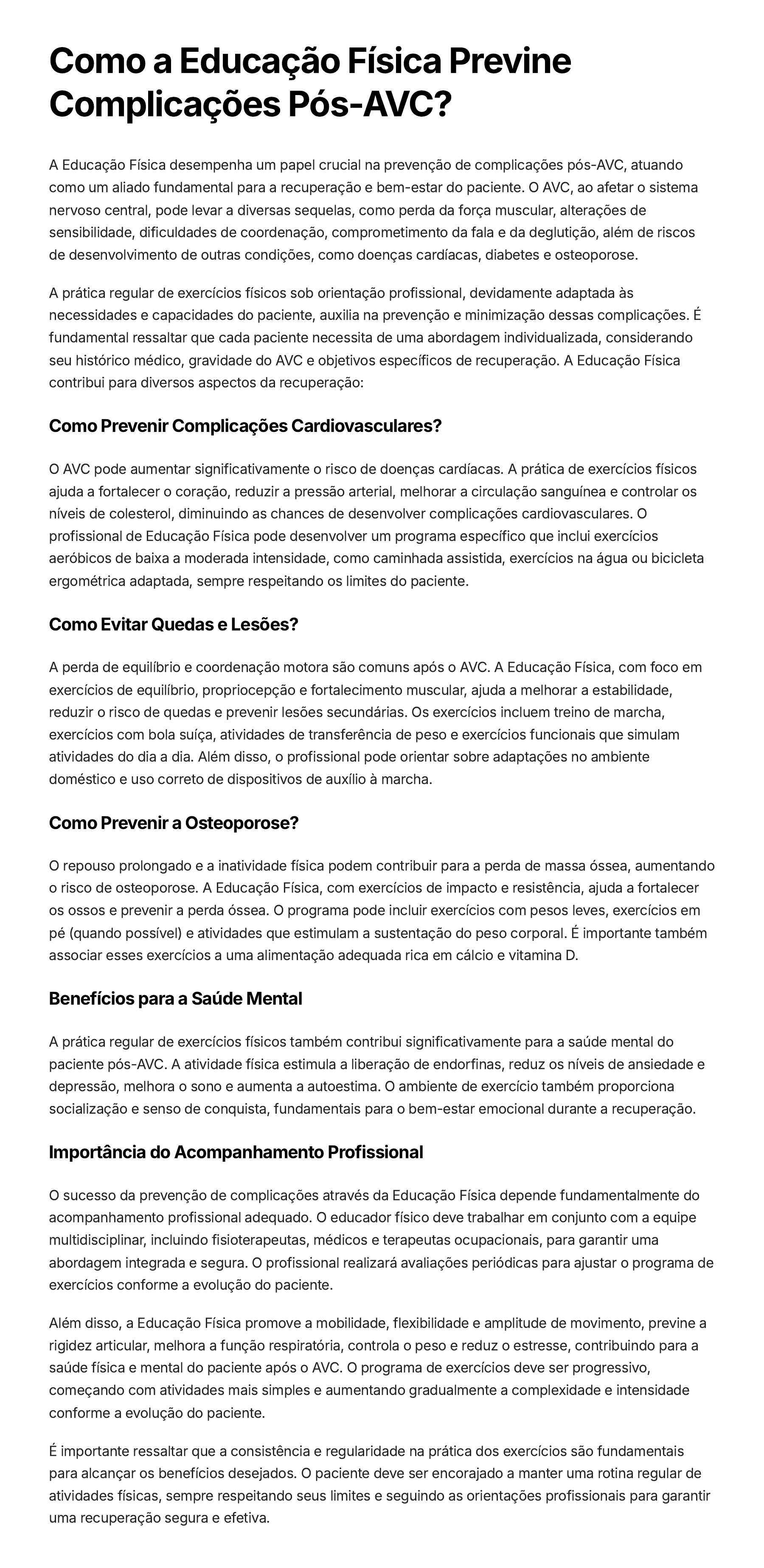 Como a Educação Física Previne Complicações Pós-AVC? A Educação Física desempenha um papel crucial na prevenção de complicações pós-AVC, atuando como um aliado fundamental para a recuperação e bem-estar do paciente. O AVC, ao afetar o sistema nervoso central, pode levar a diversas sequelas, como perda da força muscular, alterações de sensibilidade, dificuldades de coordenação, comprometimento da fala e da deglutição, além de riscos de desenvolvimento de outras condições, como doenças cardíacas, diabetes e osteoporose. A prática regular de exercícios físicos sob orientação profissional, devidamente adaptada às necessidades e capacidades do paciente, auxilia na prevenção e minimização dessas complicações. É fundamental ressaltar que cada paciente necessita de uma abordagem individualizada, considerando seu histórico médico, gravidade do AVC e objetivos específicos de recuperação. A Educação Física contribui para diversos aspectos da recuperação: Como Prevenir Complicações Cardiovasculares? O AVC pode aumentar significativamente o risco de doenças cardíacas. A prática de exercícios físicos ajuda a fortalecer o coração, reduzir a pressão arterial, melhorar a circulação sanguínea e controlar os níveis de colesterol, diminuindo as chances de desenvolver complicações cardiovasculares. O profissional de Educação Física pode desenvolver um programa específico que inclui exercícios aeróbicos de baixa a moderada intensidade, como caminhada assistida, exercícios na água ou bicicleta ergométrica adaptada, sempre respeitando os limites do paciente. Como Evitar Quedas e Lesões? A perda de equilíbrio e coordenação motora são comuns após o AVC. A Educação Física, com foco em exercícios de equilíbrio, propriocepção e fortalecimento muscular, ajuda a melhorar a estabilidade, reduzir o risco de quedas e prevenir lesões secundárias. Os exercícios incluem treino de marcha, exercícios com bola suíça, atividades de transferência de peso e exercícios funcionais que simulam atividades do dia a dia. Além disso, o profissional pode orientar sobre adaptações no ambiente doméstico e uso correto de dispositivos de auxílio à marcha. Como Prevenir a Osteoporose? O repouso prolongado e a inatividade física podem contribuir para a perda de massa óssea, aumentando o risco de osteoporose. A Educação Física, com exercícios de impacto e resistência, ajuda a fortalecer os ossos e prevenir a perda óssea. O programa pode incluir exercícios com pesos leves, exercícios em pé (quando possível) e atividades que estimulam a sustentação do peso corporal. É importante também associar esses exercícios a uma alimentação adequada rica em cálcio e vitamina D. Benefícios para a Saúde Mental A prática regular de exercícios físicos também contribui significativamente para a saúde mental do paciente pós-AVC. A atividade física estimula a liberação de endorfinas, reduz os níveis de ansiedade e depressão, melhora o sono e aumenta a autoestima. O ambiente de exercício também proporciona socialização e senso de conquista, fundamentais para o bem-estar emocional durante a recuperação. Importância do Acompanhamento Profissional O sucesso da prevenção de complicações através da Educação Física depende fundamentalmente do acompanhamento profissional adequado. O educador físico deve trabalhar em conjunto com a equipe multidisciplinar, incluindo fisioterapeutas, médicos e terapeutas ocupacionais, para garantir uma abordagem integrada e segura. O profissional realizará avaliações periódicas para ajustar o programa de exercícios conforme a evolução do paciente. Além disso, a Educação Física promove a mobilidade, flexibilidade e amplitude de movimento, previne a rigidez articular, melhora a função respiratória, controla o peso e reduz o estresse, contribuindo para a saúde física e mental do paciente após o AVC. O programa de exercícios deve ser progressivo, começando com atividades mais simples e aumentando gradualmente a complexidade e intensidade conforme a evolução do paciente. É importante ressaltar que a consistência e regularidade na prática dos exercícios são fundamentais para alcançar os benefícios desejados. O paciente deve ser encorajado a manter uma rotina regular de atividades físicas, sempre respeitando seus limites e seguindo as orientações profissionais para garantir uma recuperação segura e efetiva.