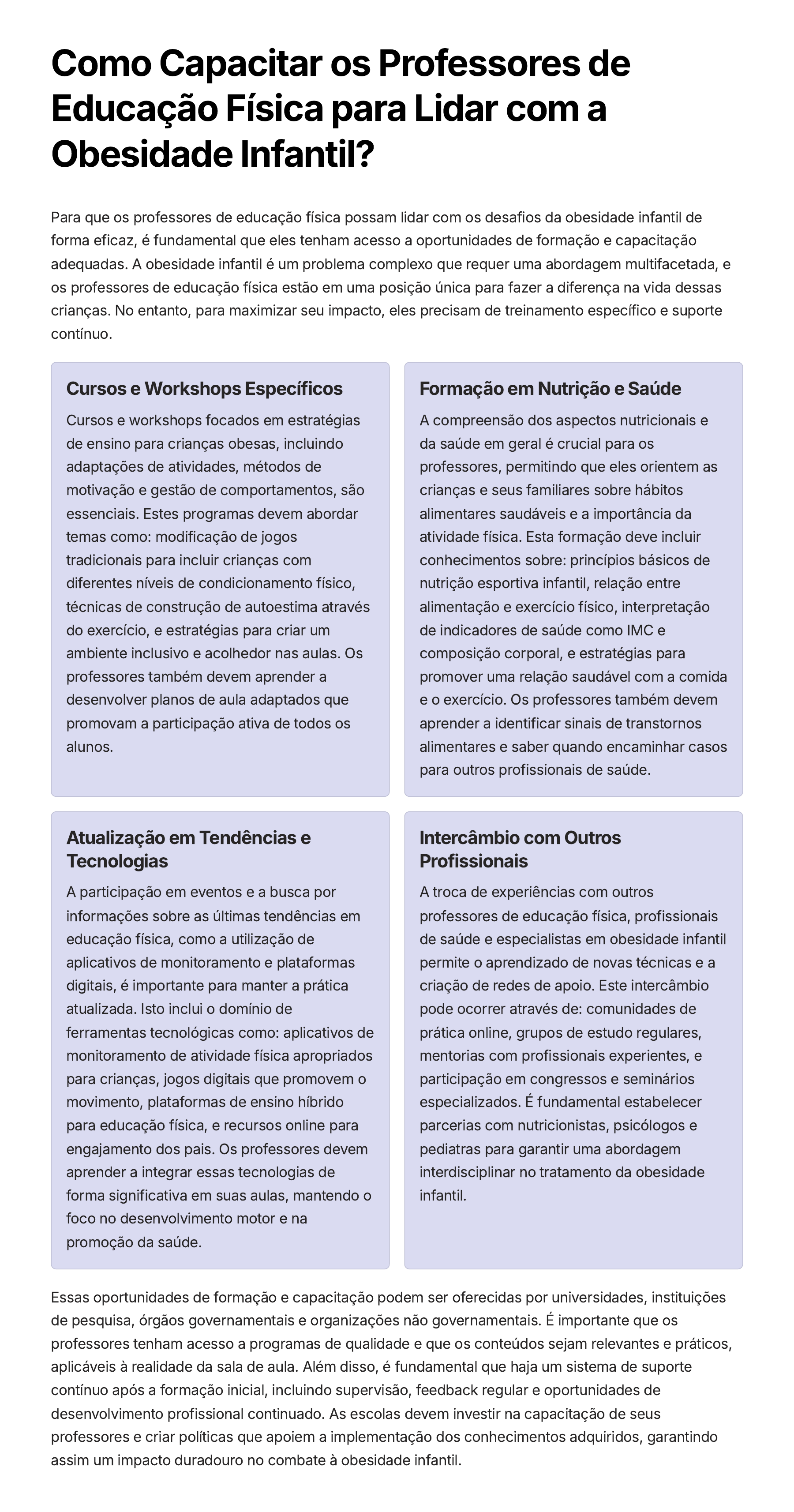 Como Capacitar os Professores de Educação Física para Lidar com a Obesidade Infantil? Para que os professores de educação física possam lidar com os desafios da obesidade infantil de forma eficaz, é fundamental que eles tenham acesso a oportunidades de formação e capacitação adequadas. A obesidade infantil é um problema complexo que requer uma abordagem multifacetada, e os professores de educação física estão em uma posição única para fazer a diferença na vida dessas crianças. No entanto, para maximizar seu impacto, eles precisam de treinamento específico e suporte contínuo. Cursos e Workshops Específicos Cursos e workshops focados em estratégias de ensino para crianças obesas, incluindo adaptações de atividades, métodos de motivação e gestão de comportamentos, são essenciais. Estes programas devem abordar temas como: modificação de jogos tradicionais para incluir crianças com diferentes níveis de condicionamento físico, técnicas de construção de autoestima através do exercício, e estratégias para criar um ambiente inclusivo e acolhedor nas aulas. Os professores também devem aprender a desenvolver planos de aula adaptados que promovam a participação ativa de todos os alunos. Formação em Nutrição e Saúde A compreensão dos aspectos nutricionais e da saúde em geral é crucial para os professores, permitindo que eles orientem as crianças e seus familiares sobre hábitos alimentares saudáveis e a importância da atividade física. Esta formação deve incluir conhecimentos sobre: princípios básicos de nutrição esportiva infantil, relação entre alimentação e exercício físico, interpretação de indicadores de saúde como IMC e composição corporal, e estratégias para promover uma relação saudável com a comida e o exercício. Os professores também devem aprender a identificar sinais de transtornos alimentares e saber quando encaminhar casos para outros profissionais de saúde. Atualização em Tendências e Tecnologias A participação em eventos e a busca por informações sobre as últimas tendências em educação física, como a utilização de aplicativos de monitoramento e plataformas digitais, é importante para manter a prática atualizada. Isto inclui o domínio de ferramentas tecnológicas como: aplicativos de monitoramento de atividade física apropriados para crianças, jogos digitais que promovem o movimento, plataformas de ensino híbrido para educação física, e recursos online para engajamento dos pais. Os professores devem aprender a integrar essas tecnologias de forma significativa em suas aulas, mantendo o foco no desenvolvimento motor e na promoção da saúde. Intercâmbio com Outros Profissionais A troca de experiências com outros professores de educação física, profissionais de saúde e especialistas em obesidade infantil permite o aprendizado de novas técnicas e a criação de redes de apoio. Este intercâmbio pode ocorrer através de: comunidades de prática online, grupos de estudo regulares, mentorias com profissionais experientes, e participação em congressos e seminários especializados. É fundamental estabelecer parcerias com nutricionistas, psicólogos e pediatras para garantir uma abordagem interdisciplinar no tratamento da obesidade infantil. Essas oportunidades de formação e capacitação podem ser oferecidas por universidades, instituições de pesquisa, órgãos governamentais e organizações não governamentais. É importante que os professores tenham acesso a programas de qualidade e que os conteúdos sejam relevantes e práticos, aplicáveis à realidade da sala de aula. Além disso, é fundamental que haja um sistema de suporte contínuo após a formação inicial, incluindo supervisão, feedback regular e oportunidades de desenvolvimento profissional continuado. As escolas devem investir na capacitação de seus professores e criar políticas que apoiem a implementação dos conhecimentos adquiridos, garantindo assim um impacto duradouro no combate à obesidade infantil.