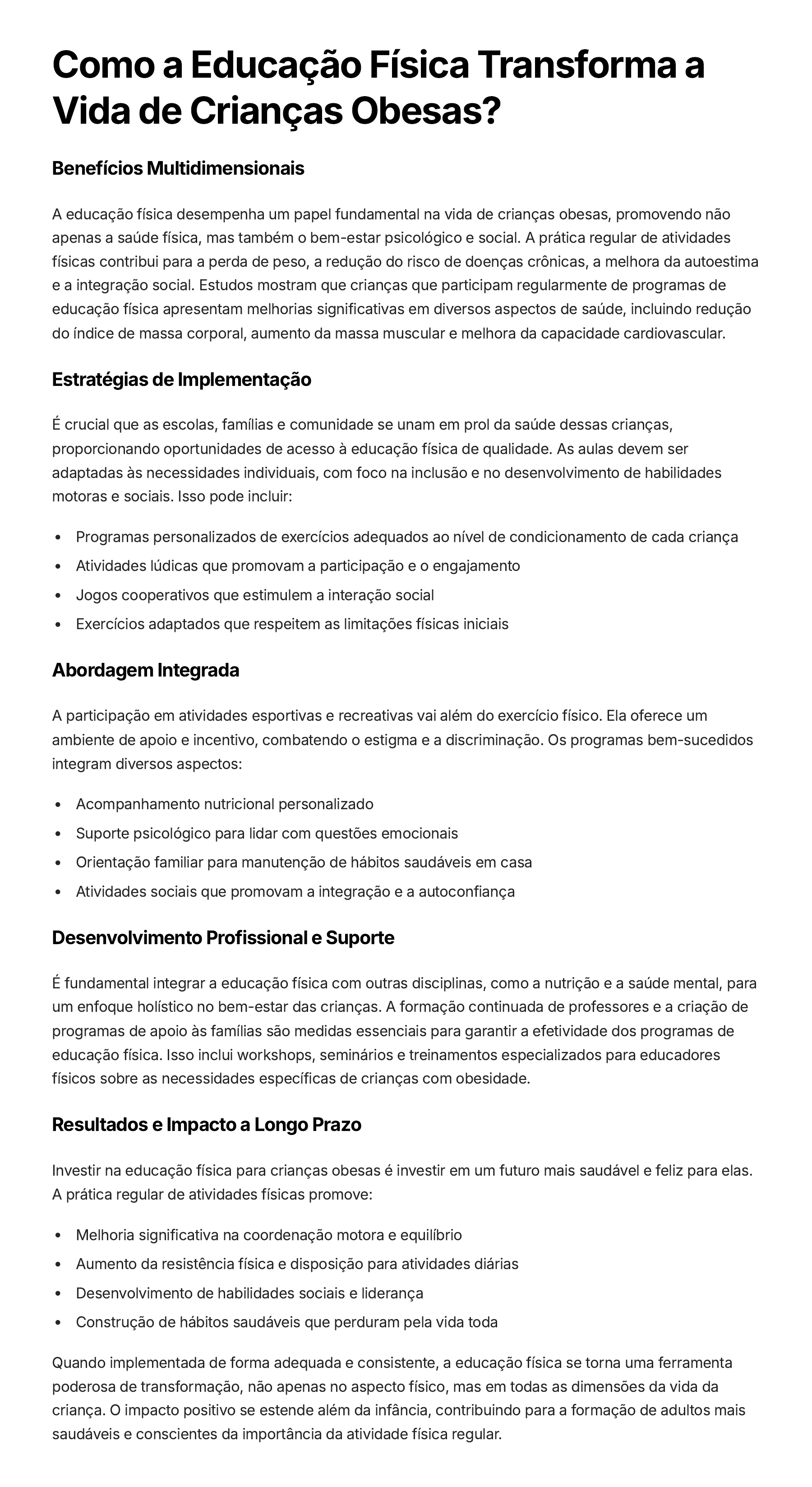 Como a Educação Física Transforma a Vida de Crianças Obesas? Benefícios Multidimensionais A educação física desempenha um papel fundamental na vida de crianças obesas, promovendo não apenas a saúde física, mas também o bem-estar psicológico e social. A prática regular de atividades físicas contribui para a perda de peso, a redução do risco de doenças crônicas, a melhora da autoestima e a integração social. Estudos mostram que crianças que participam regularmente de programas de educação física apresentam melhorias significativas em diversos aspectos de saúde, incluindo redução do índice de massa corporal, aumento da massa muscular e melhora da capacidade cardiovascular. Estratégias de Implementação É crucial que as escolas, famílias e comunidade se unam em prol da saúde dessas crianças, proporcionando oportunidades de acesso à educação física de qualidade. As aulas devem ser adaptadas às necessidades individuais, com foco na inclusão e no desenvolvimento de habilidades motoras e sociais. Isso pode incluir: Programas personalizados de exercícios adequados ao nível de condicionamento de cada criança Atividades lúdicas que promovam a participação e o engajamento Jogos cooperativos que estimulem a interação social Exercícios adaptados que respeitem as limitações físicas iniciais Abordagem Integrada A participação em atividades esportivas e recreativas vai além do exercício físico. Ela oferece um ambiente de apoio e incentivo, combatendo o estigma e a discriminação. Os programas bem-sucedidos integram diversos aspectos: Acompanhamento nutricional personalizado Suporte psicológico para lidar com questões emocionais Orientação familiar para manutenção de hábitos saudáveis em casa Atividades sociais que promovam a integração e a autoconfiança Desenvolvimento Profissional e Suporte É fundamental integrar a educação física com outras disciplinas, como a nutrição e a saúde mental, para um enfoque holístico no bem-estar das crianças. A formação continuada de professores e a criação de programas de apoio às famílias são medidas essenciais para garantir a efetividade dos programas de educação física. Isso inclui workshops, seminários e treinamentos especializados para educadores físicos sobre as necessidades específicas de crianças com obesidade. Resultados e Impacto a Longo Prazo Investir na educação física para crianças obesas é investir em um futuro mais saudável e feliz para elas. A prática regular de atividades físicas promove: Melhoria significativa na coordenação motora e equilíbrio Aumento da resistência física e disposição para atividades diárias Desenvolvimento de habilidades sociais e liderança Construção de hábitos saudáveis que perduram pela vida toda Quando implementada de forma adequada e consistente, a educação física se torna uma ferramenta poderosa de transformação, não apenas no aspecto físico, mas em todas as dimensões da vida da criança. O impacto positivo se estende além da infância, contribuindo para a formação de adultos mais saudáveis e conscientes da importância da atividade física regular.