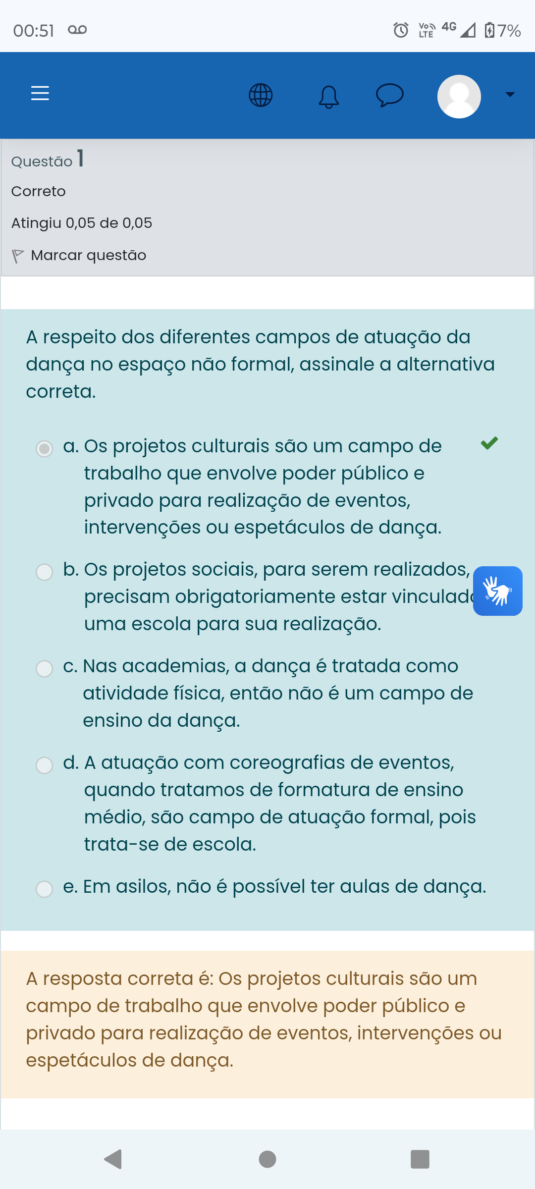 00:51 LTE 4G 7% Questão 1 Correto Atingiu 0,05 de 0,05 Marcar questão A respeito dos diferentes campos de atuação da dança no espaço não formal, assinale a alternativa correta. a. Os projetos culturais são um campo de trabalho que envolve poder público e privado para realização de eventos, intervenções ou espetáculos de dança. b. Os projetos sociais, para serem realizados, precisam obrigatoriamente estar vinculado uma escola para sua realização. C. Nas academias, a dança é tratada como atividade física, então não é um campo de ensino da dança. d. A atuação com coreografias de eventos, quando tratamos de formatura de ensino médio, são campo de atuação formal, pois trata-se de escola. e. Em asilos, não é possível ter aulas de dança. A resposta correta é: Os projetos culturais são um campo de trabalho que envolve poder público e privado para realização de eventos, intervenções ou espetáculos de dança.