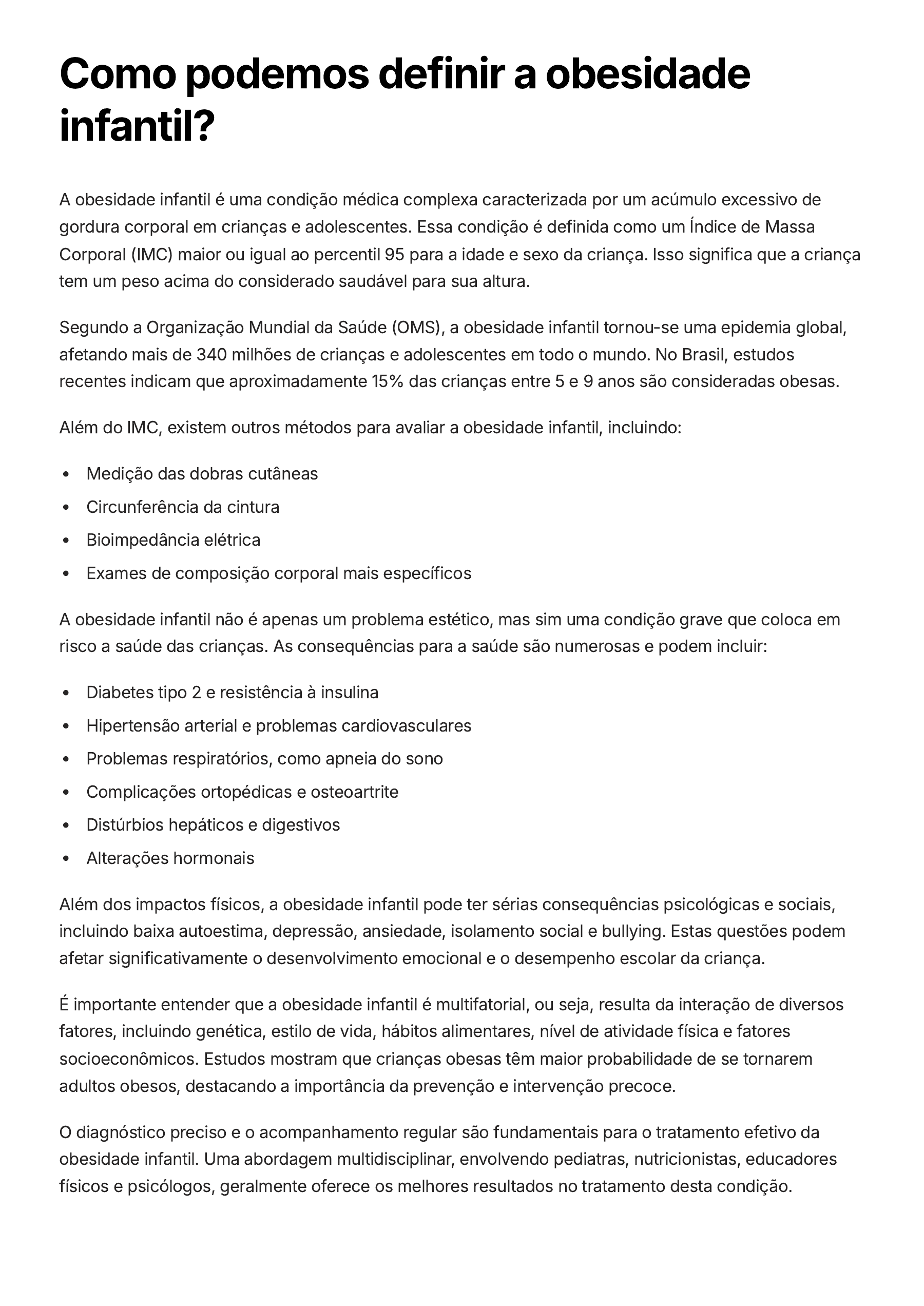 Como podemos definir a obesidade infantil? A obesidade infantil é uma condição médica complexa caracterizada por um acúmulo excessivo de gordura corporal em crianças e adolescentes. Essa condição é definida como um Índice de Massa Corporal (IMC) maior ou igual ao percentil 95 para a idade e sexo da criança. Isso significa que a criança tem um peso acima do considerado saudável para sua altura. Segundo a Organização Mundial da Saúde (OMS), a obesidade infantil tornou-se uma epidemia global, afetando mais de 340 milhões de crianças e adolescentes em todo o mundo. No Brasil, estudos recentes indicam que aproximadamente 15% das crianças entre 5 e 9 anos são consideradas obesas. Além do IMC, existem outros métodos para avaliar a obesidade infantil, incluindo: Medição das dobras cutâneas Circunferência da cintura Bioimpedância elétrica Exames de composição corporal mais específicos A obesidade infantil não é apenas um problema estético, mas sim uma condição grave que coloca em risco a saúde das crianças. As consequências para a saúde são numerosas e podem incluir: Diabetes tipo 2 e resistência à insulina Hipertensão arterial e problemas cardiovasculares Problemas respiratórios, como apneia do sono Complicações ortopédicas e osteoartrite Distúrbios hepáticos e digestivos Alterações hormonais Além dos impactos físicos, a obesidade infantil pode ter sérias consequências psicológicas e sociais, incluindo baixa autoestima, depressão, ansiedade, isolamento social e bullying. Estas questões podem afetar significativamente o desenvolvimento emocional e o desempenho escolar da criança. É importante entender que a obesidade infantil é multifatorial, ou seja, resulta da interação de diversos fatores, incluindo genética, estilo de vida, hábitos alimentares, nível de atividade física e fatores socioeconômicos. Estudos mostram que crianças obesas têm maior probabilidade de se tornarem adultos obesos, destacando a importância da prevenção e intervenção precoce. O diagnóstico preciso e o acompanhamento regular são fundamentais para o tratamento efetivo da obesidade infantil. Uma abordagem multidisciplinar, envolvendo pediatras, nutricionistas, educadores físicos e psicólogos, geralmente oferece os melhores resultados no tratamento desta condição.
