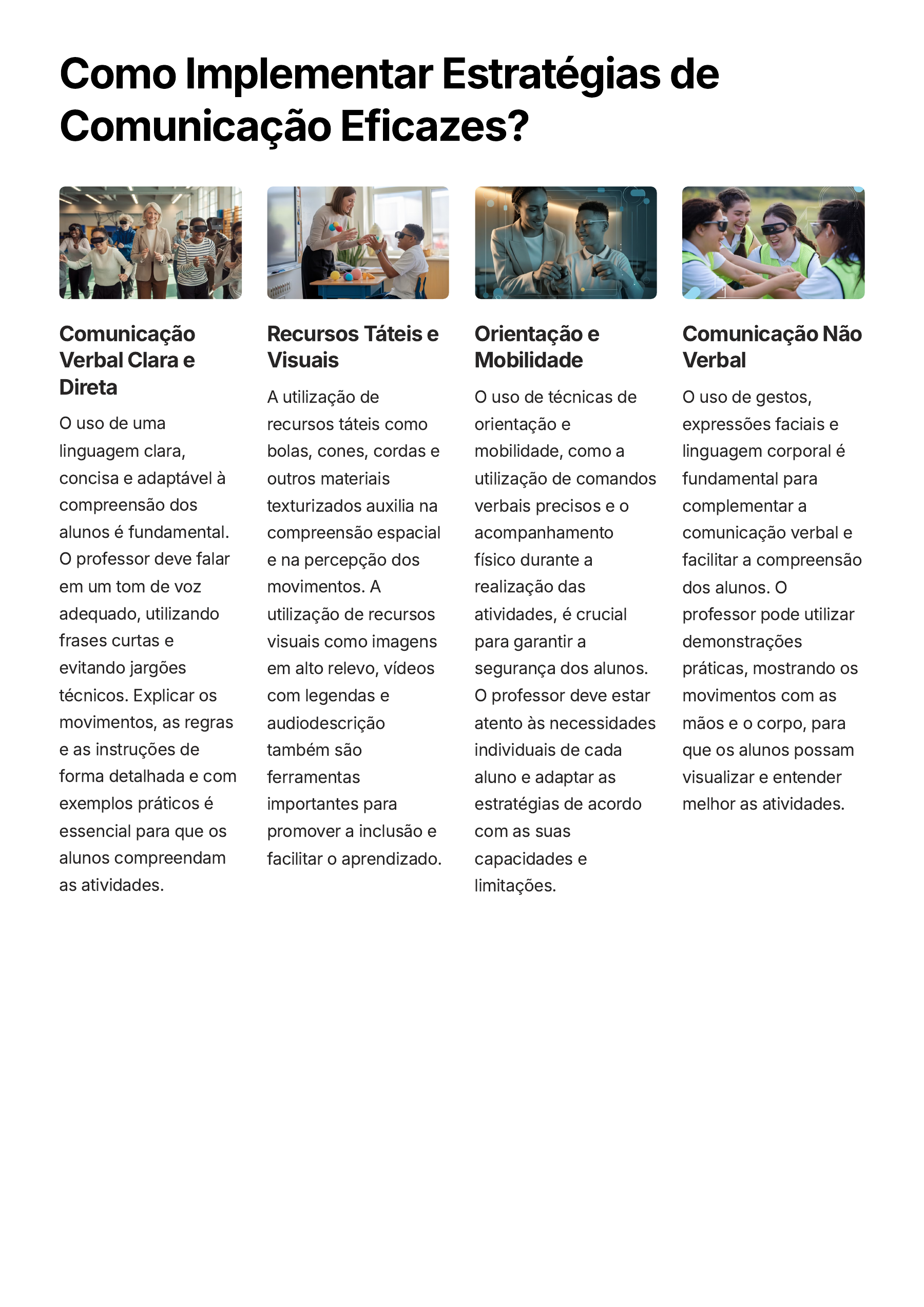 Como Implementar Estratégias de Comunicação Eficazes? Comunicação Verbal Clara e Direta O uso de uma linguagem clara, concisa e adaptável à compreensão dos alunos é fundamental. O professor deve falar em um tom de voz adequado, utilizando frases curtas e evitando jargões técnicos. Explicar os movimentos, as regras e as instruções de forma detalhada e com exemplos práticos é essencial para que os alunos compreendam as atividades. Recursos Táteis e Visuais A utilização de recursos táteis como bolas, cones, cordas e outros materiais texturizados auxilia na compreensão espacial e na percepção dos movimentos. A utilização de recursos visuais como imagens em alto relevo, vídeos com legendas e audiodescrição também são ferramentas importantes para promover a inclusão e facilitar o aprendizado. Orientação e Mobilidade O uso de técnicas de orientação e mobilidade, como a utilização de comandos verbais precisos e o acompanhamento físico durante a realização das atividades, é crucial para garantir a segurança dos alunos. O professor deve estar atento às necessidades individuais de cada aluno e adaptar as estratégias de acordo com as suas capacidades e limitações. Comunicação Não Verbal O uso de gestos, expressões faciais e linguagem corporal é fundamental para complementar a comunicação verbal e facilitar a compreensão dos alunos. O professor pode utilizar demonstrações práticas, mostrando os movimentos com as mãos e o corpo, para que os alunos possam visualizar e entender melhor as atividades. Como a Família Contribui para a Educação Física Adaptada? A família desempenha um papel crucial na inclusão e desenvolvimento do aluno com deficiência visual na Educação Física Adaptada. A participação ativa dos pais ou responsáveis é fundamental para garantir o sucesso do processo educativo. Comunicação aberta e constante: O diálogo é essencial para que a família compreenda as necessidades e desafios do aluno, e para que o professor possa contar com a colaboração dos pais no processo de aprendizagem. 1. Incentivo e apoio: A família deve encorajar a participação do aluno nas aulas, mostrando-lhe que ele é capaz de realizar as atividades e de se divertir. O apoio emocional e a confiança na capacidade do aluno são fundamentais para sua autoestima e desenvolvimento. 2. Participação nas atividades: Quando possível, a família pode participar das aulas de Educação Física Adaptada, aprendendo como auxiliar o aluno em casa e em outros ambientes. Essa participação também demonstra aos alunos a importância da atividade física e contribui para a integração familiar. 3. Defesa dos direitos: A família deve estar atenta aos direitos do aluno e defender seu acesso à Educação Física Adaptada de qualidade. Isso inclui garantir que a escola ofereça recursos e profissionais qualificados para atender às necessidades específicas do aluno com deficiência visual. 4. A família é um elo importante na inclusão do aluno com deficiência visual, trabalhando em conjunto com a escola para garantir o desenvolvimento integral do aluno. Como estabelecer parcerias com a comunidade na Educação Física Adaptada? Estabelecer parcerias com a comunidade é fundamental para o sucesso da Educação Física Adaptada para deficientes visuais. A participação de diversos atores, como pais, familiares, profissionais de saúde, instituições e organizações, enriquece o processo educacional e garante um ambiente inclusivo e enriquecedor. A família desempenha um papel crucial nesse processo. É importante que os pais estejam engajados e informados sobre as necessidades específicas de seus filhos, participando de reuniões, workshops e atividades com o professor de Educação Física. O apoio familiar é fundamental para o desenvolvimento da autoestima e da autonomia do aluno. Profissionais de saúde, como médicos, fisioterapeutas e psicólogos, podem oferecer suporte técnico e orientação para o desenvolvimento de atividades adaptadas. A colaboração com instituições como bibliotecas, museus e centros culturais permite a criação de programas acessíveis e atividades lúdicas que estimulam a inclusão social. Organizações não governamentais (ONGs) e entidades esportivas também podem ser importantes parceiras, oferecendo recursos, treinamentos e apoio financeiro para projetos de Educação Física Adaptada. Através de ações conjuntas, é possível promover eventos esportivos inclusivos, palestras e workshops, além de criar oportunidades de desenvolvimento para os alunos com deficiência visual. É essencial que as parcerias sejam estabelecidas com o objetivo de promover a inclusão social, o desenvolvimento integral e a qualidade de vida dos alunos com deficiência visual. A união de esforços, a troca de informações e a criação de um ambiente de colaboração garantem uma experiência educacional mais completa e significativa.