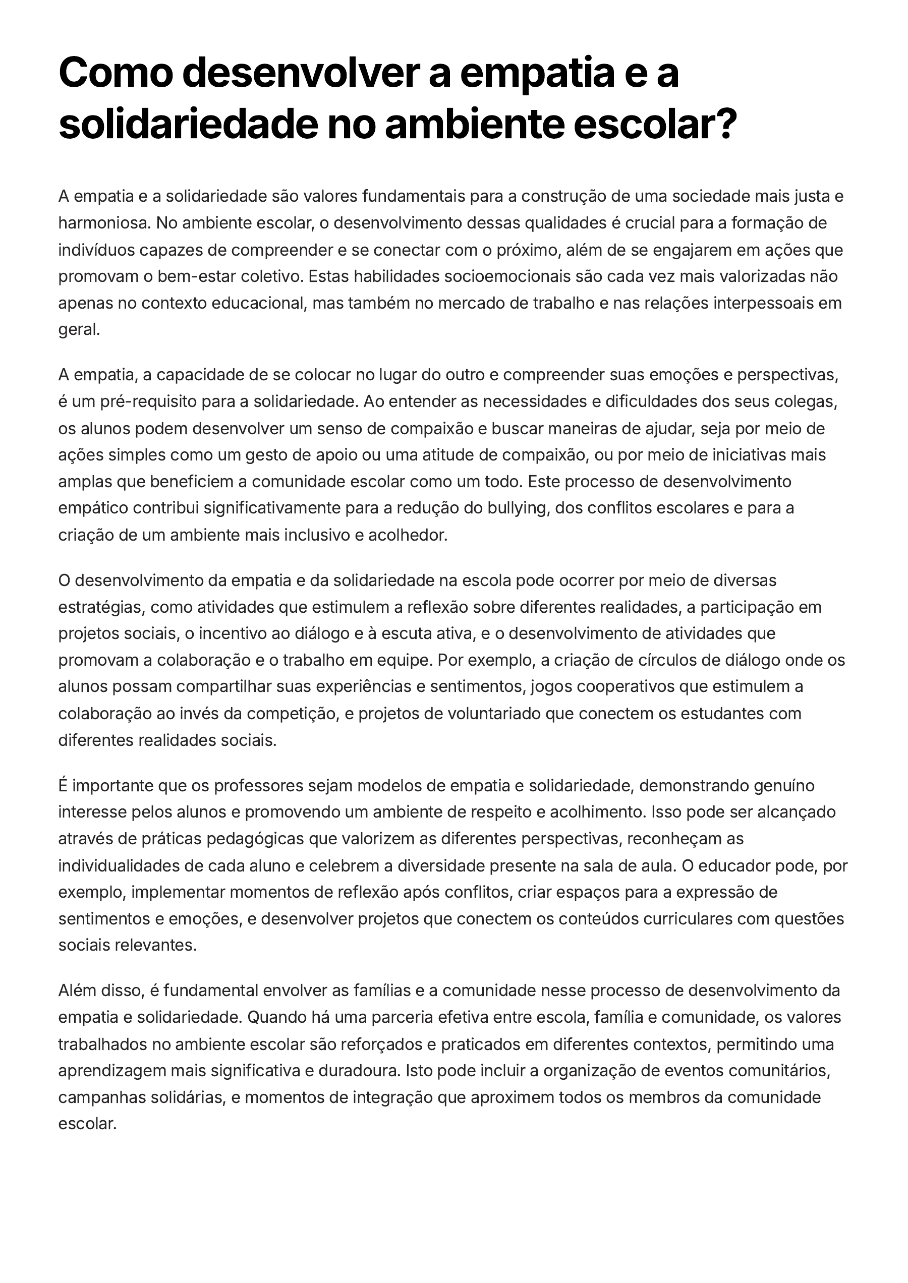 Como desenvolver a empatia e a solidariedade no ambiente escolar? A empatia e a solidariedade são valores fundamentais para a construção de uma sociedade mais justa e harmoniosa. No ambiente escolar, o desenvolvimento dessas qualidades é crucial para a formação de indivíduos capazes de compreender e se conectar com o próximo, além de se engajarem em ações que promovam o bem-estar coletivo. Estas habilidades socioemocionais são cada vez mais valorizadas não apenas no contexto educacional, mas também no mercado de trabalho e nas relações interpessoais em geral. A empatia, a capacidade de se colocar no lugar do outro e compreender suas emoções e perspectivas, é um pré-requisito para a solidariedade. Ao entender as necessidades e dificuldades dos seus colegas, os alunos podem desenvolver um senso de compaixão e buscar maneiras de ajudar, seja por meio de ações simples como um gesto de apoio ou uma atitude de compaixão, ou por meio de iniciativas mais amplas que beneficiem a comunidade escolar como um todo. Este processo de desenvolvimento empático contribui significativamente para a redução do bullying, dos conflitos escolares e para a criação de um ambiente mais inclusivo e acolhedor. O desenvolvimento da empatia e da solidariedade na escola pode ocorrer por meio de diversas estratégias, como atividades que estimulem a reflexão sobre diferentes realidades, a participação em projetos sociais, o incentivo ao diálogo e à escuta ativa, e o desenvolvimento de atividades que promovam a colaboração e o trabalho em equipe. Por exemplo, a criação de círculos de diálogo onde os alunos possam compartilhar suas experiências e sentimentos, jogos cooperativos que estimulem a colaboração ao invés da competição, e projetos de voluntariado que conectem os estudantes com diferentes realidades sociais. É importante que os professores sejam modelos de empatia e solidariedade, demonstrando genuíno interesse pelos alunos e promovendo um ambiente de respeito e acolhimento. Isso pode ser alcançado através de práticas pedagógicas que valorizem as diferentes perspectivas, reconheçam as individualidades de cada aluno e celebrem a diversidade presente na sala de aula. O educador pode, por exemplo, implementar momentos de reflexão após conflitos, criar espaços para a expressão de sentimentos e emoções, e desenvolver projetos que conectem os conteúdos curriculares com questões sociais relevantes. Além disso, é fundamental envolver as famílias e a comunidade nesse processo de desenvolvimento da empatia e solidariedade. Quando há uma parceria efetiva entre escola, família e comunidade, os valores trabalhados no ambiente escolar são reforçados e praticados em diferentes contextos, permitindo uma aprendizagem mais significativa e duradoura. Isto pode incluir a organização de eventos comunitários, campanhas solidárias, e momentos de integração que aproximem todos os membros da comunidade escolar.