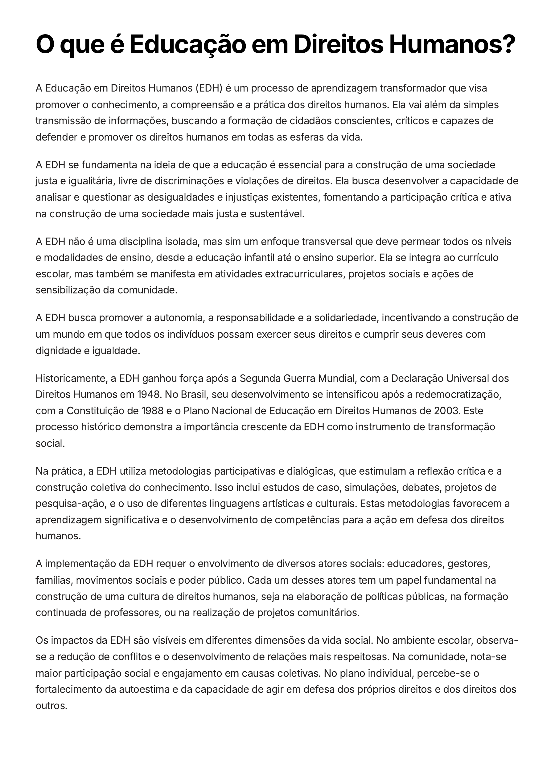 O que é Educação em Direitos Humanos? A Educação em Direitos Humanos (EDH) é um processo de aprendizagem transformador que visa promover o conhecimento, a compreensão e a prática dos direitos humanos. Ela vai além da simples transmissão de informações, buscando a formação de cidadãos conscientes, críticos e capazes de defender e promover os direitos humanos em todas as esferas da vida. A EDH se fundamenta na ideia de que a educação é essencial para a construção de uma sociedade justa e igualitária, livre de discriminações e violações de direitos. Ela busca desenvolver a capacidade de analisar e questionar as desigualdades e injustiças existentes, fomentando a participação crítica e ativa na construção de uma sociedade mais justa e sustentável. A EDH não é uma disciplina isolada, mas sim um enfoque transversal que deve permear todos os níveis e modalidades de ensino, desde a educação infantil até o ensino superior. Ela se integra ao currículo escolar, mas também se manifesta em atividades extracurriculares, projetos sociais e ações de sensibilização da comunidade. A EDH busca promover a autonomia, a responsabilidade e a solidariedade, incentivando a construção de um mundo em que todos os indivíduos possam exercer seus direitos e cumprir seus deveres com dignidade e igualdade. Historicamente, a EDH ganhou força após a Segunda Guerra Mundial, com a Declaração Universal dos Direitos Humanos em 1948. No Brasil, seu desenvolvimento se intensificou após a redemocratização, com a Constituição de 1988 e o Plano Nacional de Educação em Direitos Humanos de 2003. Este processo histórico demonstra a importância crescente da EDH como instrumento de transformação social. Na prática, a EDH utiliza metodologias participativas e dialógicas, que estimulam a reflexão crítica e a construção coletiva do conhecimento. Isso inclui estudos de caso, simulações, debates, projetos de pesquisa-ação, e o uso de diferentes linguagens artísticas e culturais. Estas metodologias favorecem a aprendizagem significativa e o desenvolvimento de competências para a ação em defesa dos direitos humanos. A implementação da EDH requer o envolvimento de diversos atores sociais: educadores, gestores, famílias, movimentos sociais e poder público. Cada um desses atores tem um papel fundamental na construção de uma cultura de direitos humanos, seja na elaboração de políticas públicas, na formação continuada de professores, ou na realização de projetos comunitários. Os impactos da EDH são visíveis em diferentes dimensões da vida social. No ambiente escolar, observa- se a redução de conflitos e o desenvolvimento de relações mais respeitosas. Na comunidade, nota-se maior participação social e engajamento em causas coletivas. No plano individual, percebe-se o fortalecimento da autoestima e da capacidade de agir em defesa dos próprios direitos e dos direitos dos outros.