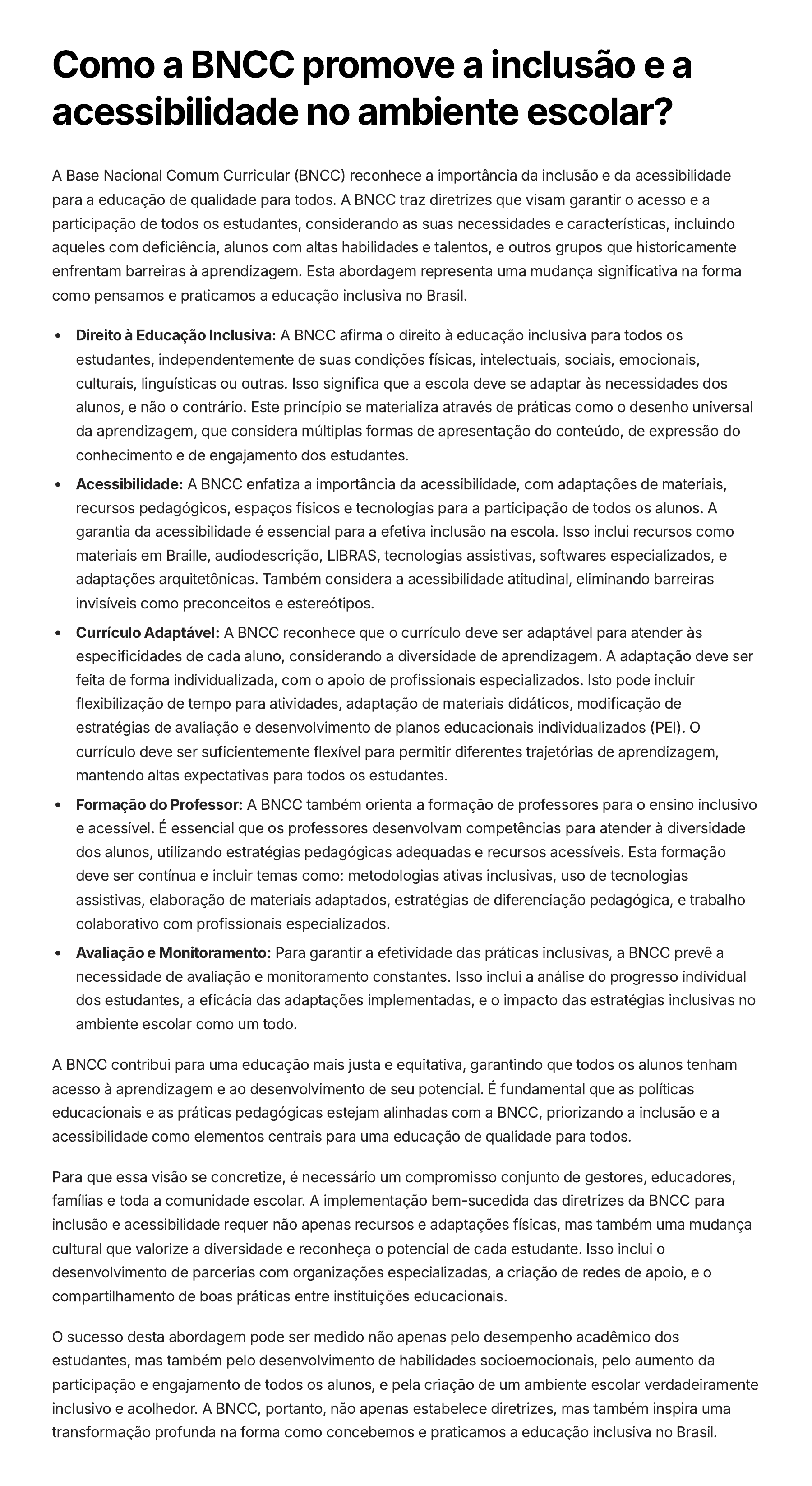 Como a BNCC promove a inclusão e a acessibilidade no ambiente escolar? A Base Nacional Comum Curricular (BNCC) reconhece a importância da inclusão e da acessibilidade para a educação de qualidade para todos. A BNCC traz diretrizes que visam garantir o acesso e a participação de todos os estudantes, considerando as suas necessidades e características, incluindo aqueles com deficiência, alunos com altas habilidades e talentos, e outros grupos que historicamente enfrentam barreiras à aprendizagem. Esta abordagem representa uma mudança significativa na forma como pensamos e praticamos a educação inclusiva no Brasil. Direito à Educação Inclusiva: A BNCC afirma o direito à educação inclusiva para todos os estudantes, independentemente de suas condições físicas, intelectuais, sociais, emocionais, culturais, linguísticas ou outras. Isso significa que a escola deve se adaptar às necessidades dos alunos, e não o contrário. Este princípio se materializa através de práticas como o desenho universal da aprendizagem, que considera múltiplas formas de apresentação do conteúdo, de expressão do conhecimento e de engajamento dos estudantes. Acessibilidade: A BNCC enfatiza a importância da acessibilidade, com adaptações de materiais, recursos pedagógicos, espaços físicos e tecnologias para a participação de todos os alunos. A garantia da acessibilidade é essencial para a efetiva inclusão na escola. Isso inclui recursos como materiais em Braille, audiodescrição, LIBRAS, tecnologias assistivas, softwares especializados, e adaptações arquitetônicas. Também considera a acessibilidade atitudinal, eliminando barreiras invisíveis como preconceitos e estereótipos. Currículo Adaptável: A BNCC reconhece que o currículo deve ser adaptável para atender às especificidades de cada aluno, considerando a diversidade de aprendizagem. A adaptação deve ser feita de forma individualizada, com o apoio de profissionais especializados. Isto pode incluir flexibilização de tempo para atividades, adaptação de materiais didáticos, modificação de estratégias de avaliação e desenvolvimento de planos educacionais individualizados (PEI). O currículo deve ser suficientemente flexível para permitir diferentes trajetórias de aprendizagem, mantendo altas expectativas para todos os estudantes. Formação do Professor: A BNCC também orienta a formação de professores para o ensino inclusivo e acessível. É essencial que os professores desenvolvam competências para atender à diversidade dos alunos, utilizando estratégias pedagógicas adequadas e recursos acessíveis. Esta formação deve ser contínua e incluir temas como: metodologias ativas inclusivas, uso de tecnologias assistivas, elaboração de materiais adaptados, estratégias de diferenciação pedagógica, e trabalho colaborativo com profissionais especializados. Avaliação e Monitoramento: Para garantir a efetividade das práticas inclusivas, a BNCC prevê a necessidade de avaliação e monitoramento constantes. Isso inclui a análise do progresso individual dos estudantes, a eficácia das adaptações implementadas, e o impacto das estratégias inclusivas no ambiente escolar como um todo. A BNCC contribui para uma educação mais justa e equitativa, garantindo que todos os alunos tenham acesso à aprendizagem e ao desenvolvimento de seu potencial. É fundamental que as políticas educacionais e as práticas pedagógicas estejam alinhadas com a BNCC, priorizando a inclusão e a acessibilidade como elementos centrais para uma educação de qualidade para todos. Para que essa visão se concretize, é necessário um compromisso conjunto de gestores, educadores, famílias e toda a comunidade escolar. A implementação bem-sucedida das diretrizes da BNCC para inclusão e acessibilidade requer não apenas recursos e adaptações físicas, mas também uma mudança cultural que valorize a diversidade e reconheça o potencial de cada estudante. Isso inclui o desenvolvimento de parcerias com organizações especializadas, a criação de redes de apoio, e o compartilhamento de boas práticas entre instituições educacionais. O sucesso desta abordagem pode ser medido não apenas pelo desempenho acadêmico dos estudantes, mas também pelo desenvolvimento de habilidades socioemocionais, pelo aumento da participação e engajamento de todos os alunos, e pela criação de um ambiente escolar verdadeiramente inclusivo e acolhedor. A BNCC, portanto, não apenas estabelece diretrizes, mas também inspira uma transformação profunda na forma como concebemos e praticamos a educação inclusiva no Brasil.