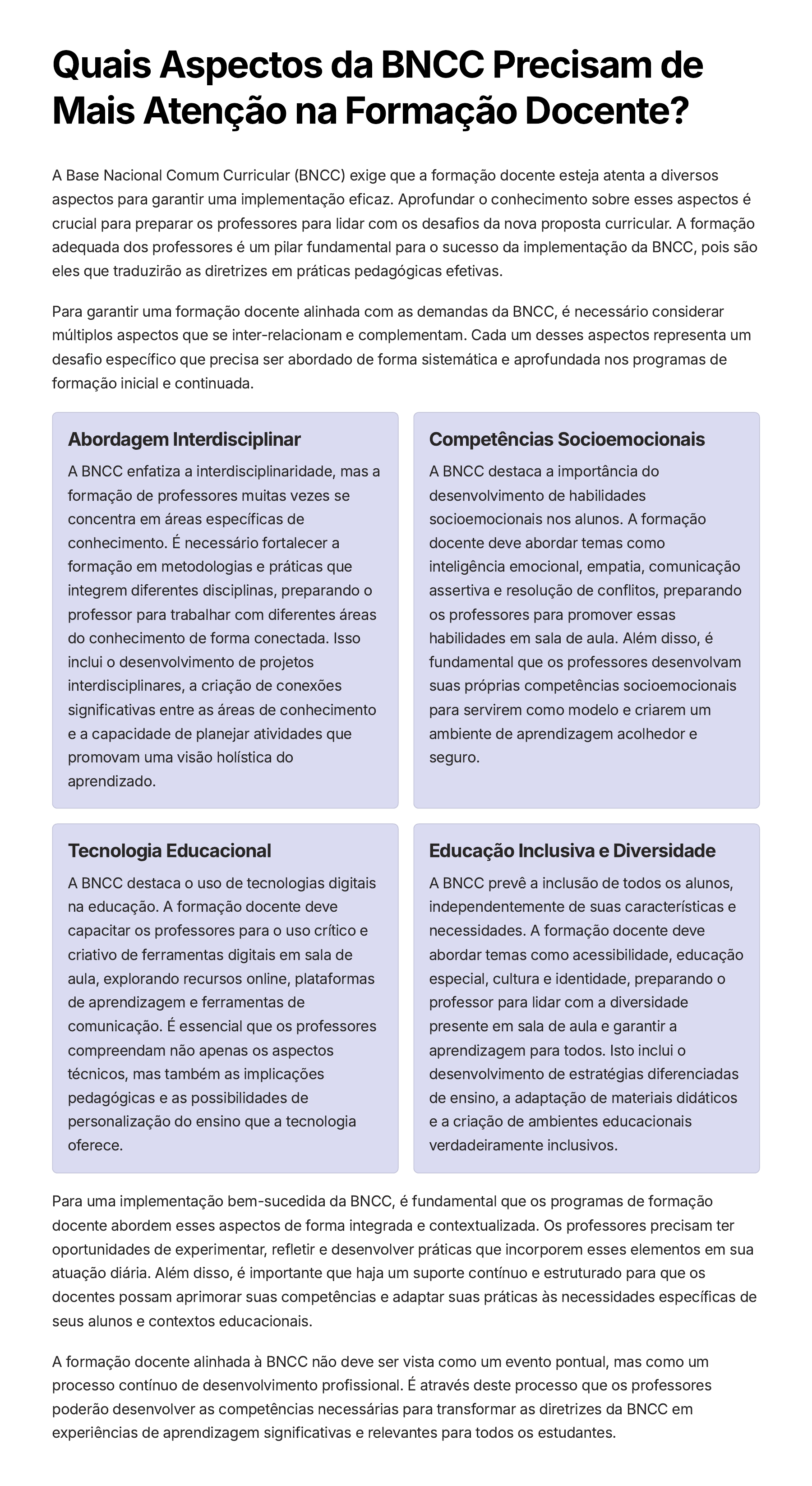 Quais Aspectos da BNCC Precisam de Mais Atenção na Formação Docente? A Base Nacional Comum Curricular (BNCC) exige que a formação docente esteja atenta a diversos aspectos para garantir uma implementação eficaz. Aprofundar o conhecimento sobre esses aspectos é crucial para preparar os professores para lidar com os desafios da nova proposta curricular. A formação adequada dos professores é um pilar fundamental para o sucesso da implementação da BNCC, pois são eles que traduzirão as diretrizes em práticas pedagógicas efetivas. Para garantir uma formação docente alinhada com as demandas da BNCC, é necessário considerar múltiplos aspectos que se inter-relacionam e complementam. Cada um desses aspectos representa um desafio específico que precisa ser abordado de forma sistemática e aprofundada nos programas de formação inicial e continuada. Abordagem Interdisciplinar A BNCC enfatiza a interdisciplinaridade, mas a formação de professores muitas vezes se concentra em áreas específicas de conhecimento. É necessário fortalecer a formação em metodologias e práticas que integrem diferentes disciplinas, preparando o professor para trabalhar com diferentes áreas do conhecimento de forma conectada. Isso inclui o desenvolvimento de projetos interdisciplinares, a criação de conexões significativas entre as áreas de conhecimento e a capacidade de planejar atividades que promovam uma visão holística do aprendizado. Competências Socioemocionais A BNCC destaca a importância do desenvolvimento de habilidades socioemocionais nos alunos. A formação docente deve abordar temas como inteligência emocional, empatia, comunicação assertiva e resolução de conflitos, preparando os professores para promover essas habilidades em sala de aula. Além disso, é fundamental que os professores desenvolvam suas próprias competências socioemocionais para servirem como modelo e criarem um ambiente de aprendizagem acolhedor e seguro. Tecnologia Educacional A BNCC destaca o uso de tecnologias digitais na educação. A formação docente deve capacitar os professores para o uso crítico e criativo de ferramentas digitais em sala de aula, explorando recursos online, plataformas de aprendizagem e ferramentas de comunicação. É essencial que os professores compreendam não apenas os aspectos técnicos, mas também as implicações pedagógicas e as possibilidades de personalização do ensino que a tecnologia oferece. Educação Inclusiva e Diversidade A BNCC prevê a inclusão de todos os alunos, independentemente de suas características e necessidades. A formação docente deve abordar temas como acessibilidade, educação especial, cultura e identidade, preparando o professor para lidar com a diversidade presente em sala de aula e garantir a aprendizagem para todos. Isto inclui o desenvolvimento de estratégias diferenciadas de ensino, a adaptação de materiais didáticos e a criação de ambientes educacionais verdadeiramente inclusivos. Para uma implementação bem-sucedida da BNCC, é fundamental que os programas de formação docente abordem esses aspectos de forma integrada e contextualizada. Os professores precisam ter oportunidades de experimentar, refletir e desenvolver práticas que incorporem esses elementos em sua atuação diária. Além disso, é importante que haja um suporte contínuo e estruturado para que os docentes possam aprimorar suas competências e adaptar suas práticas às necessidades específicas de seus alunos e contextos educacionais. A formação docente alinhada à BNCC não deve ser vista como um evento pontual, mas como um processo contínuo de desenvolvimento profissional. É através deste processo que os professores poderão desenvolver as competências necessárias para transformar as diretrizes da BNCC em experiências de aprendizagem significativas e relevantes para todos os estudantes.