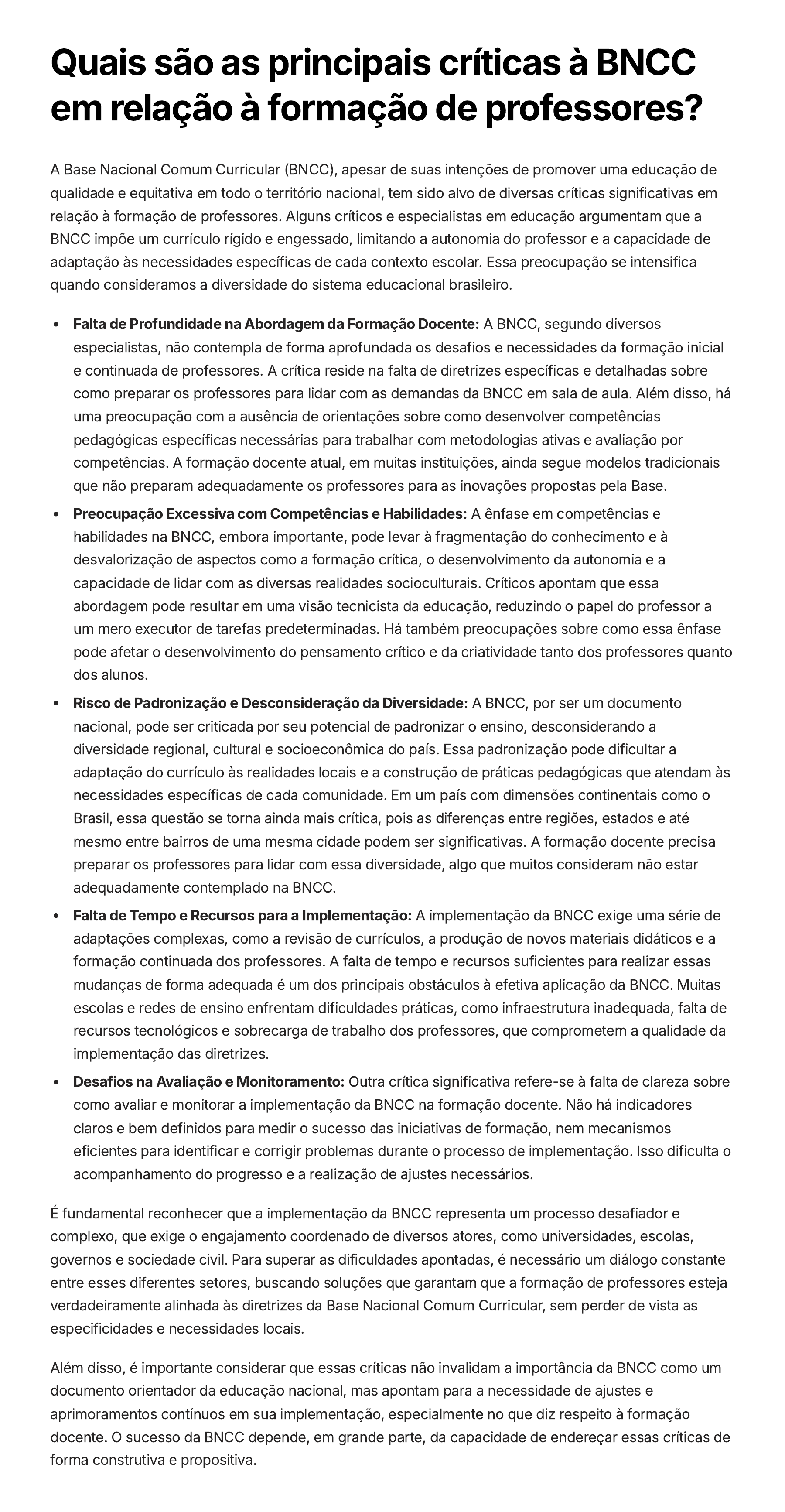 Quais são as principais críticas à BNCC em relação à formação de professores? A Base Nacional Comum Curricular (BNCC), apesar de suas intenções de promover uma educação de qualidade e equitativa em todo o território nacional, tem sido alvo de diversas críticas significativas em relação à formação de professores. Alguns críticos e especialistas em educação argumentam que a BNCC impõe um currículo rígido e engessado, limitando a autonomia do professor e a capacidade de adaptação às necessidades específicas de cada contexto escolar. Essa preocupação se intensifica quando consideramos a diversidade do sistema educacional brasileiro. Falta de Profundidade na Abordagem da Formação Docente: A BNCC, segundo diversos especialistas, não contempla de forma aprofundada os desafios e necessidades da formação inicial e continuada de professores. A crítica reside na falta de diretrizes específicas e detalhadas sobre como preparar os professores para lidar com as demandas da BNCC em sala de aula. Além disso, há uma preocupação com a ausência de orientações sobre como desenvolver competências pedagógicas específicas necessárias para trabalhar com metodologias ativas e avaliação por competências. A formação docente atual, em muitas instituições, ainda segue modelos tradicionais que não preparam adequadamente os professores para as inovações propostas pela Base. Preocupação Excessiva com Competências e Habilidades: A ênfase em competências e habilidades na BNCC, embora importante, pode levar à fragmentação do conhecimento e à desvalorização de aspectos como a formação crítica, o desenvolvimento da autonomia e a capacidade de lidar com as diversas realidades socioculturais. Críticos apontam que essa abordagem pode resultar em uma visão tecnicista da educação, reduzindo o papel do professor a um mero executor de tarefas predeterminadas. Há também preocupações sobre como essa ênfase pode afetar o desenvolvimento do pensamento crítico e da criatividade tanto dos professores quanto dos alunos. Risco de Padronização e Desconsideração da Diversidade: A BNCC, por ser um documento nacional, pode ser criticada por seu potencial de padronizar o ensino, desconsiderando a diversidade regional, cultural e socioeconômica do país. Essa padronização pode dificultar a adaptação do currículo às realidades locais e a construção de práticas pedagógicas que atendam às necessidades específicas de cada comunidade. Em um país com dimensões continentais como o Brasil, essa questão se torna ainda mais crítica, pois as diferenças entre regiões, estados e até mesmo entre bairros de uma mesma cidade podem ser significativas. A formação docente precisa preparar os professores para lidar com essa diversidade, algo que muitos consideram não estar adequadamente contemplado na BNCC. Falta de Tempo e Recursos para a Implementação: A implementação da BNCC exige uma série de adaptações complexas, como a revisão de currículos, a produção de novos materiais didáticos e a formação continuada dos professores. A falta de tempo e recursos suficientes para realizar essas mudanças de forma adequada é um dos principais obstáculos à efetiva aplicação da BNCC. Muitas escolas e redes de ensino enfrentam dificuldades práticas, como infraestrutura inadequada, falta de recursos tecnológicos e sobrecarga de trabalho dos professores, que comprometem a qualidade da implementação das diretrizes. Desafios na Avaliação e Monitoramento: Outra crítica significativa refere-se à falta de clareza sobre como avaliar e monitorar a implementação da BNCC na formação docente. Não há indicadores claros e bem definidos para medir o sucesso das iniciativas de formação, nem mecanismos eficientes para identificar e corrigir problemas durante o processo de implementação. Isso dificulta o acompanhamento do progresso e a realização de ajustes necessários. É fundamental reconhecer que a implementação da BNCC representa um processo desafiador e complexo, que exige o engajamento coordenado de diversos atores, como universidades, escolas, governos e sociedade civil. Para superar as dificuldades apontadas, é necessário um diálogo constante entre esses diferentes setores, buscando soluções que garantam que a formação de professores esteja verdadeiramente alinhada às diretrizes da Base Nacional Comum Curricular, sem perder de vista as especificidades e necessidades locais. Além disso, é importante considerar que essas críticas não invalidam a importância da BNCC como um documento orientador da educação nacional, mas apontam para a necessidade de ajustes e aprimoramentos contínuos em sua implementação, especialmente no que diz respeito à formação docente. O sucesso da BNCC depende, em grande parte, da capacidade de endereçar essas críticas de forma construtiva e propositiva.