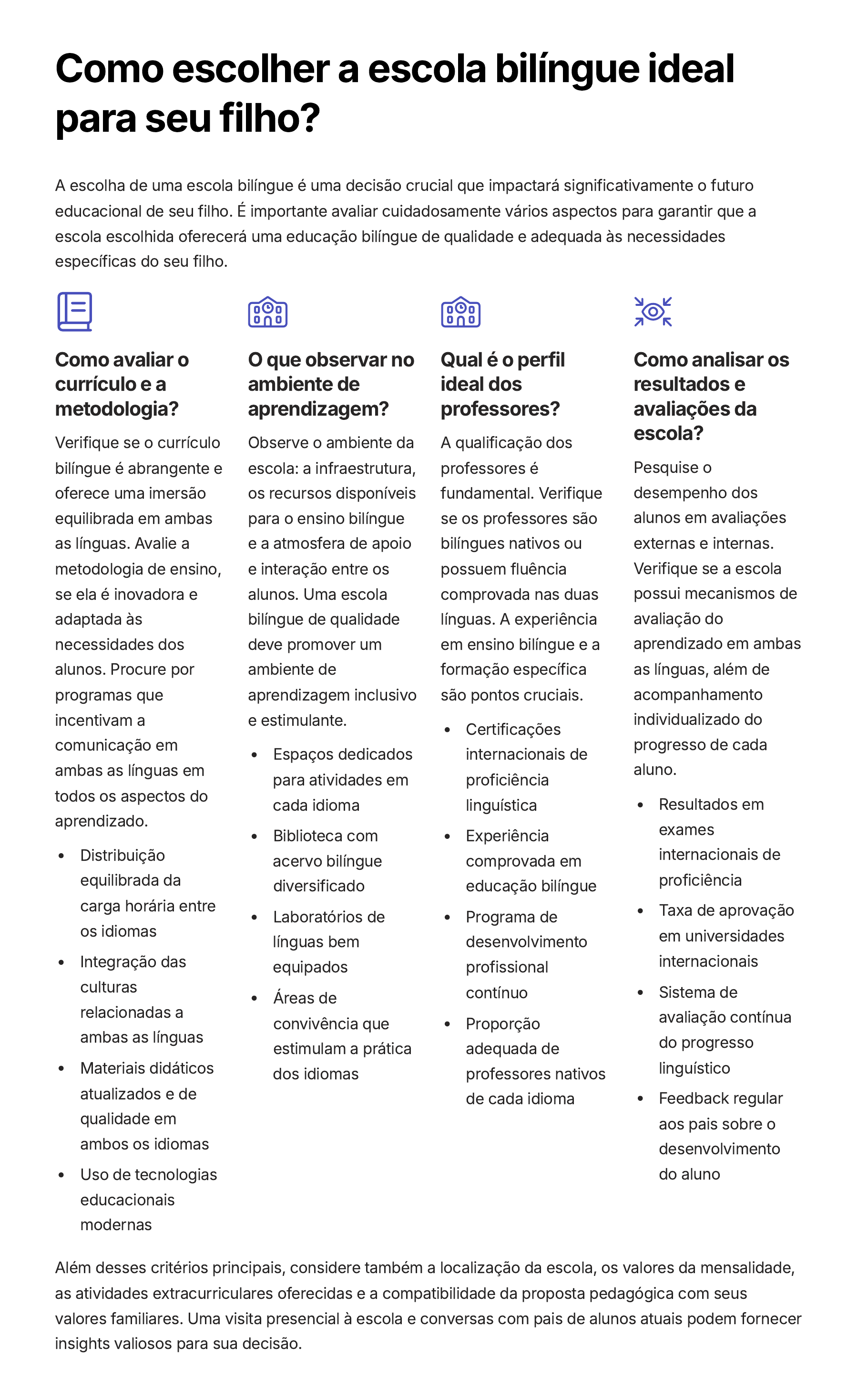 Como escolher a escola bilíngue ideal para seu filho? A escolha de uma escola bilíngue é uma decisão crucial que impactará significativamente o futuro educacional de seu filho. É importante avaliar cuidadosamente vários aspectos para garantir que a escola escolhida oferecerá uma educação bilíngue de qualidade e adequada às necessidades específicas do seu filho. Como avaliar o currículo e a metodologia? Verifique se o currículo bilíngue é abrangente e oferece uma imersão equilibrada em ambas as línguas. Avalie a metodologia de ensino, se ela é inovadora e adaptada às necessidades dos alunos. Procure por programas que incentivam a comunicação em ambas as línguas em todos os aspectos do aprendizado. Distribuição equilibrada da carga horária entre os idiomas Integração das culturas relacionadas a ambas as línguas Materiais didáticos atualizados e de qualidade em ambos os idiomas Uso de tecnologias educacionais modernas O que observar no ambiente de aprendizagem? Observe o ambiente da escola: a infraestrutura, os recursos disponíveis para o ensino bilíngue e a atmosfera de apoio e interação entre os alunos. Uma escola bilíngue de qualidade deve promover um ambiente de aprendizagem inclusivo e estimulante. Espaços dedicados para atividades em cada idioma Biblioteca com acervo bilíngue diversificado Laboratórios de línguas bem equipados Áreas de convivência que estimulam a prática dos idiomas Qual é o perfil ideal dos professores? A qualificação dos professores é fundamental. Verifique se os professores são bilíngues nativos ou possuem fluência comprovada nas duas línguas. A experiência em ensino bilíngue e a formação específica são pontos cruciais. Certificações internacionais de proficiência linguística Experiência comprovada em educação bilíngue Programa de desenvolvimento profissional contínuo Proporção adequada de professores nativos de cada idioma Como analisar os resultados e avaliações da escola? Pesquise o desempenho dos alunos em avaliações externas e internas. Verifique se a escola possui mecanismos de avaliação do aprendizado em ambas as línguas, além de acompanhamento individualizado do progresso de cada aluno. Resultados em exames internacionais de proficiência Taxa de aprovação em universidades internacionais Sistema de avaliação contínua do progresso linguístico Feedback regular aos pais sobre o desenvolvimento do aluno Além desses critérios principais, considere também a localização da escola, os valores da mensalidade, as atividades extracurriculares oferecidas e a compatibilidade da proposta pedagógica com seus valores familiares. Uma visita presencial à escola e conversas com pais de alunos atuais podem fornecer insights valiosos para sua decisão.
