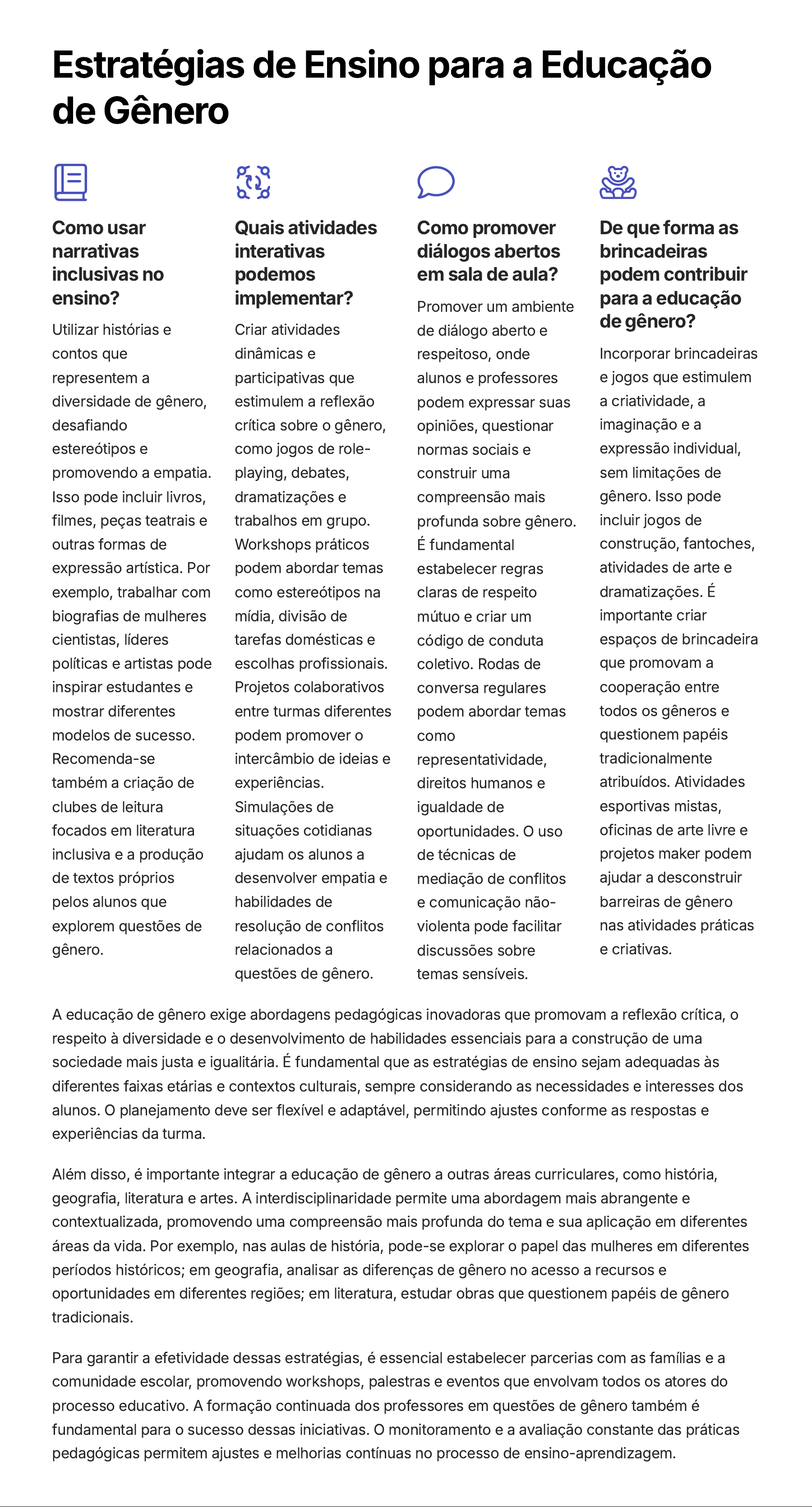 Estratégias de Ensino para a Educação de Gênero Como usar narrativas inclusivas no ensino? Utilizar histórias e contos que representem a diversidade de gênero, desafiando estereótipos e promovendo a empatia. Isso pode incluir livros, filmes, peças teatrais e outras formas de expressão artística. Por exemplo, trabalhar com biografias de mulheres cientistas, líderes políticas e artistas pode inspirar estudantes e mostrar diferentes modelos de sucesso. Recomenda-se também a criação de clubes de leitura focados em literatura inclusiva e a produção de textos próprios pelos alunos que explorem questões de gênero. Quais atividades interativas podemos implementar? Criar atividades dinâmicas e participativas que estimulem a reflexão crítica sobre o gênero, como jogos de role- playing, debates, dramatizações e trabalhos em grupo. Workshops práticos podem abordar temas como estereótipos na mídia, divisão de tarefas domésticas e escolhas profissionais. Projetos colaborativos entre turmas diferentes podem promover o intercâmbio de ideias e experiências. Simulações de situações cotidianas ajudam os alunos a desenvolver empatia e habilidades de resolução de conflitos relacionados a questões de gênero. Como promover diálogos abertos em sala de aula? Promover um ambiente de diálogo aberto e respeitoso, onde alunos e professores podem expressar suas opiniões, questionar normas sociais e construir uma compreensão mais profunda sobre gênero. É fundamental estabelecer regras claras de respeito mútuo e criar um código de conduta coletivo. Rodas de conversa regulares podem abordar temas como representatividade, direitos humanos e igualdade de oportunidades. O uso de técnicas de mediação de conflitos e comunicação não- violenta pode facilitar discussões sobre temas sensíveis. De que forma as brincadeiras podem contribuir para a educação de gênero? Incorporar brincadeiras e jogos que estimulem a criatividade, a imaginação e a expressão individual, sem limitações de gênero. Isso pode incluir jogos de construção, fantoches, atividades de arte e dramatizações. É importante criar espaços de brincadeira que promovam a cooperação entre todos os gêneros e questionem papéis tradicionalmente atribuídos. Atividades esportivas mistas, oficinas de arte livre e projetos maker podem ajudar a desconstruir barreiras de gênero nas atividades práticas e criativas. A educação de gênero exige abordagens pedagógicas inovadoras que promovam a reflexão crítica, o respeito à diversidade e o desenvolvimento de habilidades essenciais para a construção de uma sociedade mais justa e igualitária. É fundamental que as estratégias de ensino sejam adequadas às diferentes faixas etárias e contextos culturais, sempre considerando as necessidades e interesses dos alunos. O planejamento deve ser flexível e adaptável, permitindo ajustes conforme as respostas e experiências da turma. Além disso, é importante integrar a educação de gênero a outras áreas curriculares, como história, geografia, literatura e artes. A interdisciplinaridade permite uma abordagem mais abrangente e contextualizada, promovendo uma compreensão mais profunda do tema e sua aplicação em diferentes áreas da vida. Por exemplo, nas aulas de história, pode-se explorar o papel das mulheres em diferentes períodos históricos; em geografia, analisar as diferenças de gênero no acesso a recursos e oportunidades em diferentes regiões; em literatura, estudar obras que questionem papéis de gênero tradicionais. Para garantir a efetividade dessas estratégias, é essencial estabelecer parcerias com as famílias e a comunidade escolar, promovendo workshops, palestras e eventos que envolvam todos os atores do processo educativo. A formação continuada dos professores em questões de gênero também é fundamental para o sucesso dessas iniciativas. O monitoramento e a avaliação constante das práticas pedagógicas permitem ajustes e melhorias contínuas no processo de ensino-aprendizagem.