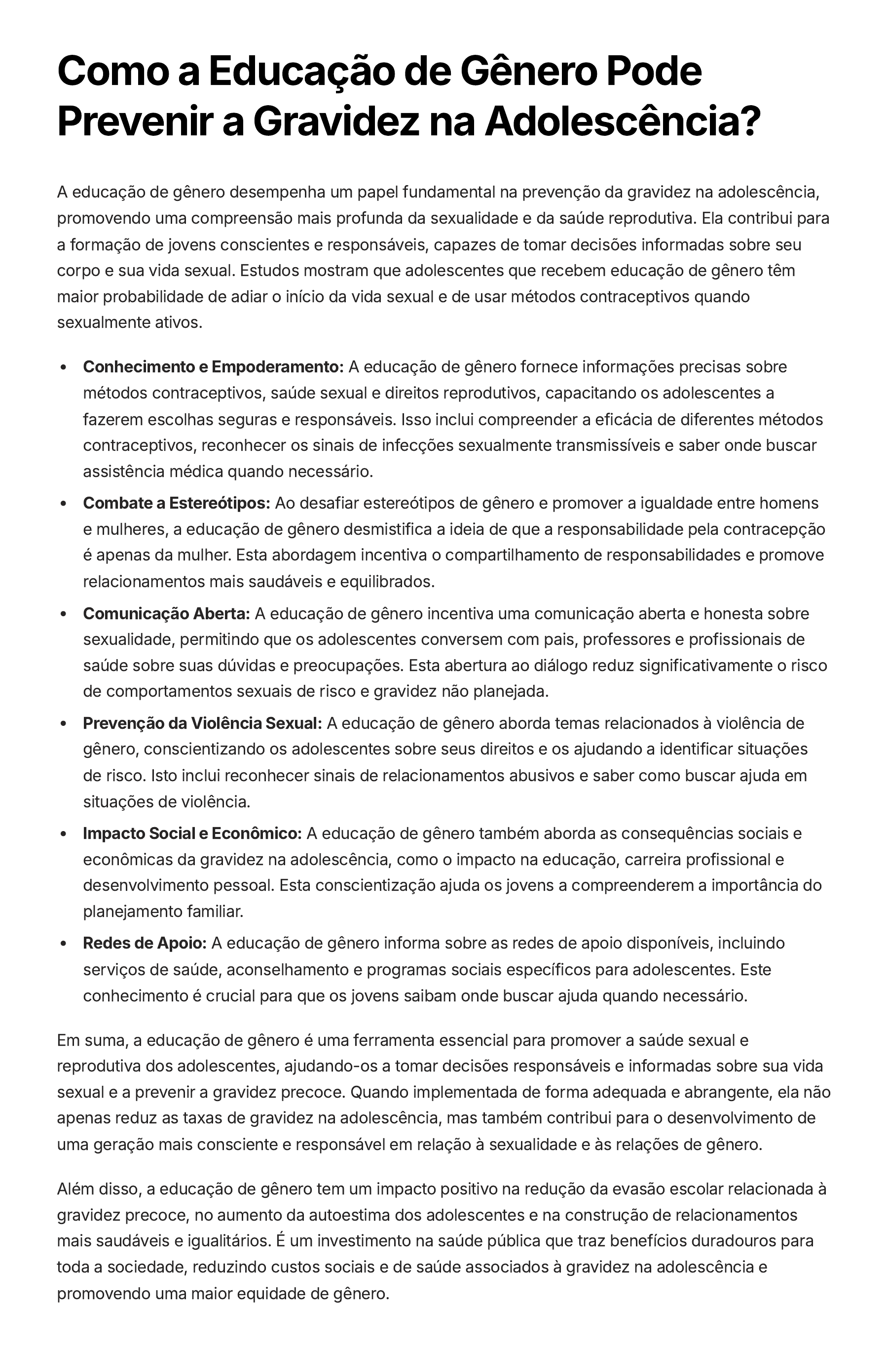 Como a Educação de Gênero Pode Prevenir a Gravidez na Adolescência? A educação de gênero desempenha um papel fundamental na prevenção da gravidez na adolescência, promovendo uma compreensão mais profunda da sexualidade e da saúde reprodutiva. Ela contribui para a formação de jovens conscientes e responsáveis, capazes de tomar decisões informadas sobre seu corpo e sua vida sexual. Estudos mostram que adolescentes que recebem educação de gênero têm maior probabilidade de adiar o início da vida sexual e de usar métodos contraceptivos quando sexualmente ativos. Conhecimento e Empoderamento: A educação de gênero fornece informações precisas sobre métodos contraceptivos, saúde sexual e direitos reprodutivos, capacitando os adolescentes a fazerem escolhas seguras e responsáveis. Isso inclui compreender a eficácia de diferentes métodos contraceptivos, reconhecer os sinais de infecções sexualmente transmissíveis e saber onde buscar assistência médica quando necessário. Combate a Estereótipos: Ao desafiar estereótipos de gênero e promover a igualdade entre homens e mulheres, a educação de gênero desmistifica a ideia de que a responsabilidade pela contracepção é apenas da mulher. Esta abordagem incentiva o compartilhamento de responsabilidades e promove relacionamentos mais saudáveis e equilibrados. Comunicação Aberta: A educação de gênero incentiva uma comunicação aberta e honesta sobre sexualidade, permitindo que os adolescentes conversem com pais, professores e profissionais de saúde sobre suas dúvidas e preocupações. Esta abertura ao diálogo reduz significativamente o risco de comportamentos sexuais de risco e gravidez não planejada. Prevenção da Violência Sexual: A educação de gênero aborda temas relacionados à violência de gênero, conscientizando os adolescentes sobre seus direitos e os ajudando a identificar situações de risco. Isto inclui reconhecer sinais de relacionamentos abusivos e saber como buscar ajuda em situações de violência. Impacto Social e Econômico: A educação de gênero também aborda as consequências sociais e econômicas da gravidez na adolescência, como o impacto na educação, carreira profissional e desenvolvimento pessoal. Esta conscientização ajuda os jovens a compreenderem a importância do planejamento familiar. Redes de Apoio: A educação de gênero informa sobre as redes de apoio disponíveis, incluindo serviços de saúde, aconselhamento e programas sociais específicos para adolescentes. Este conhecimento é crucial para que os jovens saibam onde buscar ajuda quando necessário. Em suma, a educação de gênero é uma ferramenta essencial para promover a saúde sexual e reprodutiva dos adolescentes, ajudando-os a tomar decisões responsáveis e informadas sobre sua vida sexual e a prevenir a gravidez precoce. Quando implementada de forma adequada e abrangente, ela não apenas reduz as taxas de gravidez na adolescência, mas também contribui para o desenvolvimento de uma geração mais consciente e responsável em relação à sexualidade e às relações de gênero. Além disso, a educação de gênero tem um impacto positivo na redução da evasão escolar relacionada à gravidez precoce, no aumento da autoestima dos adolescentes e na construção de relacionamentos mais saudáveis e igualitários. É um investimento na saúde pública que traz benefícios duradouros para toda a sociedade, reduzindo custos sociais e de saúde associados à gravidez na adolescência e promovendo uma maior equidade de gênero.