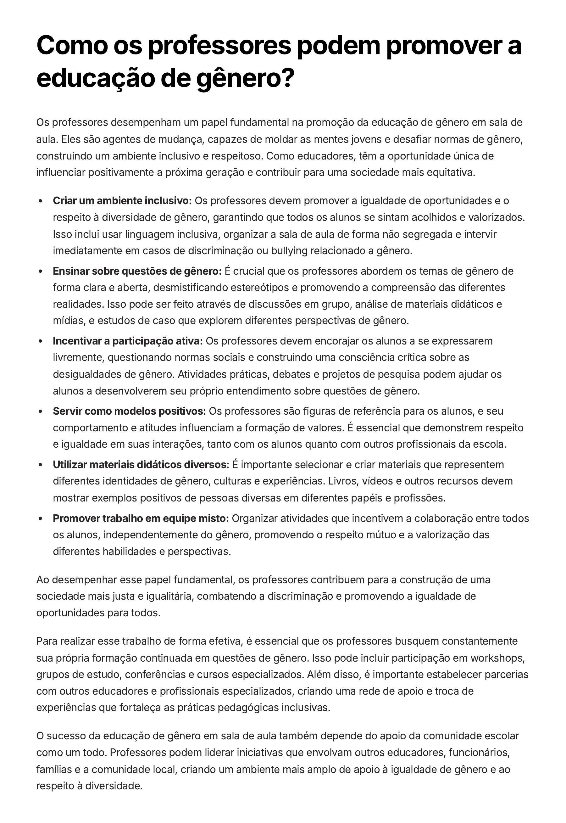 Como os professores podem promover a educação de gênero? Os professores desempenham um papel fundamental na promoção da educação de gênero em sala de aula. Eles são agentes de mudança, capazes de moldar as mentes jovens e desafiar normas de gênero, construindo um ambiente inclusivo e respeitoso. Como educadores, têm a oportunidade única de influenciar positivamente a próxima geração e contribuir para uma sociedade mais equitativa. Criar um ambiente inclusivo: Os professores devem promover a igualdade de oportunidades e o respeito à diversidade de gênero, garantindo que todos os alunos se sintam acolhidos e valorizados. Isso inclui usar linguagem inclusiva, organizar a sala de aula de forma não segregada e intervir imediatamente em casos de discriminação ou bullying relacionado a gênero. Ensinar sobre questões de gênero: É crucial que os professores abordem os temas de gênero de forma clara e aberta, desmistificando estereótipos e promovendo a compreensão das diferentes realidades. Isso pode ser feito através de discussões em grupo, análise de materiais didáticos e mídias, e estudos de caso que explorem diferentes perspectivas de gênero. Incentivar a participação ativa: Os professores devem encorajar os alunos a se expressarem livremente, questionando normas sociais e construindo uma consciência crítica sobre as desigualdades de gênero. Atividades práticas, debates e projetos de pesquisa podem ajudar os alunos a desenvolverem seu próprio entendimento sobre questões de gênero. Servir como modelos positivos: Os professores são figuras de referência para os alunos, e seu comportamento e atitudes influenciam a formação de valores. É essencial que demonstrem respeito e igualdade em suas interações, tanto com os alunos quanto com outros profissionais da escola. Utilizar materiais didáticos diversos: É importante selecionar e criar materiais que representem diferentes identidades de gênero, culturas e experiências. Livros, vídeos e outros recursos devem mostrar exemplos positivos de pessoas diversas em diferentes papéis e profissões. Promover trabalho em equipe misto: Organizar atividades que incentivem a colaboração entre todos os alunos, independentemente do gênero, promovendo o respeito mútuo e a valorização das diferentes habilidades e perspectivas. Ao desempenhar esse papel fundamental, os professores contribuem para a construção de uma sociedade mais justa e igualitária, combatendo a discriminação e promovendo a igualdade de oportunidades para todos. Para realizar esse trabalho de forma efetiva, é essencial que os professores busquem constantemente sua própria formação continuada em questões de gênero. Isso pode incluir participação em workshops, grupos de estudo, conferências e cursos especializados. Além disso, é importante estabelecer parcerias com outros educadores e profissionais especializados, criando uma rede de apoio e troca de experiências que fortaleça as práticas pedagógicas inclusivas. O sucesso da educação de gênero em sala de aula também depende do apoio da comunidade escolar como um todo. Professores podem liderar iniciativas que envolvam outros educadores, funcionários, famílias e a comunidade local, criando um ambiente mais amplo de apoio à igualdade de gênero e ao respeito à diversidade.