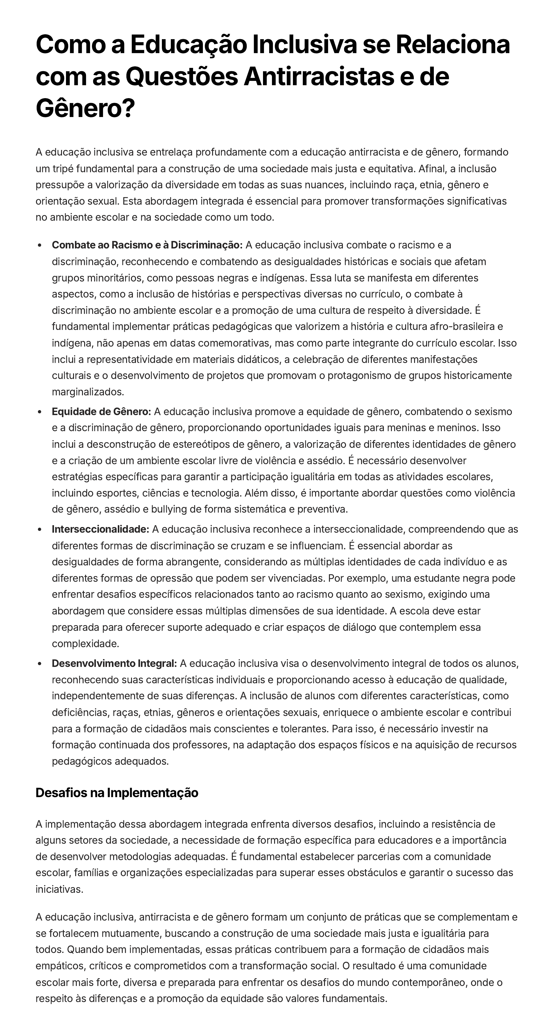 Como a Educação Inclusiva se Relaciona com as Questões Antirracistas e de Gênero? A educação inclusiva se entrelaça profundamente com a educação antirracista e de gênero, formando um tripé fundamental para a construção de uma sociedade mais justa e equitativa. Afinal, a inclusão pressupõe a valorização da diversidade em todas as suas nuances, incluindo raça, etnia, gênero e orientação sexual. Esta abordagem integrada é essencial para promover transformações significativas no ambiente escolar e na sociedade como um todo. Combate ao Racismo e à Discriminação: A educação inclusiva combate o racismo e a discriminação, reconhecendo e combatendo as desigualdades históricas e sociais que afetam grupos minoritários, como pessoas negras e indígenas. Essa luta se manifesta em diferentes aspectos, como a inclusão de histórias e perspectivas diversas no currículo, o combate à discriminação no ambiente escolar e a promoção de uma cultura de respeito à diversidade. É fundamental implementar práticas pedagógicas que valorizem a história e cultura afro-brasileira e indígena, não apenas em datas comemorativas, mas como parte integrante do currículo escolar. Isso inclui a representatividade em materiais didáticos, a celebração de diferentes manifestações culturais e o desenvolvimento de projetos que promovam o protagonismo de grupos historicamente marginalizados. Equidade de Gênero: A educação inclusiva promove a equidade de gênero, combatendo o sexismo e a discriminação de gênero, proporcionando oportunidades iguais para meninas e meninos. Isso inclui a desconstrução de estereótipos de gênero, a valorização de diferentes identidades de gênero e a criação de um ambiente escolar livre de violência e assédio. É necessário desenvolver estratégias específicas para garantir a participação igualitária em todas as atividades escolares, incluindo esportes, ciências e tecnologia. Além disso, é importante abordar questões como violência de gênero, assédio e bullying de forma sistemática e preventiva. Interseccionalidade: A educação inclusiva reconhece a interseccionalidade, compreendendo que as diferentes formas de discriminação se cruzam e se influenciam. É essencial abordar as desigualdades de forma abrangente, considerando as múltiplas identidades de cada indivíduo e as diferentes formas de opressão que podem ser vivenciadas. Por exemplo, uma estudante negra pode enfrentar desafios específicos relacionados tanto ao racismo quanto ao sexismo, exigindo uma abordagem que considere essas múltiplas dimensões de sua identidade. A escola deve estar preparada para oferecer suporte adequado e criar espaços de diálogo que contemplem essa complexidade. Desenvolvimento Integral: A educação inclusiva visa o desenvolvimento integral de todos os alunos, reconhecendo suas características individuais e proporcionando acesso à educação de qualidade, independentemente de suas diferenças. A inclusão de alunos com diferentes características, como deficiências, raças, etnias, gêneros e orientações sexuais, enriquece o ambiente escolar e contribui para a formação de cidadãos mais conscientes e tolerantes. Para isso, é necessário investir na formação continuada dos professores, na adaptação dos espaços físicos e na aquisição de recursos pedagógicos adequados. Desafios na Implementação A implementação dessa abordagem integrada enfrenta diversos desafios, incluindo a resistência de alguns setores da sociedade, a necessidade de formação específica para educadores e a importância de desenvolver metodologias adequadas. É fundamental estabelecer parcerias com a comunidade escolar, famílias e organizações especializadas para superar esses obstáculos e garantir o sucesso das iniciativas. A educação inclusiva, antirracista e de gênero formam um conjunto de práticas que se complementam e se fortalecem mutuamente, buscando a construção de uma sociedade mais justa e igualitária para todos. Quando bem implementadas, essas práticas contribuem para a formação de cidadãos mais empáticos, críticos e comprometidos com a transformação social. O resultado é uma comunidade escolar mais forte, diversa e preparada para enfrentar os desafios do mundo contemporâneo, onde o respeito às diferenças e a promoção da equidade são valores fundamentais.
